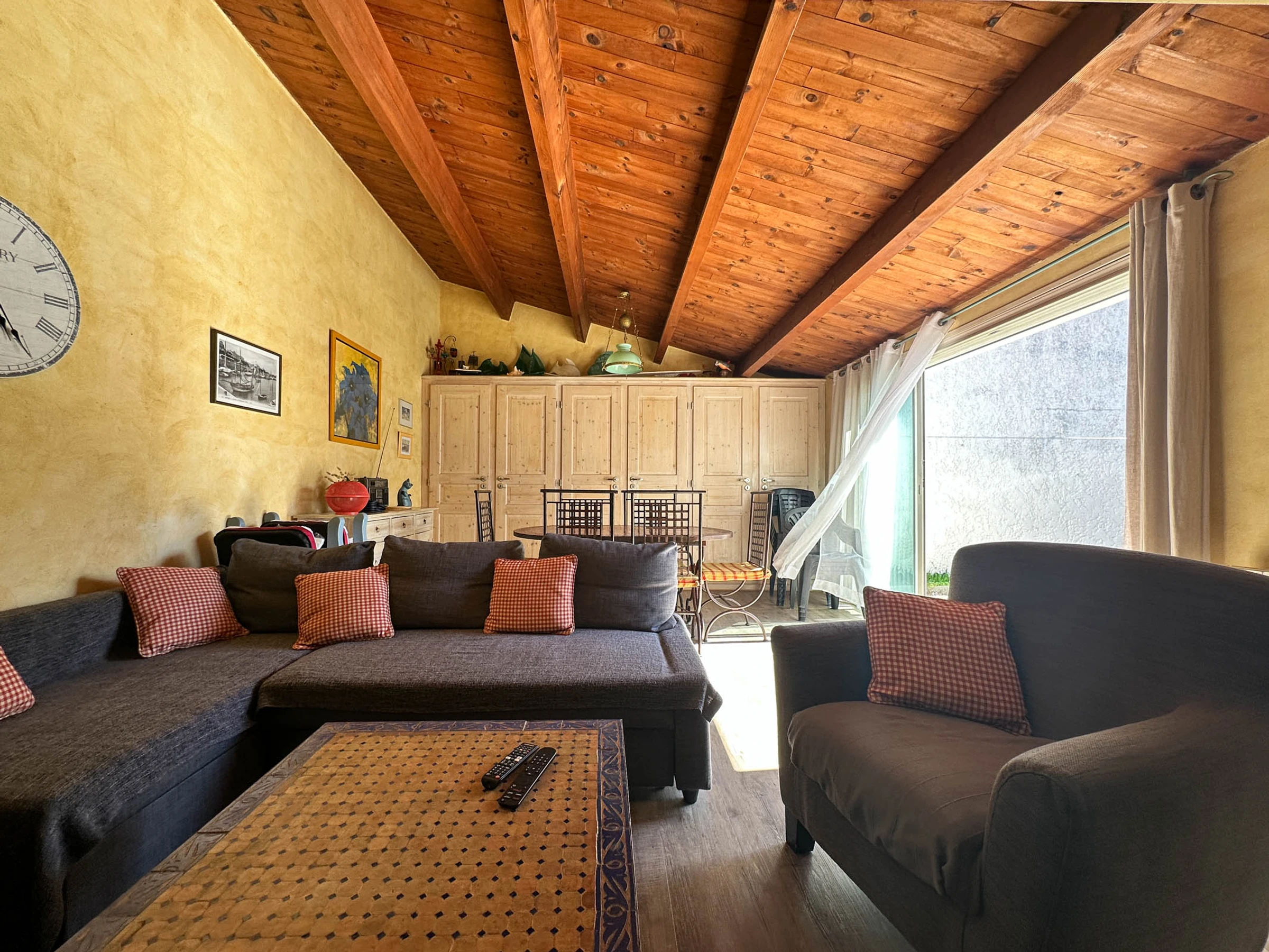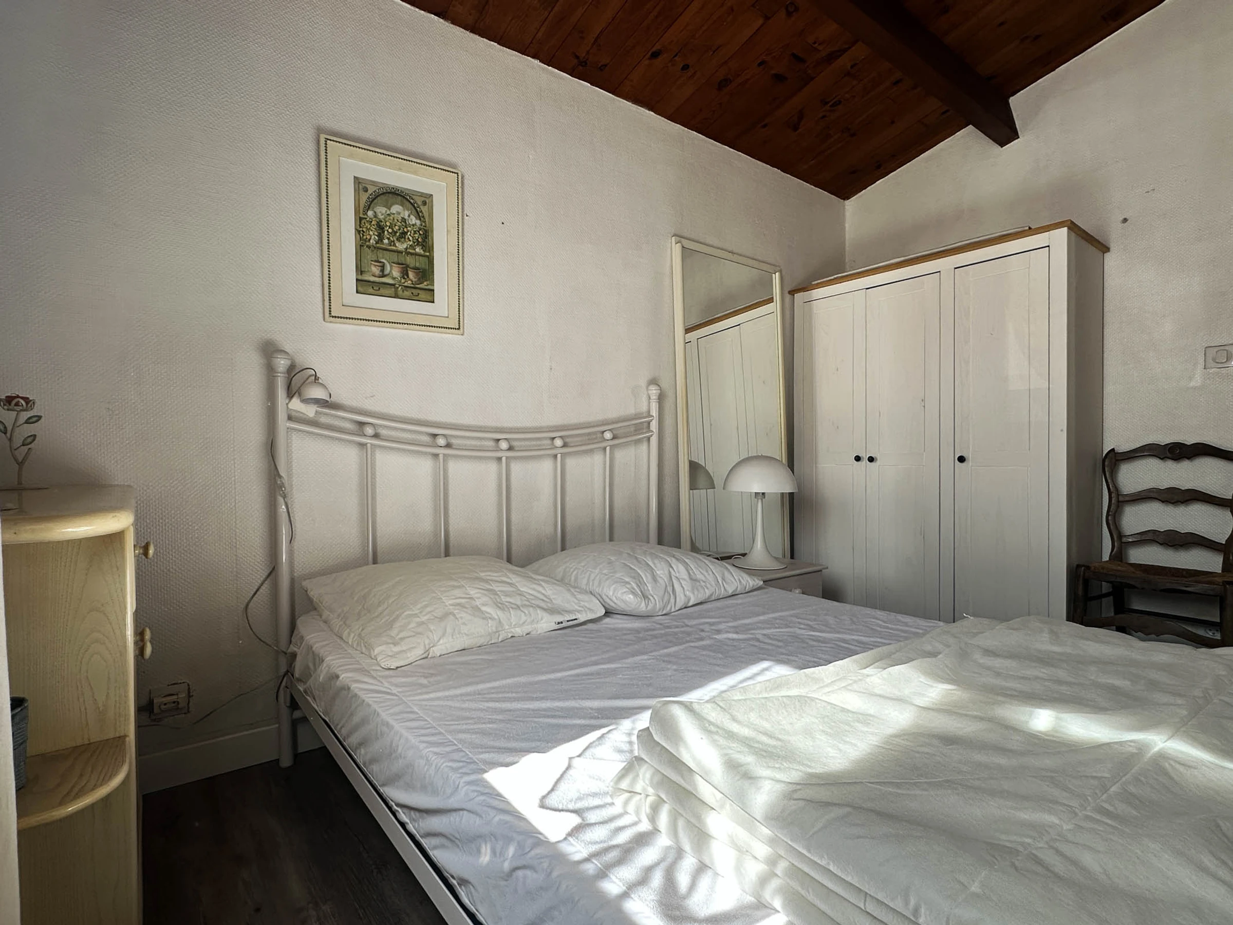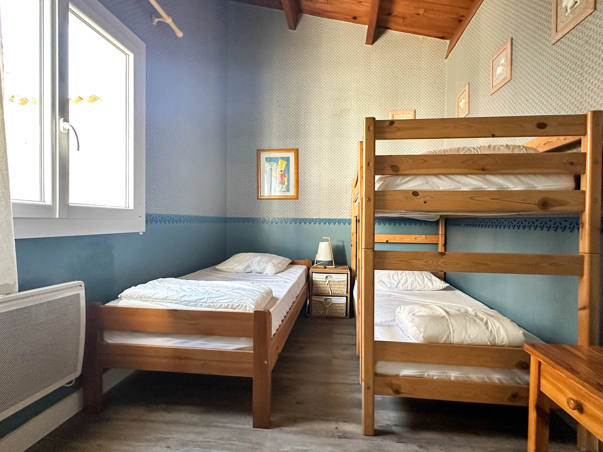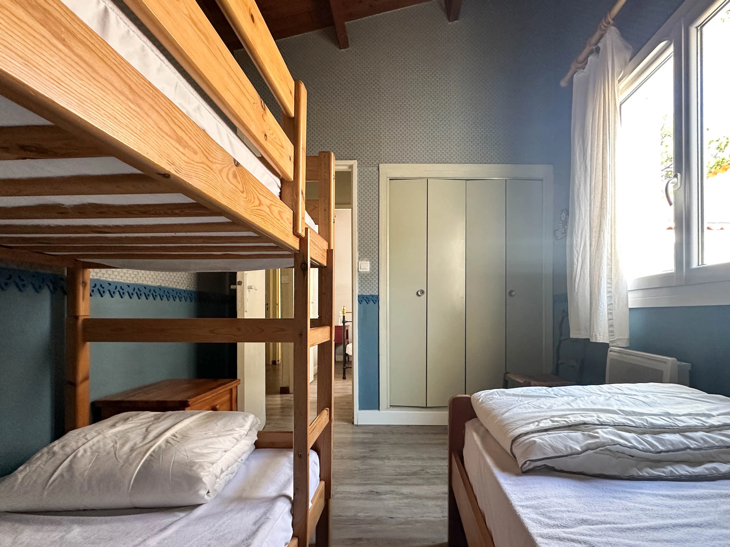 Séjour avec canapé et TV ouvrant sur patio avec terrasse - Exposition Sud-Ouest - Chambre 1 lit de 140 cm Placard penderie - Chambre 1 lit de 140 cm, armoire - Chambre 3 lits de 90 cm dont 2 superposés, placard - Salle d'eau avec douche à l'italienne - wc indépendant