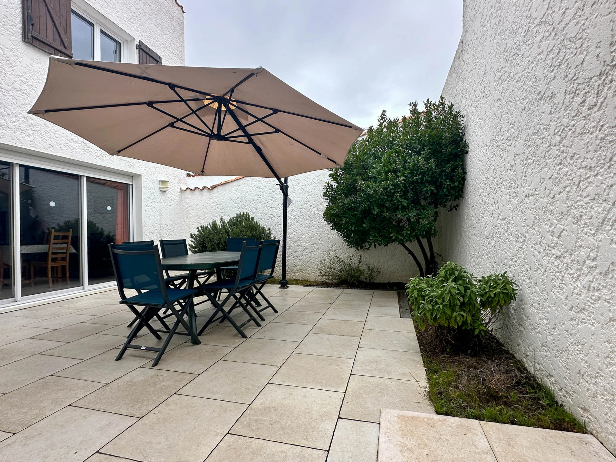 Patio couvert avec salle d'eau et WC suspendu idéale pour les retours de plage, et partie découverte carrelée avec mobilier de jardin, parasol déporté, barbecue charbon.