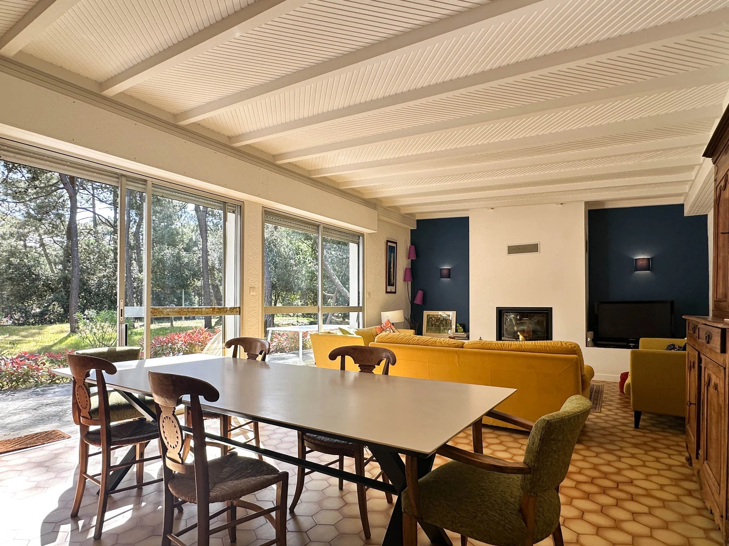 Séjour lumineux composé d'un espace repas avec table et chaises et d'un coin salon avec canapés et télévision, larges baies vitrées ouvrant sur extérieur avec terrasse et jardin, vue dégagée sur les pins.