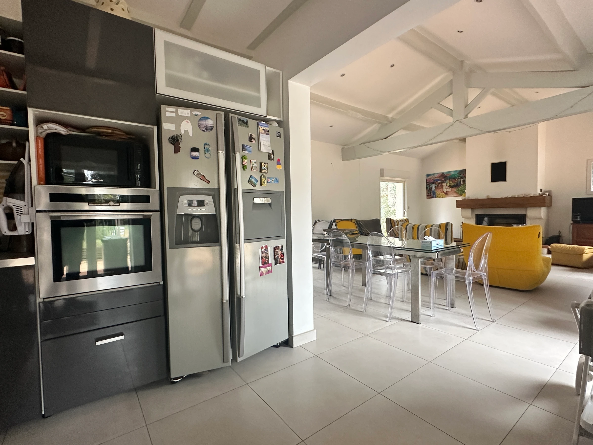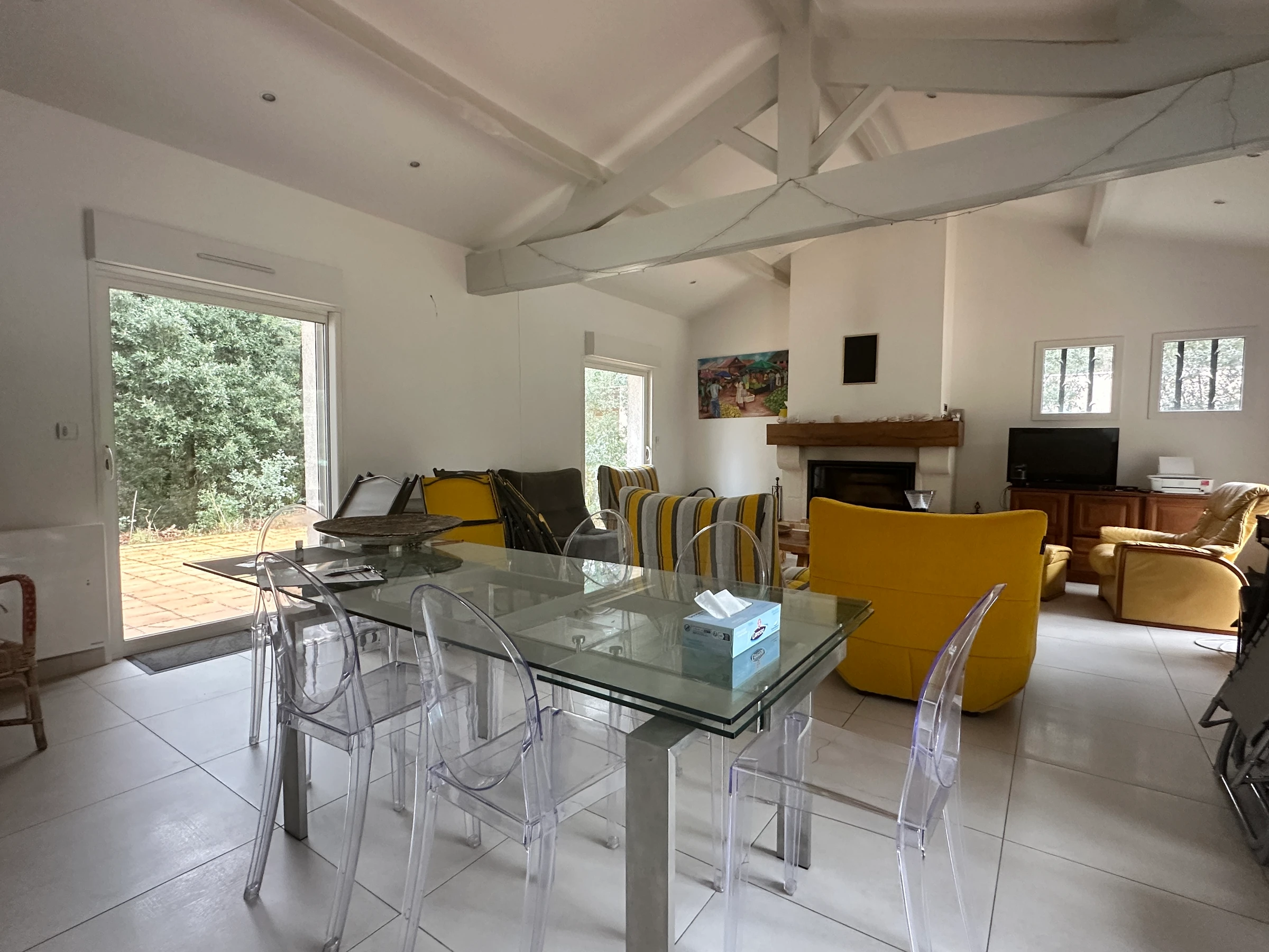 Entrée menant à une pièce de vie traversante composée d'un séjour avec TV, canapés, accès internet, avec coin repas et cuisine ouverte aménagée : four, plaques induction, micro-ondes, réfrigérateur type américain, grille-pain, bouilloire, cafetière (filtre + nespresso).