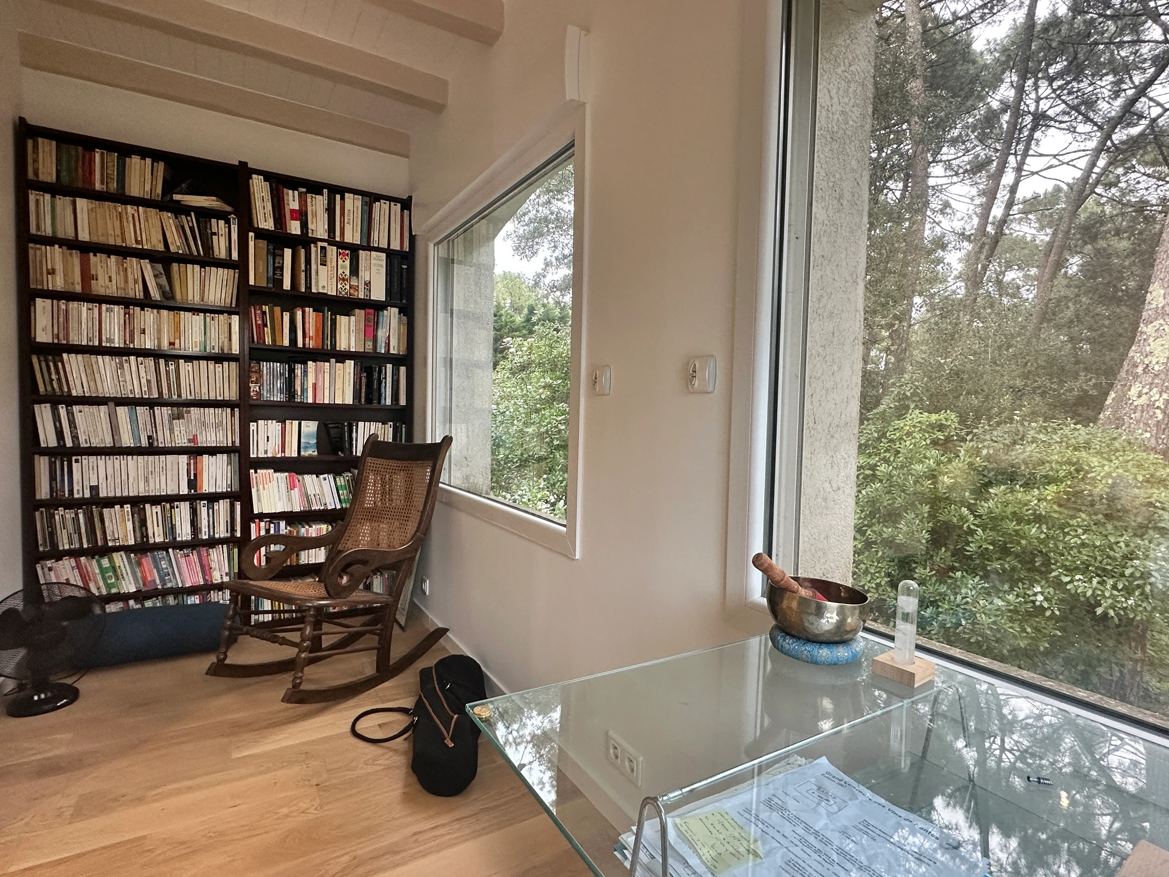 1 suite avec 1 lit de 160, placard double, coin bureau avec vue sur la forêt, salle d'eau avec baignoire et douche