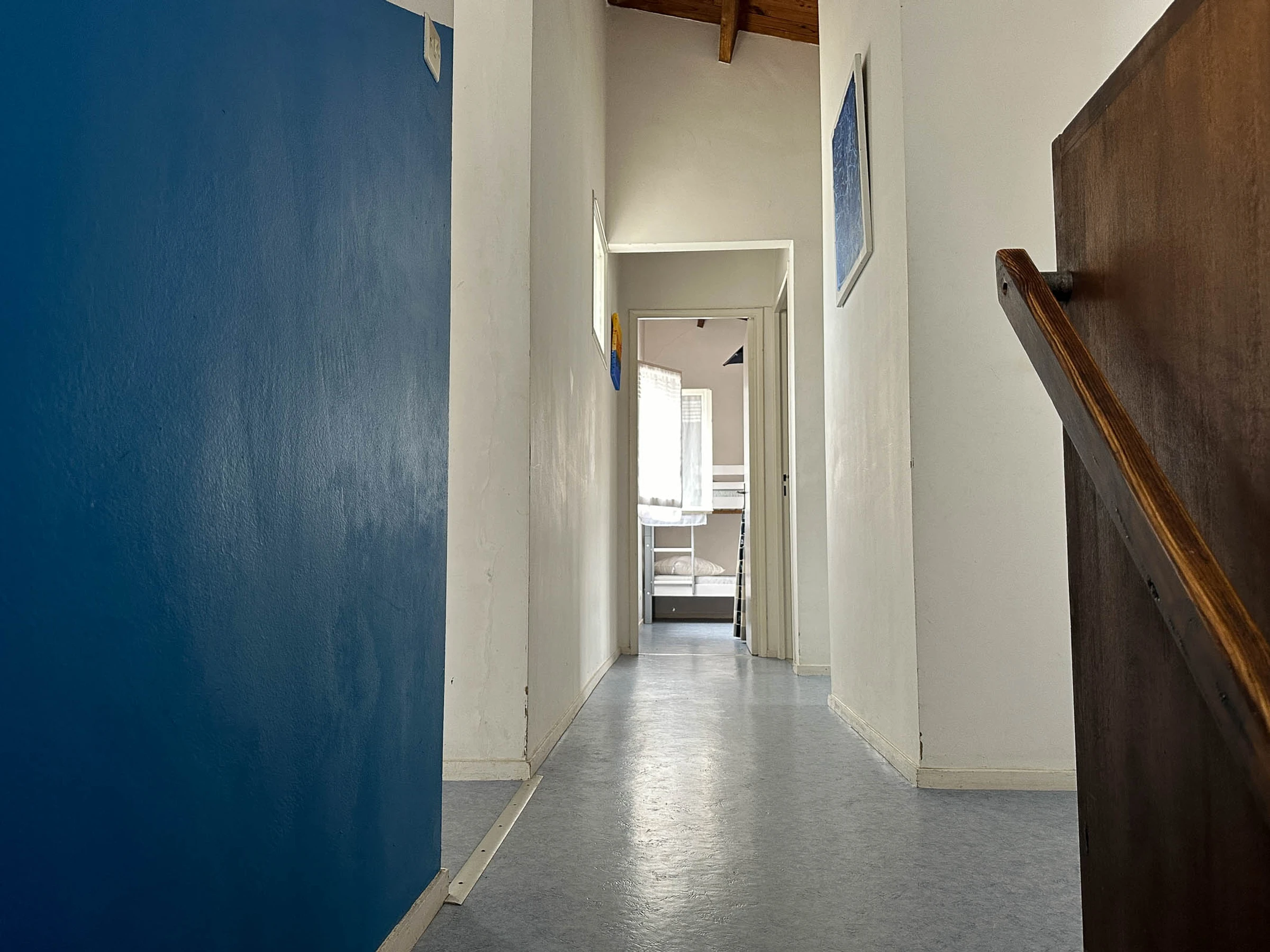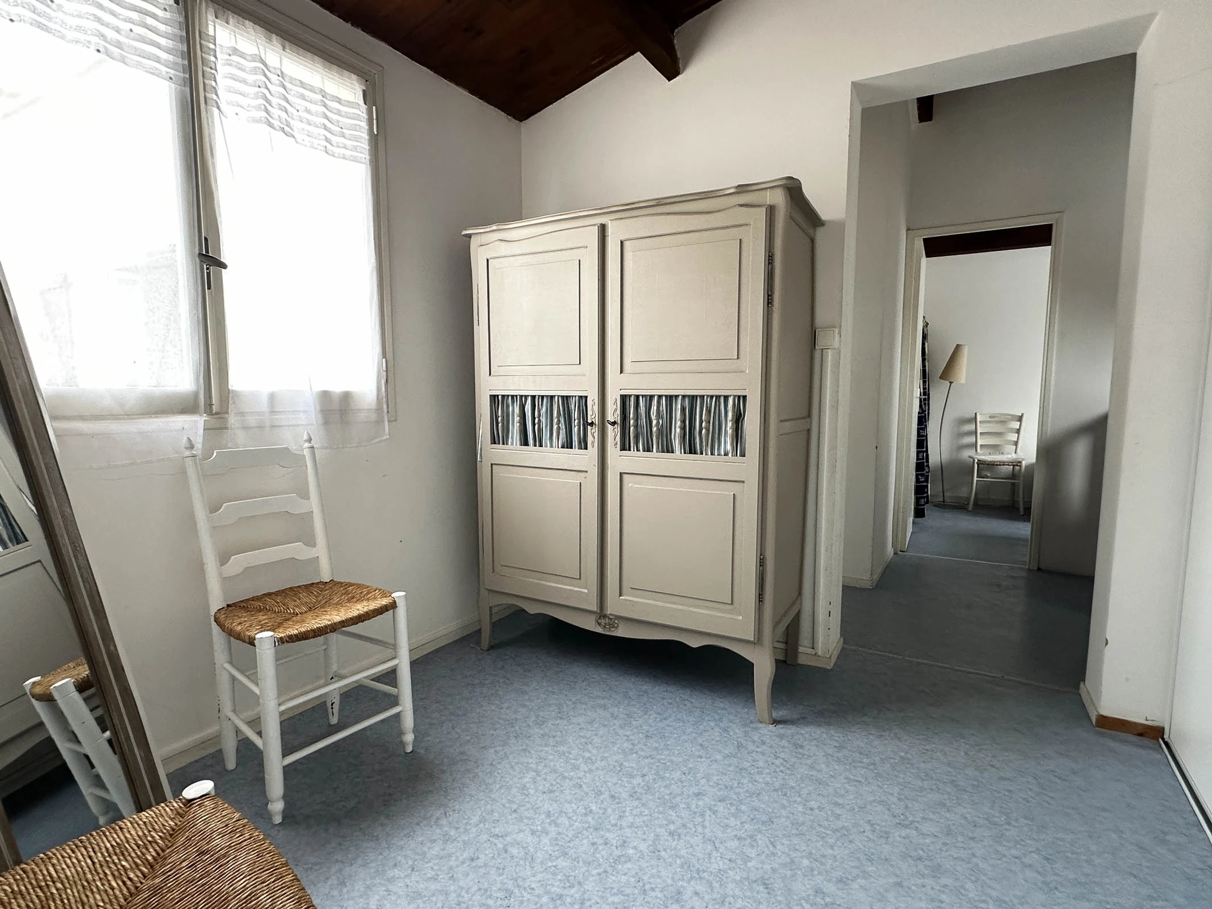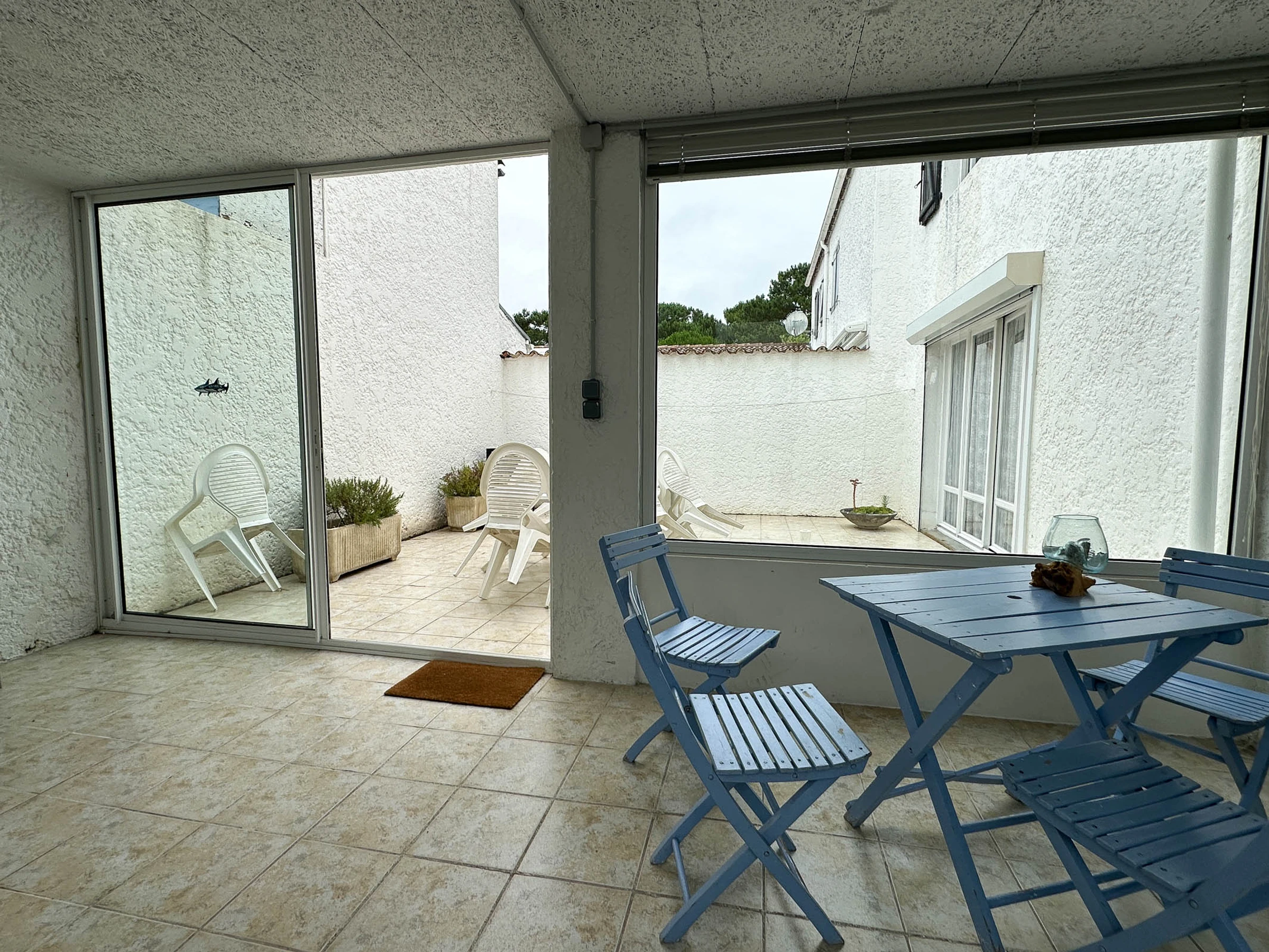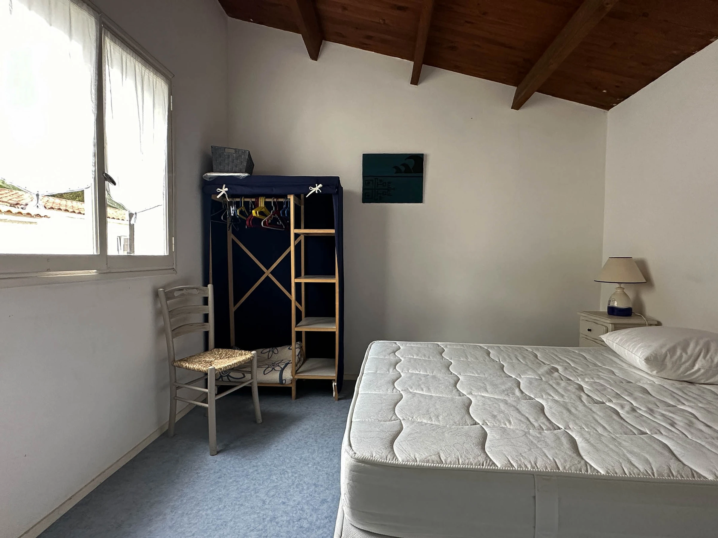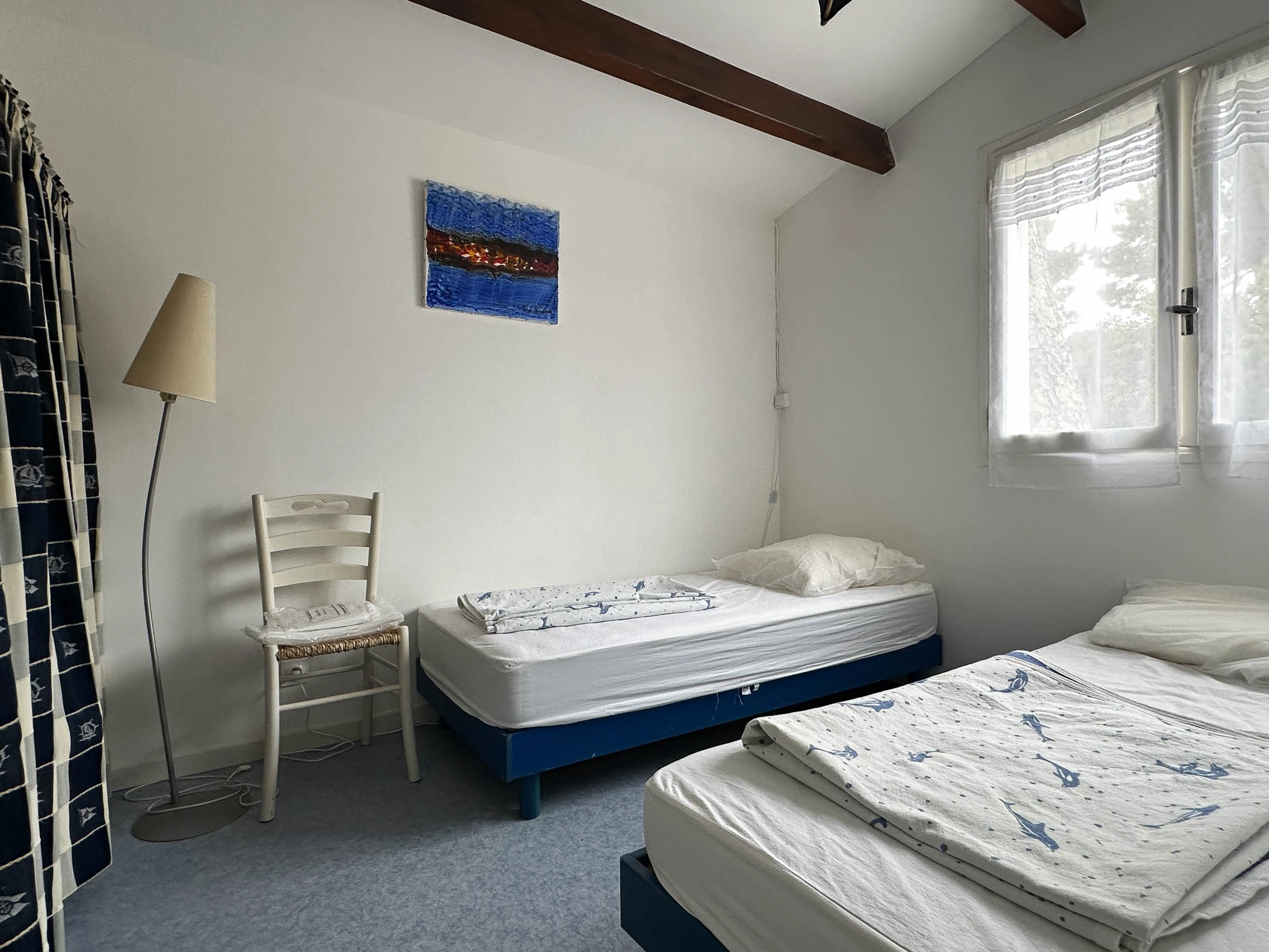 A environ 300m de la mer, 400 m des commerces et 200 m des tennis - Maison mitoyenne type 5 pièces à étage, pouvant loger 10 personnes surface habitable 95 m² - Rez de Chaussée: Entrée, dégagement avec wc - Patio couvert fermé par baies vitrées - Cuisine équipée avec cuisinière, four, lave-vaisselle, lave linge, réfri congel, Micro Ondes - Séjour avec canapé et TV ouvrant sur patio dallé - Étage: Chambre 1 lit de 140 cm armoire (7m²) – Chambre 1 lit de 140 cm placard (7m²) – Chambre 2 lits de 90 cm placard (8m²) - Chambre 4 lits de 90cm superposés placard (12m²) Salle de bains – Cabinet de toilette avec wc et cabine de douche -