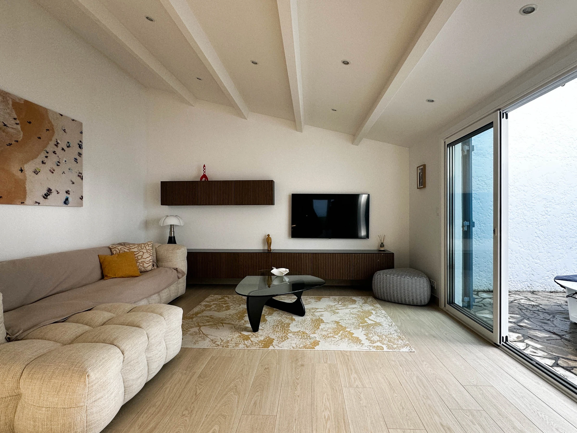 Séjour climatisé avec coin repas, canapé et télévision avec accès internet (fibre), une baie vitrée donne accès au patio extérieur avec vue sur les pins.