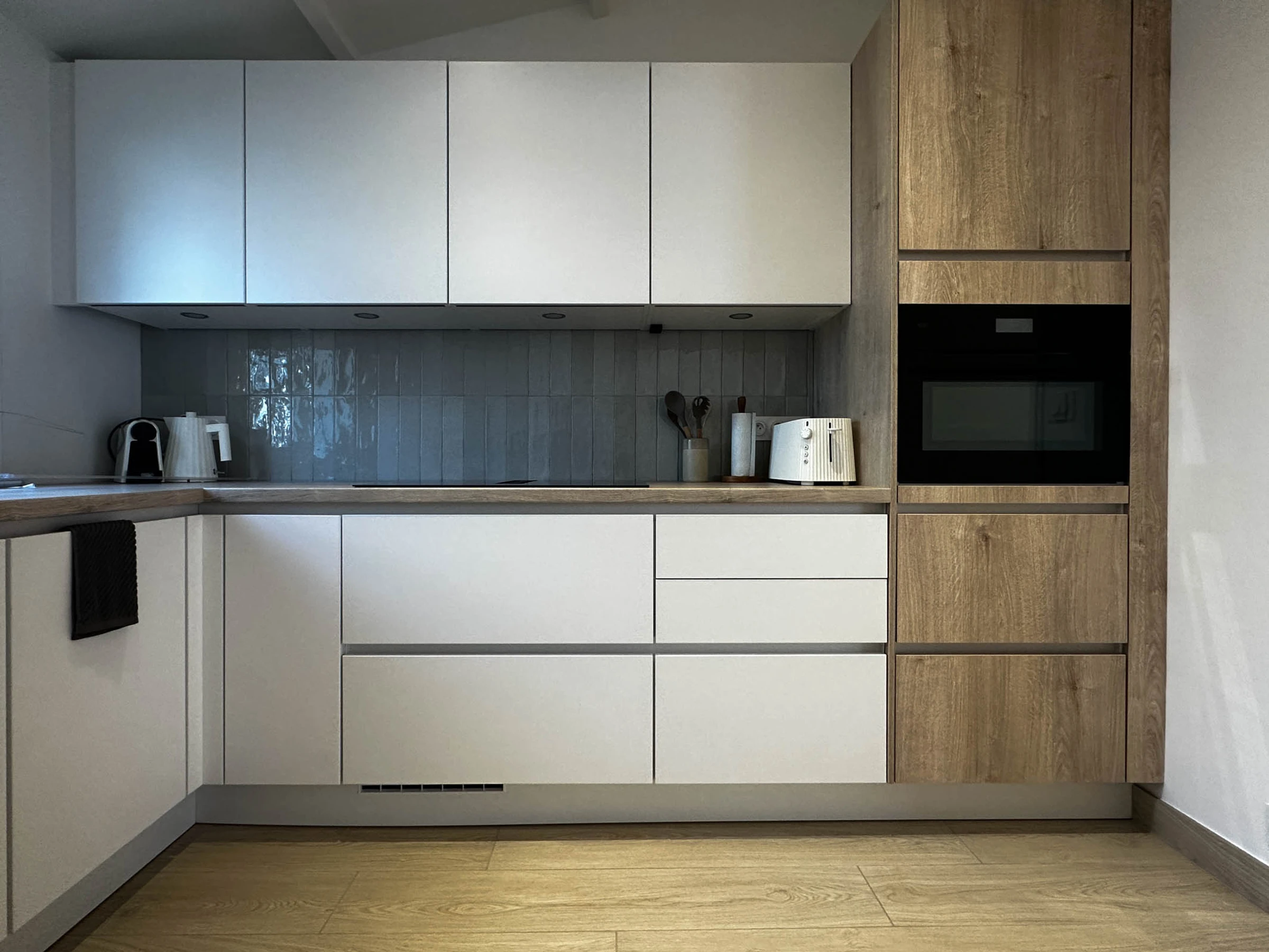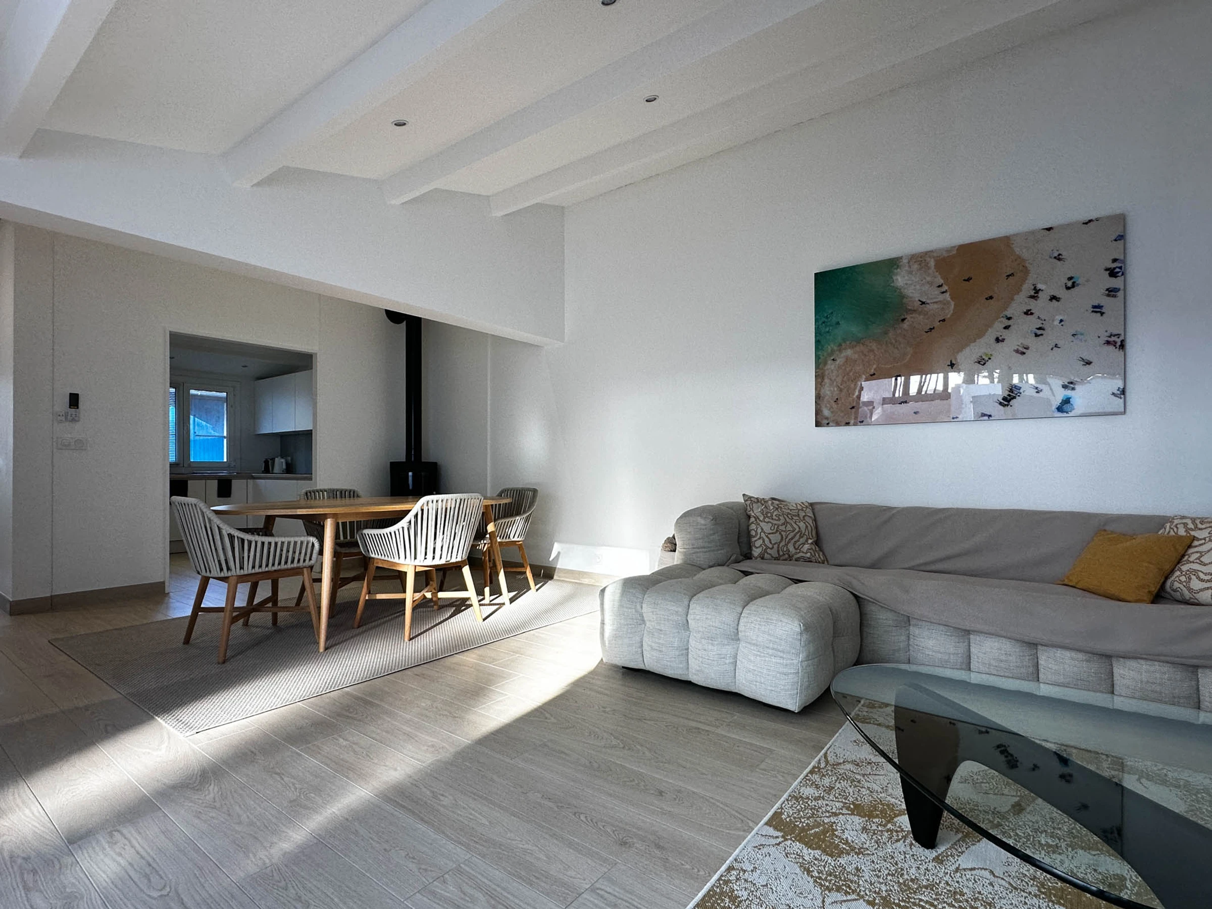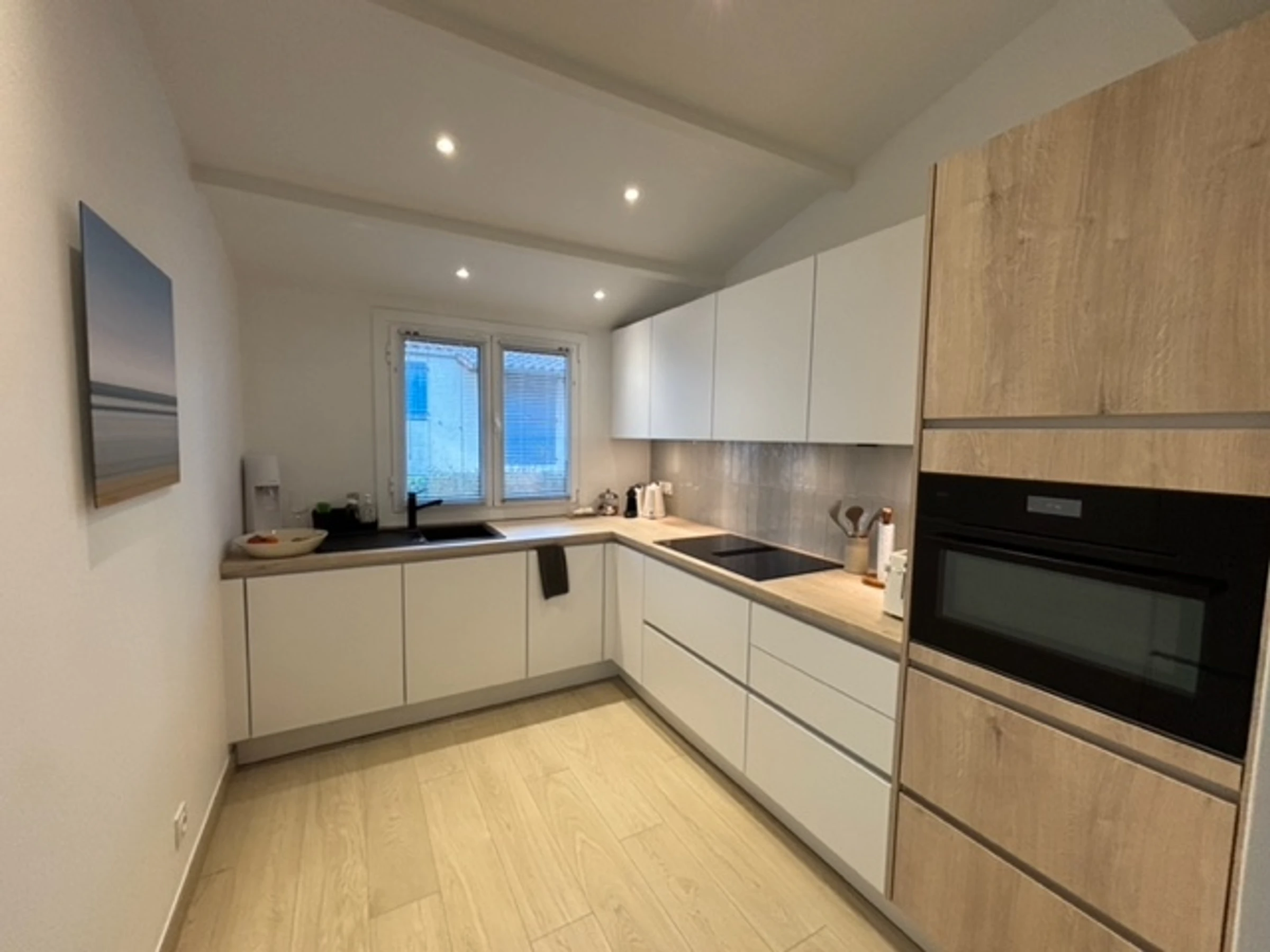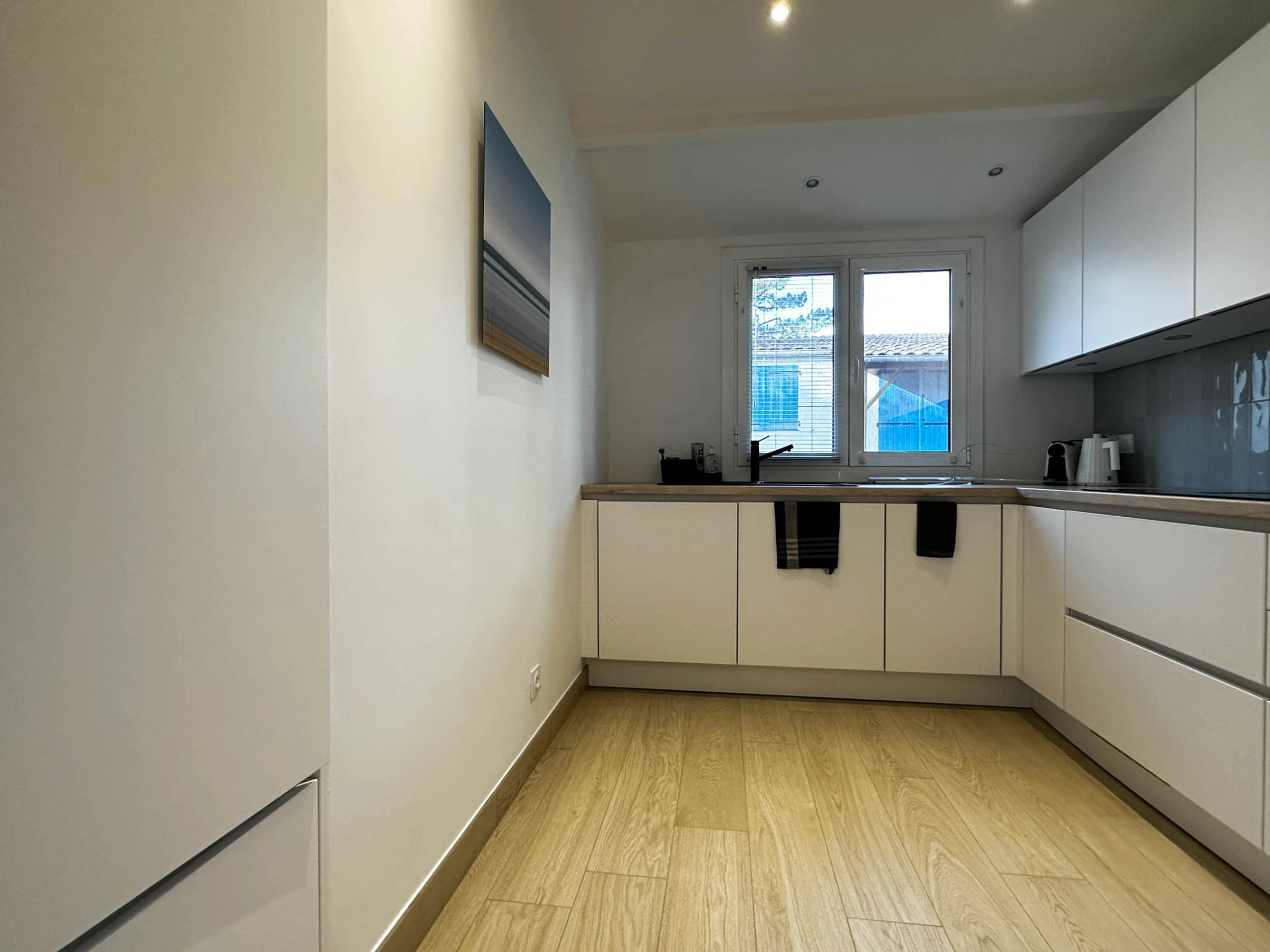 Cuisine ouverte, aménagée et équipée: plaque induction avec hotte intégrée, lave-vaisselle, four/micro-onde, réfrigérateur freezer, cafetière Nespresso, bouilloire, grille-pain.