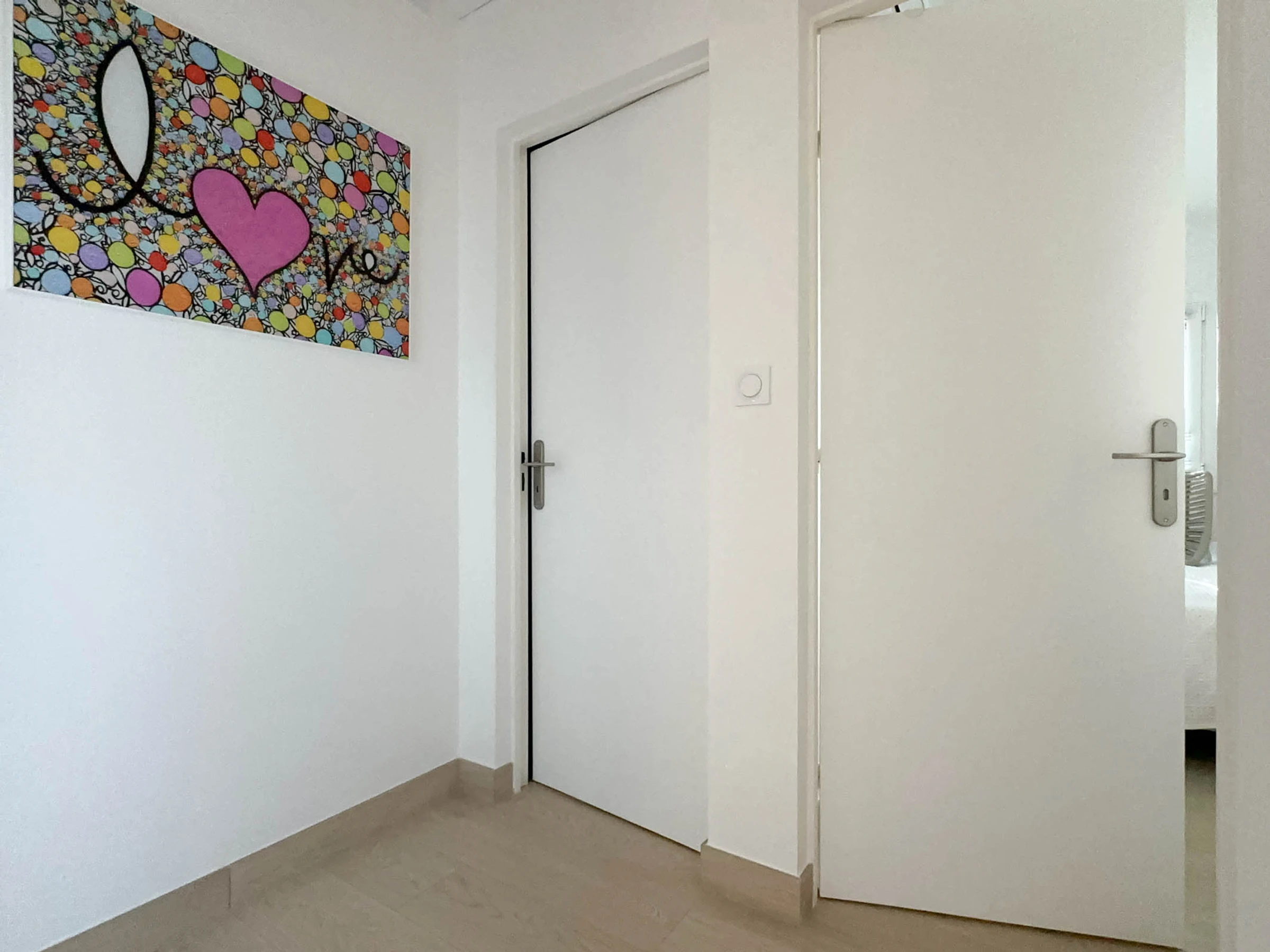 Couloir desservant la salle de bain avec douche à l'italienne, baignoire, WC et la partie nuit: