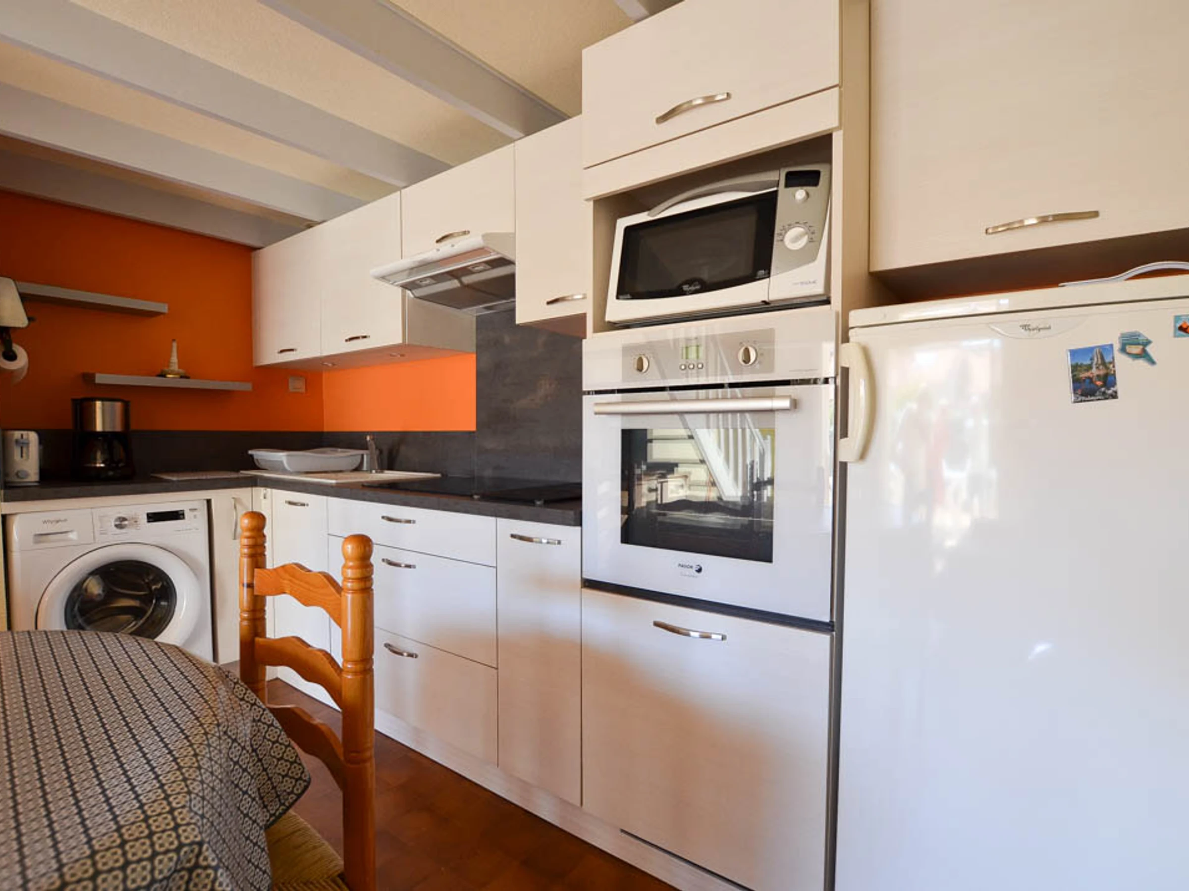 Séjour avec canapé et TV - ouvrant sur Terrasse avec store banne expo Sud-Est - Cuisine US intégrée et équipée avec plaques induction - Four - Réfrigérateur - lave-linge - Micro-Ondes - Chambre 1 lit de 140 cm - armoire- Salle d’eau avec wc