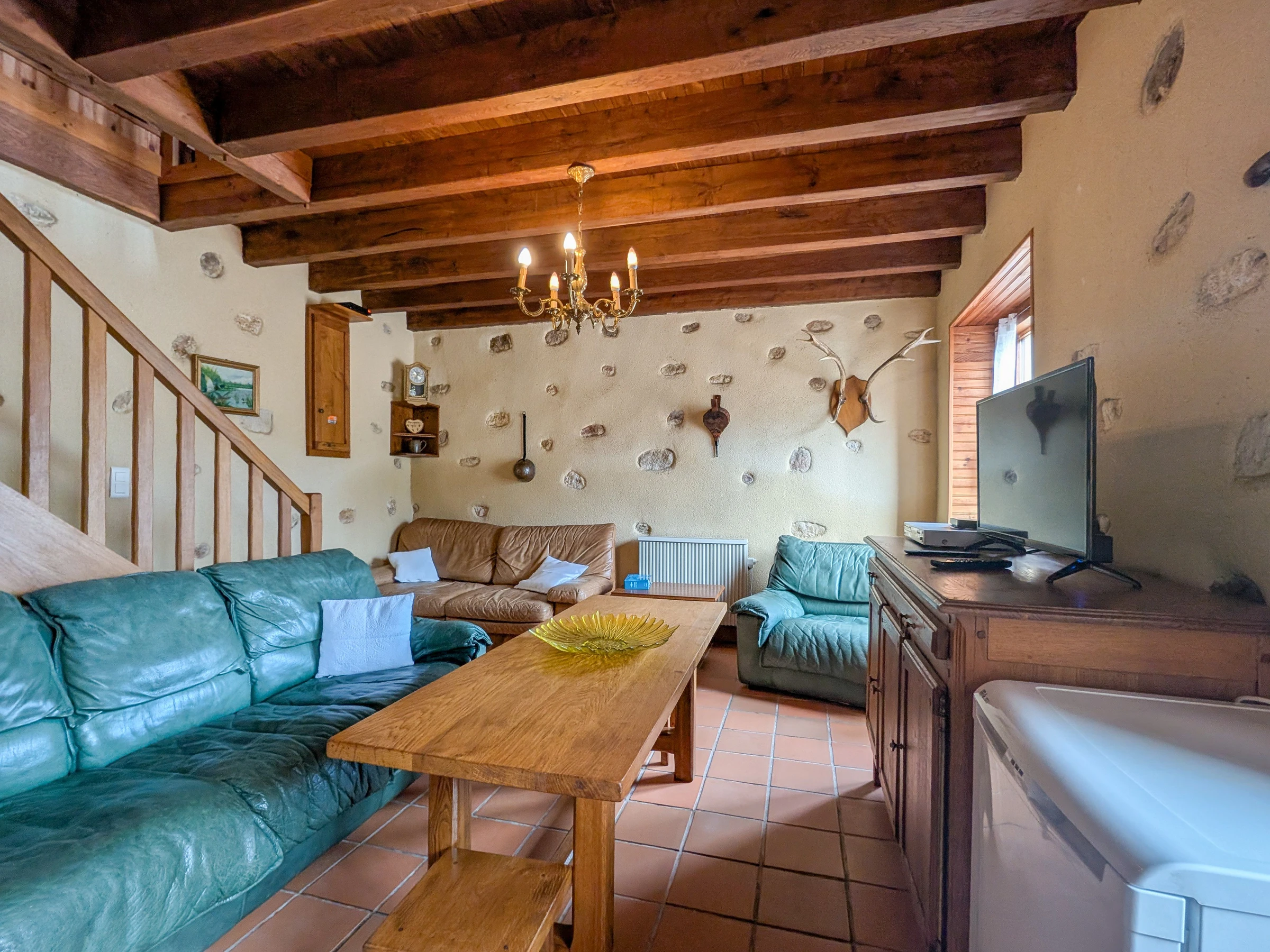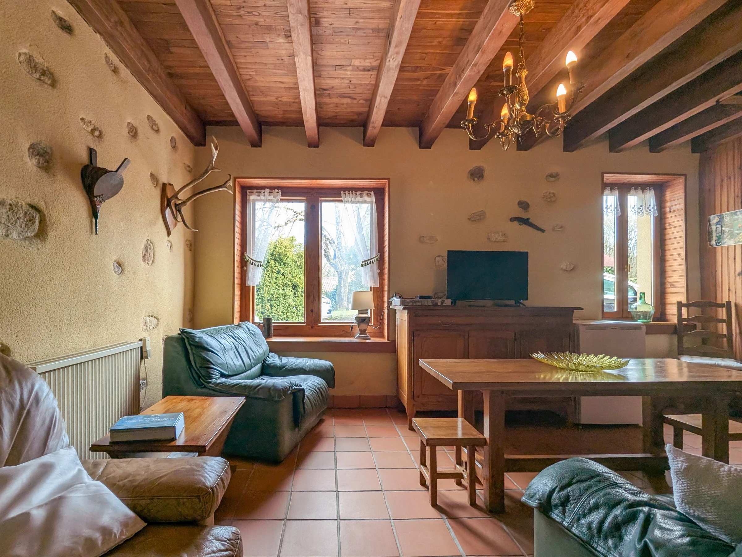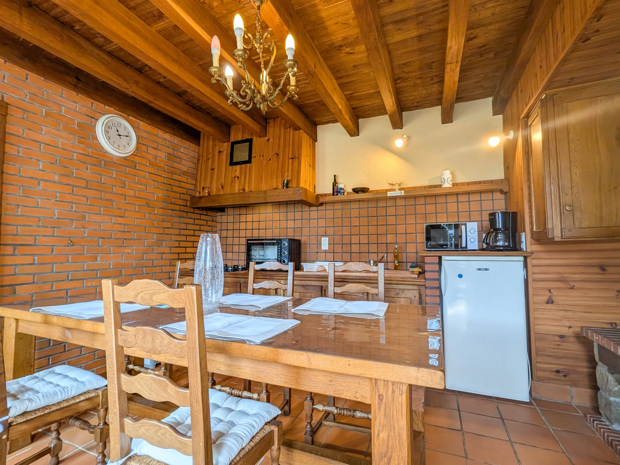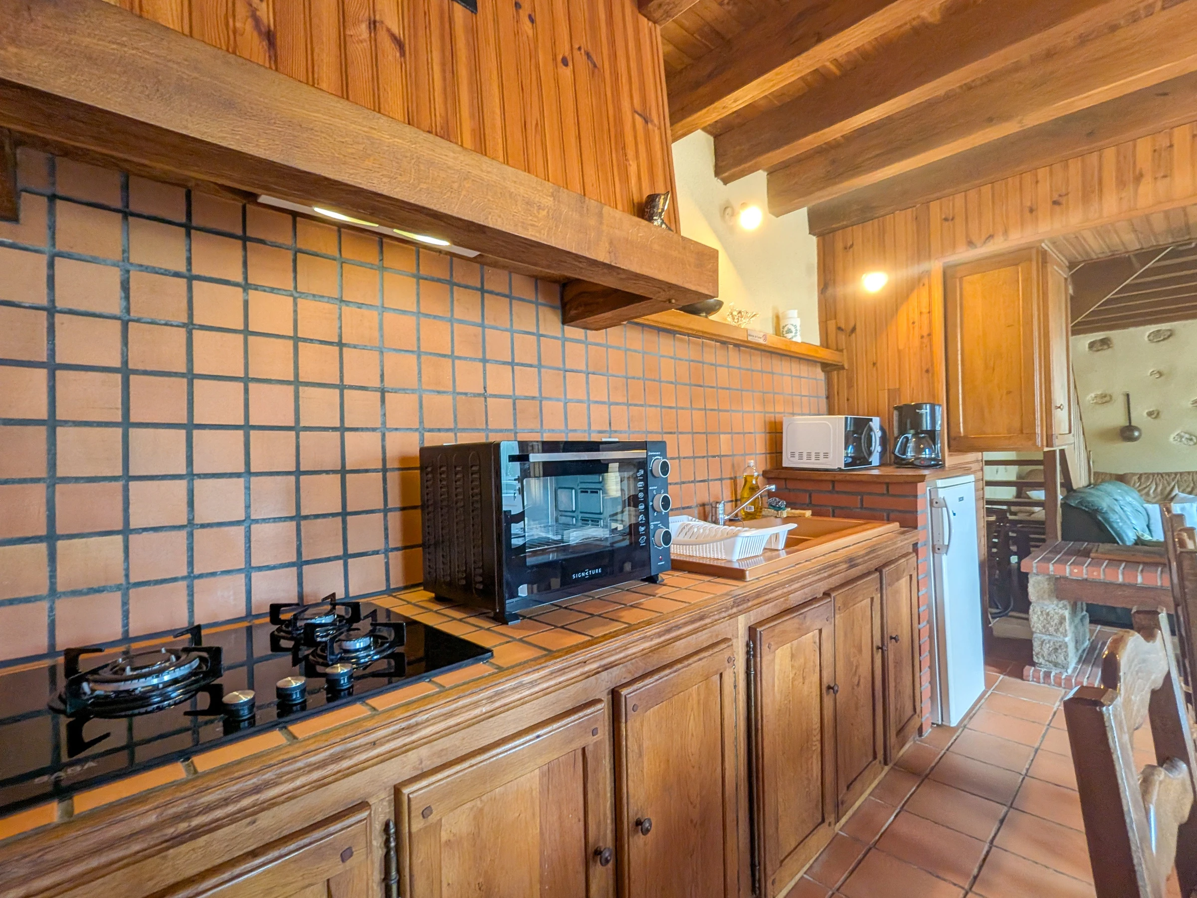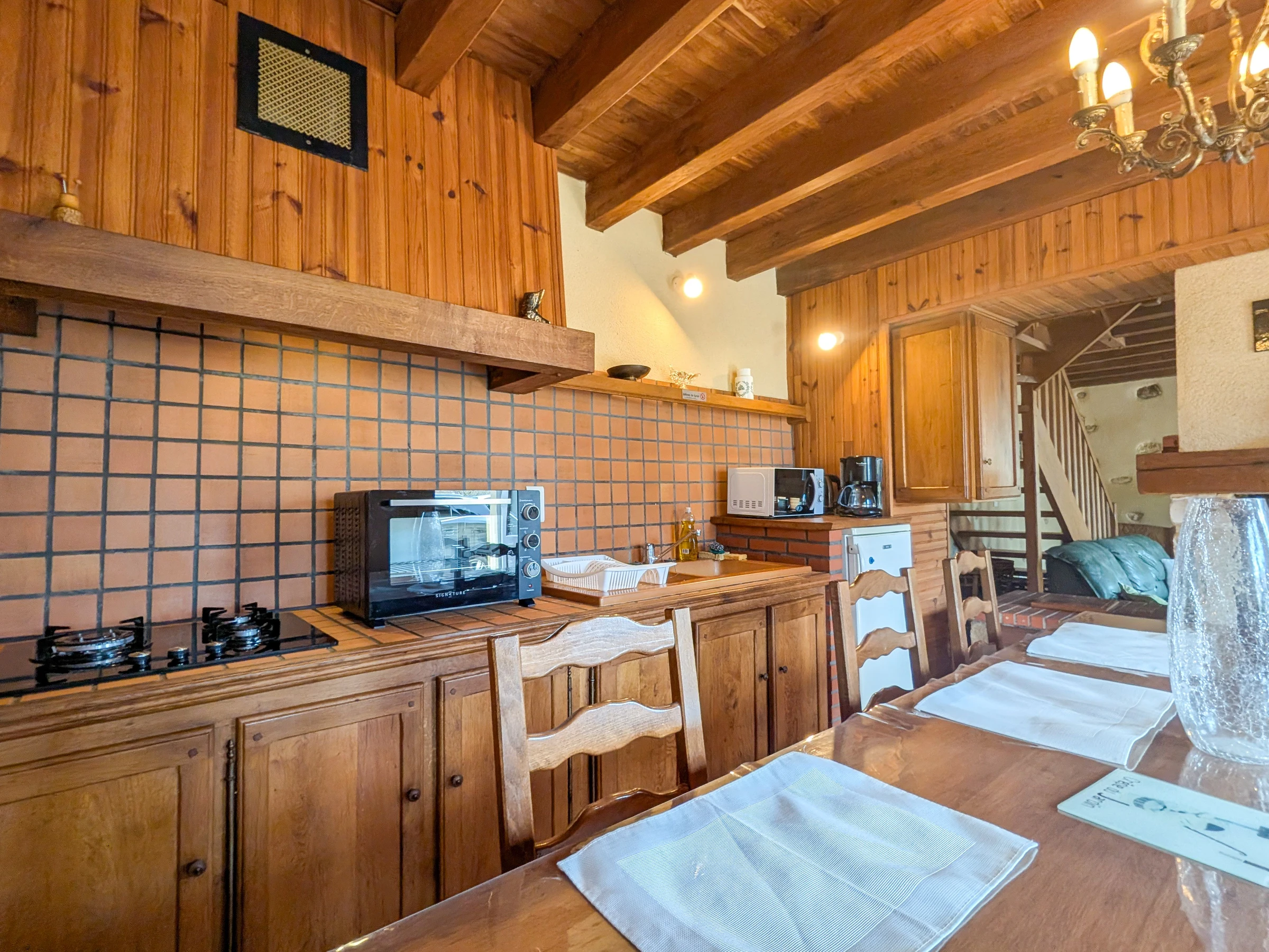 Au rez-de-chaussée, une spacieuse cuisine aménagée avec un insert cheminée double face s’ouvre sur le salon/séjour, créant une atmosphère chaleureuse et conviviale. Une salle d’eau et des toilettes complètent cet espace.