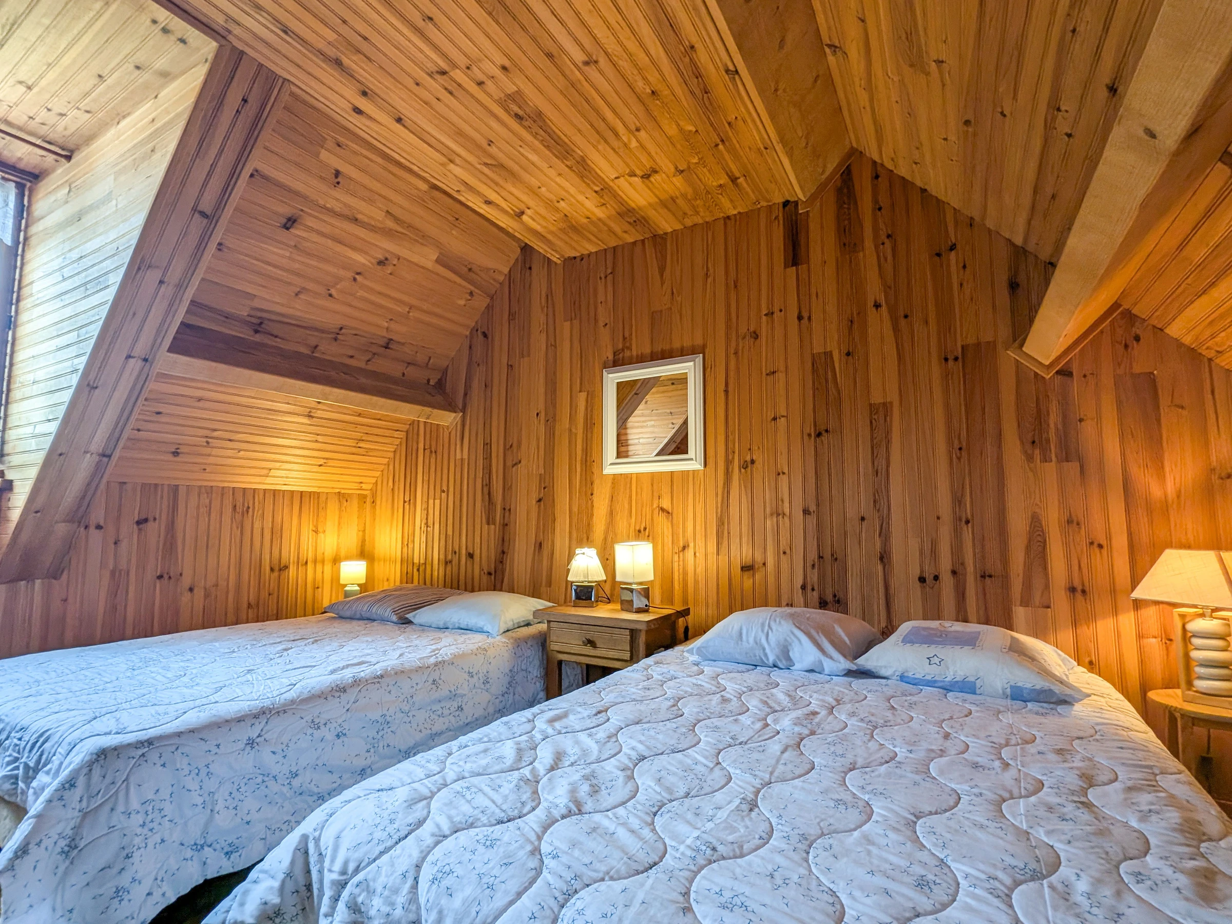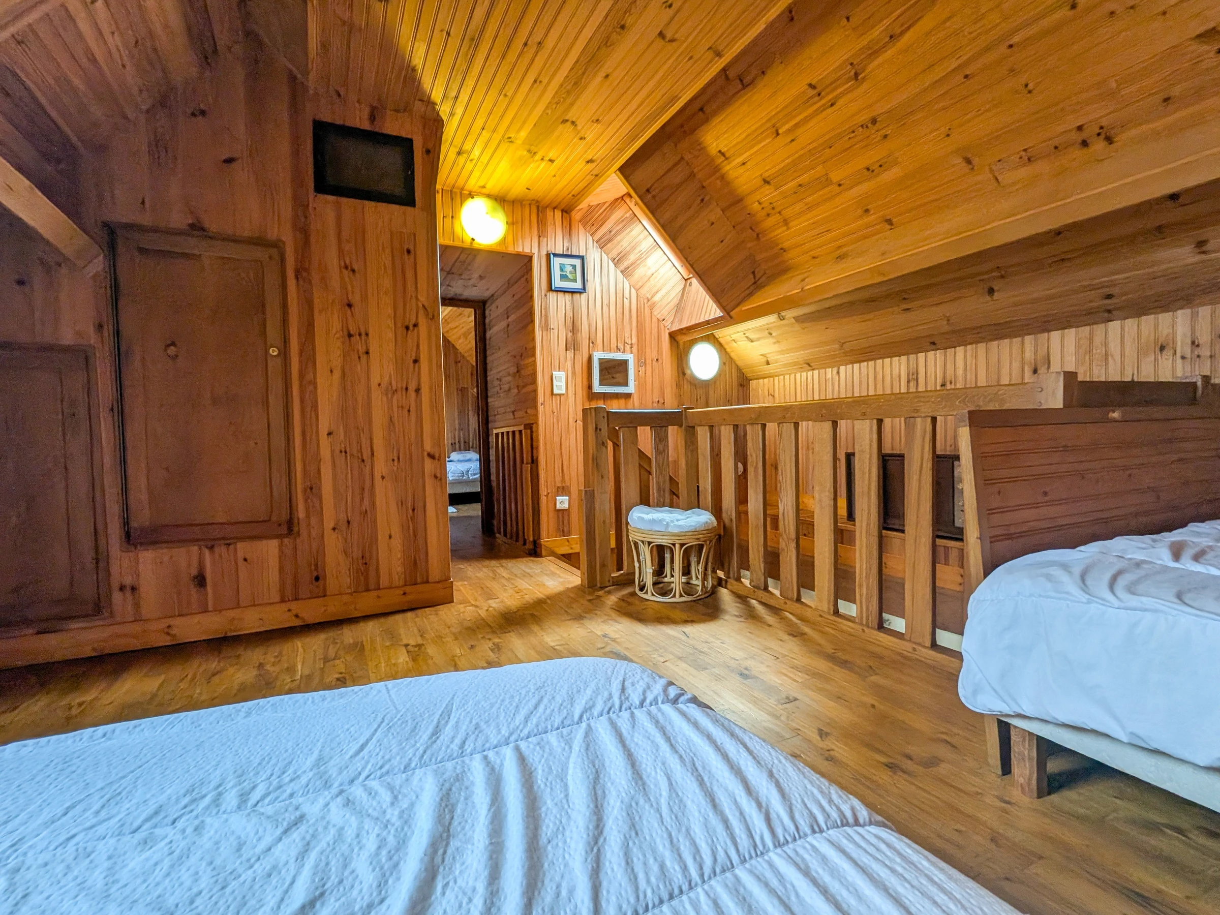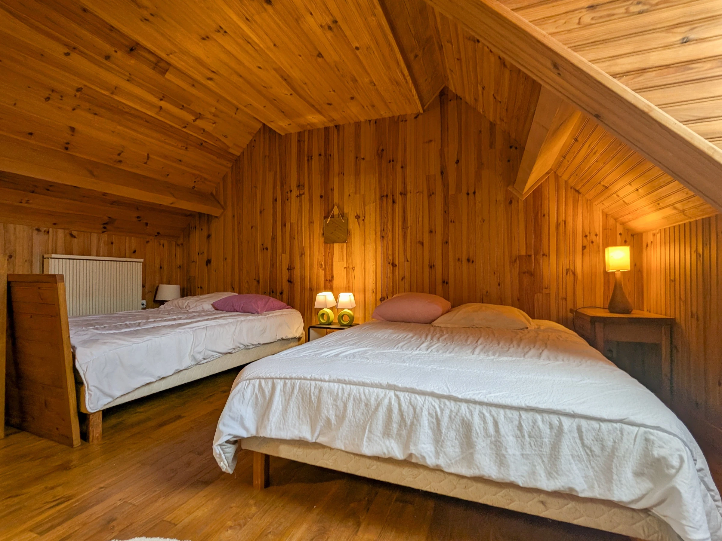À l’étage, vous trouverez une chambre confortable avec un lit double et un lit de 130 cm, ainsi qu’une mezzanine accueillant un second lit double, idéale pour un coin nuit cosy.