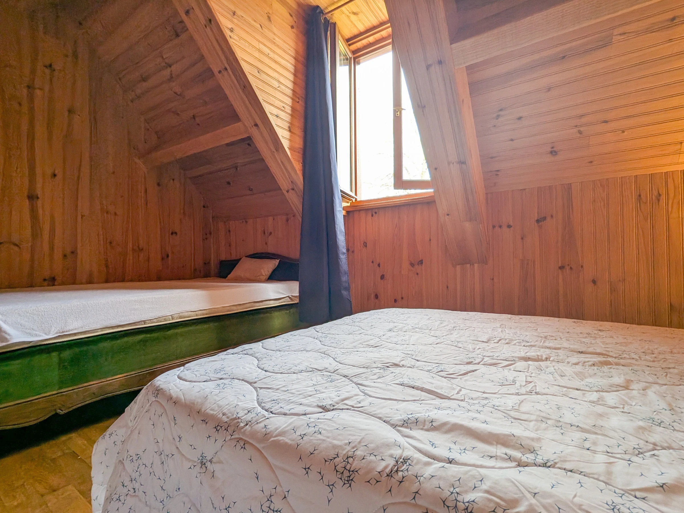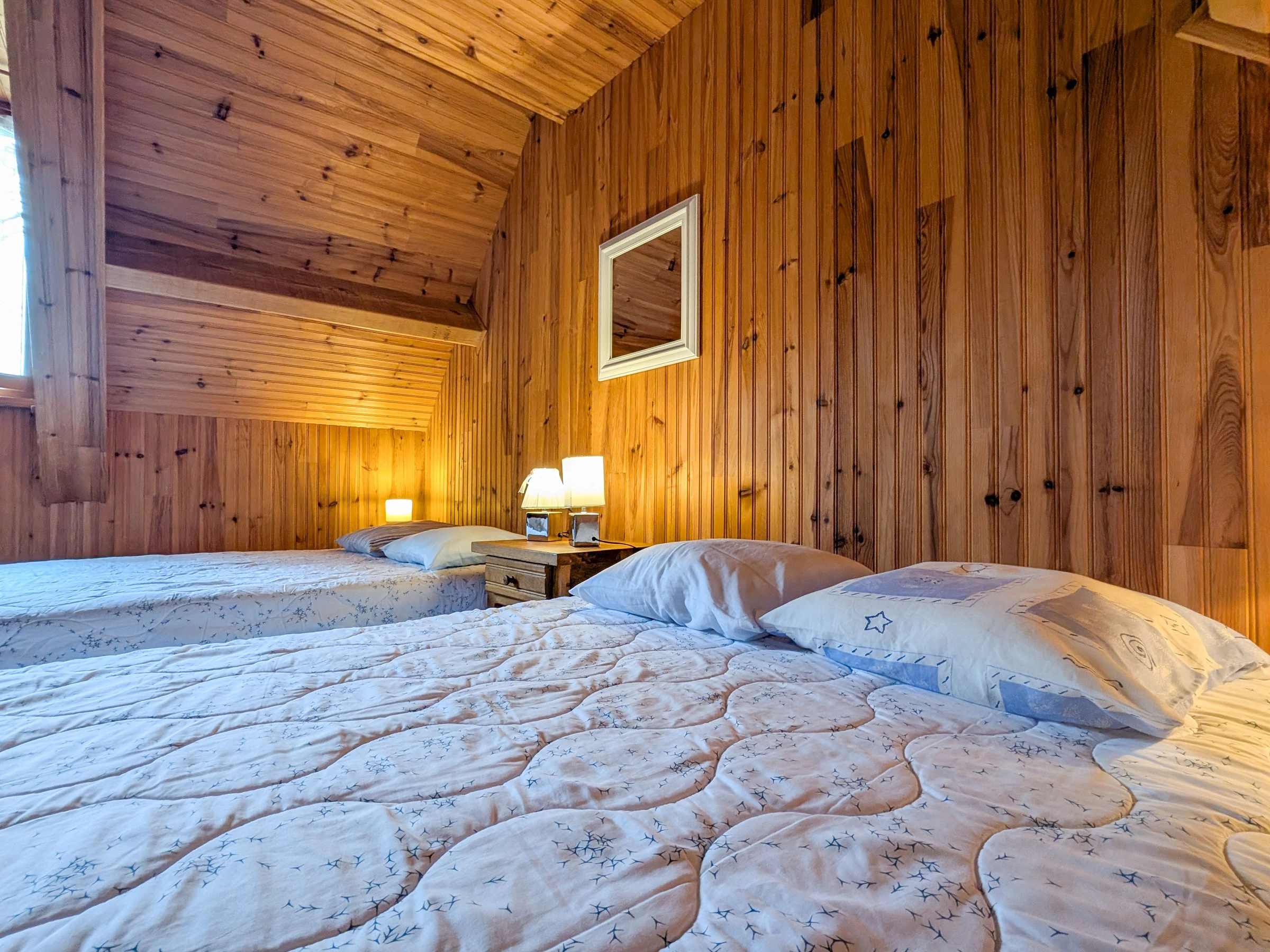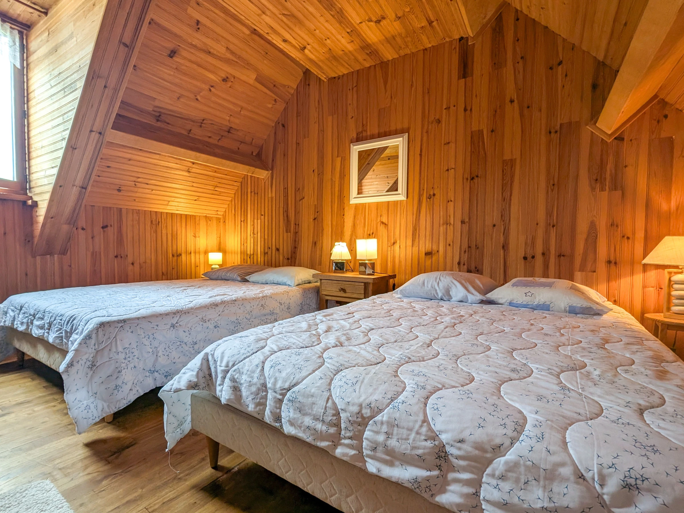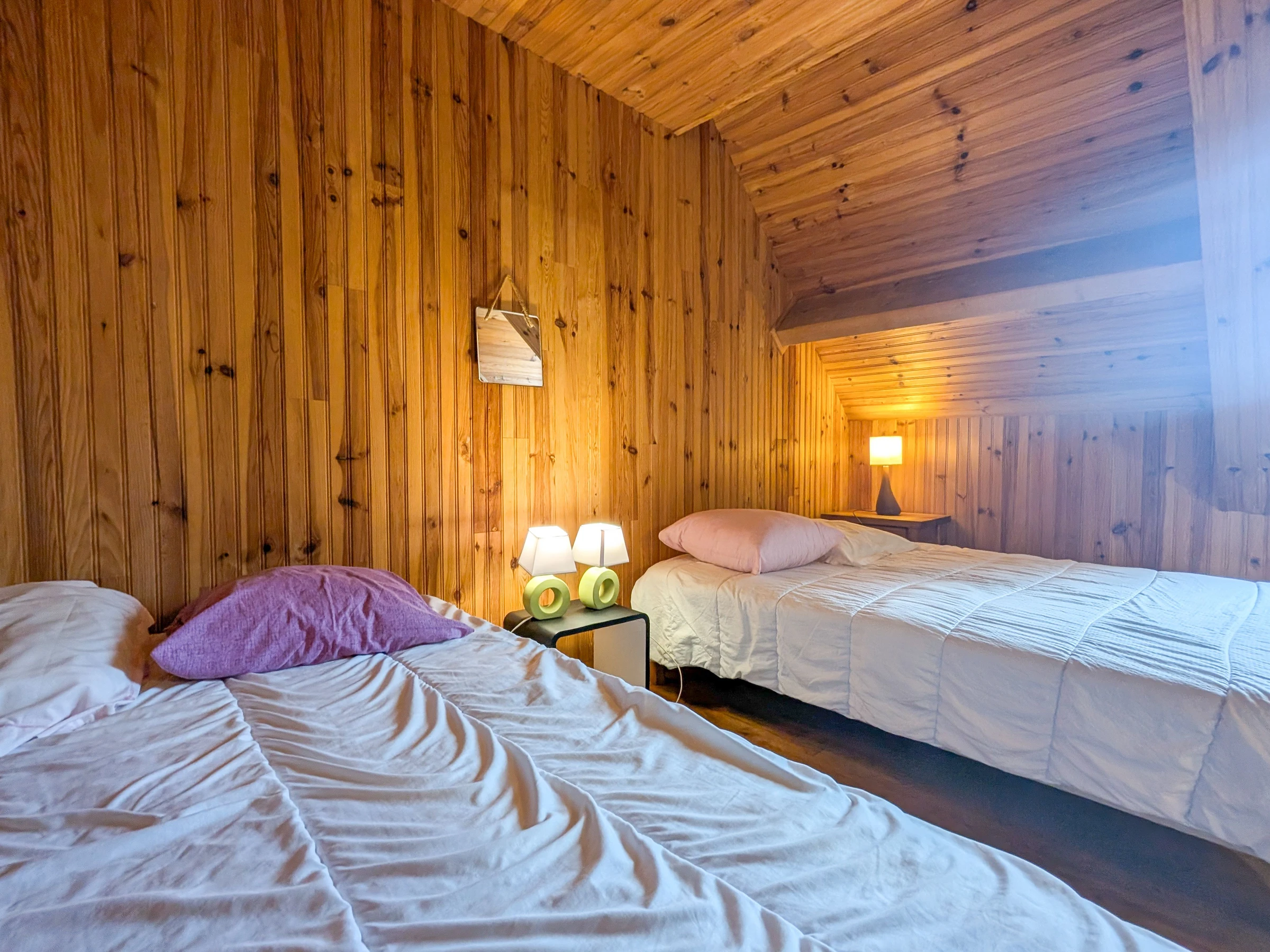 À l’étage, vous trouverez une chambre confortable avec un lit double et un lit de 130 cm, ainsi qu’une mezzanine accueillant un second lit double, idéale pour un coin nuit cosy.