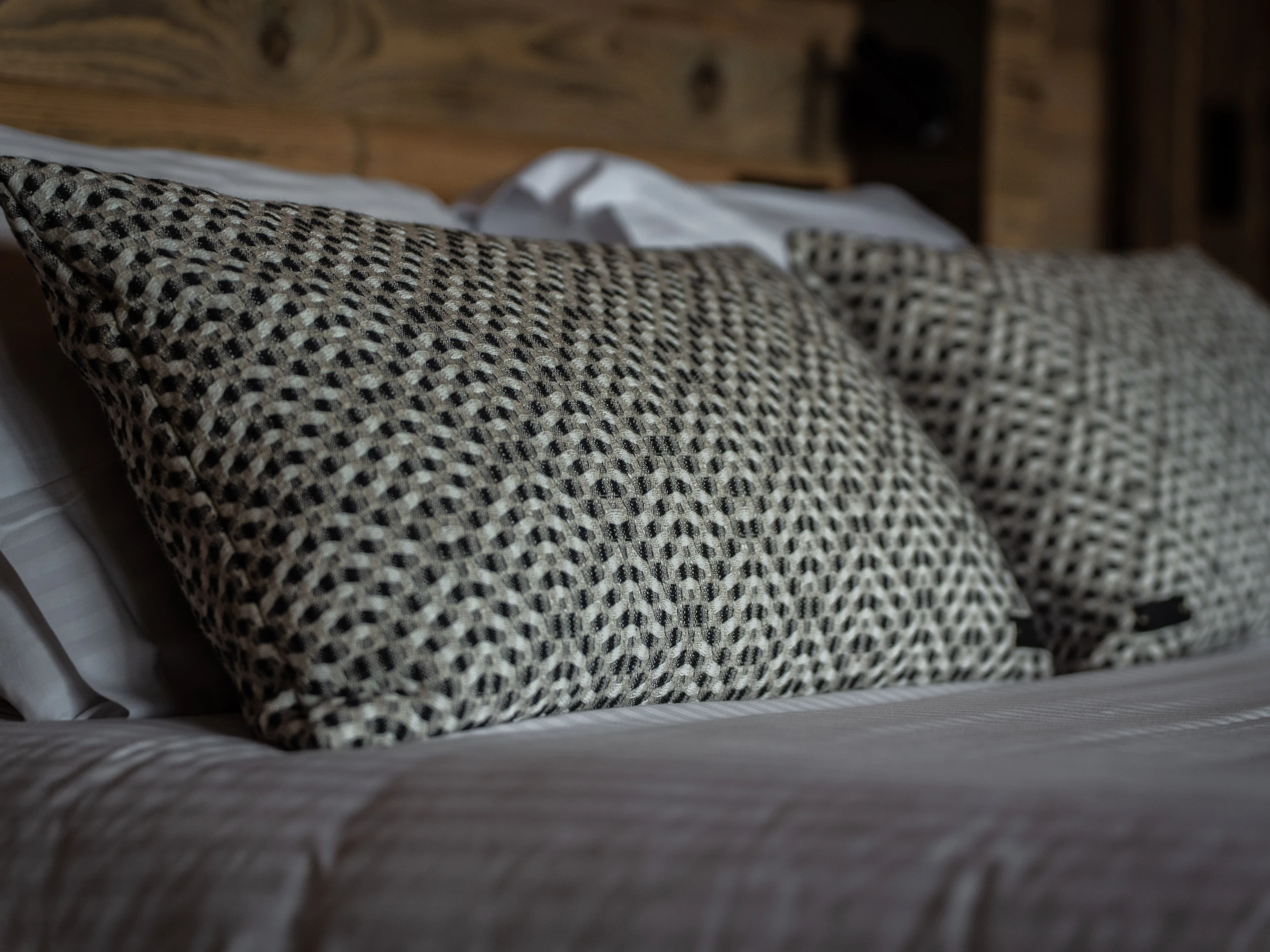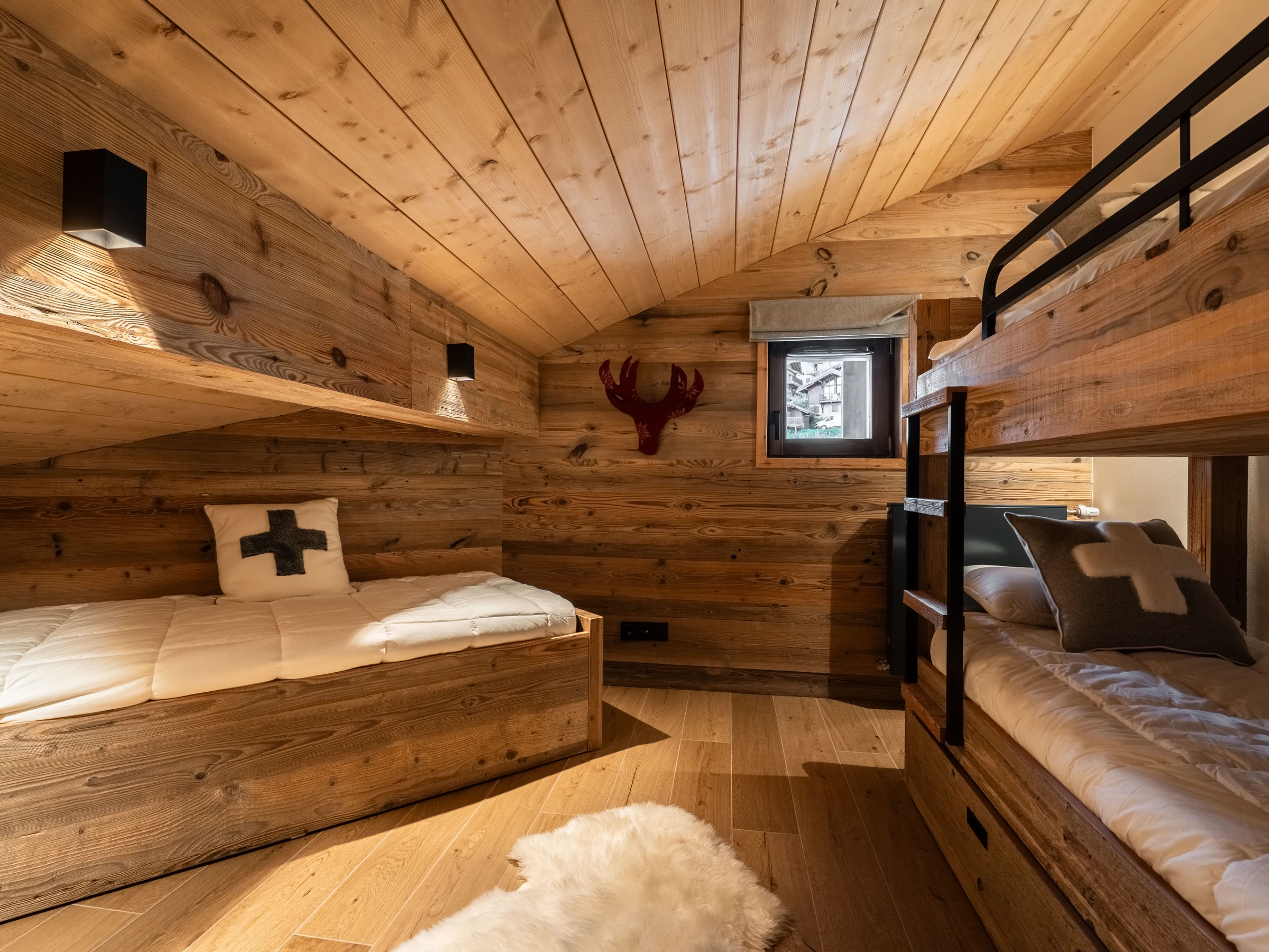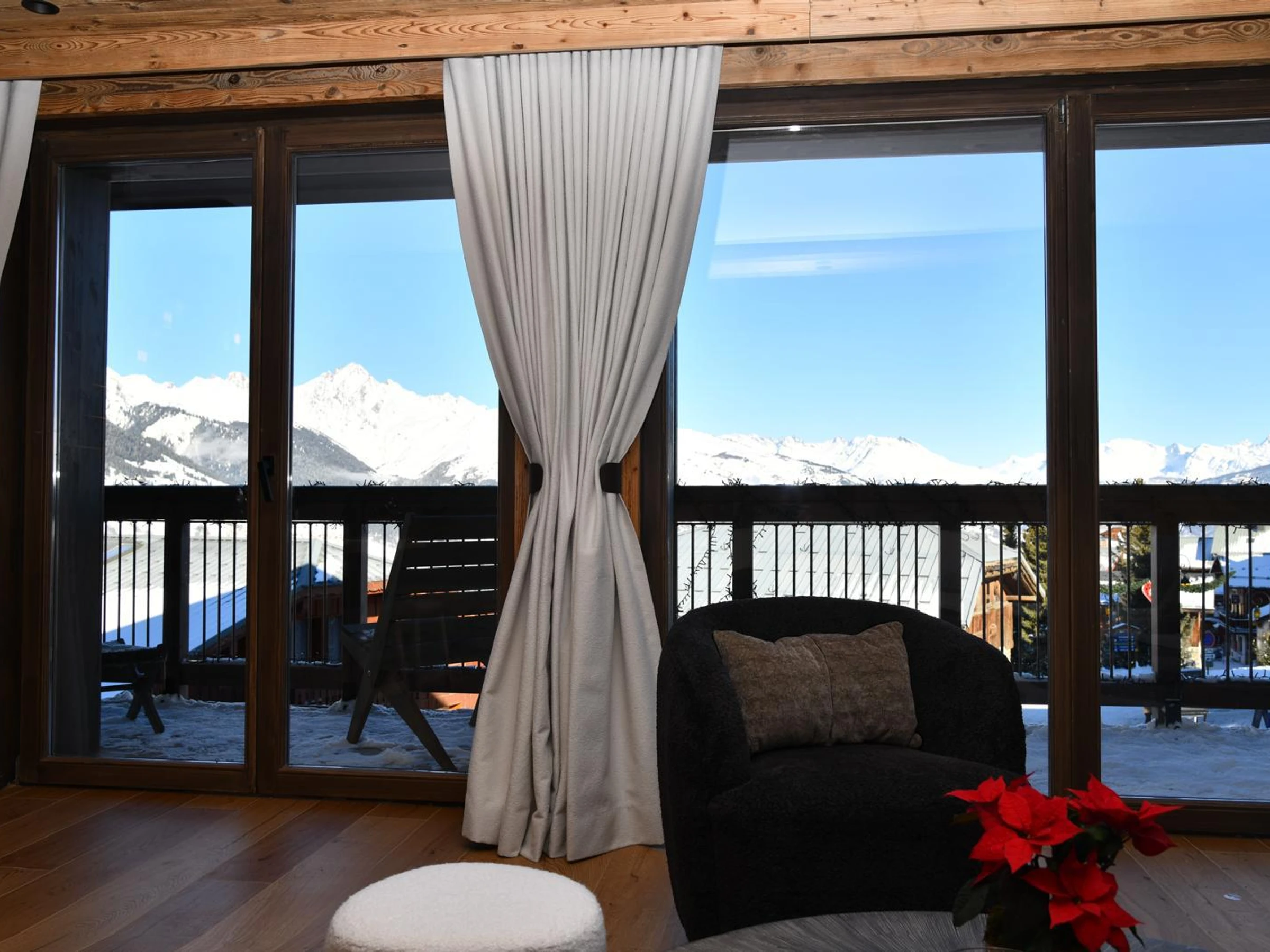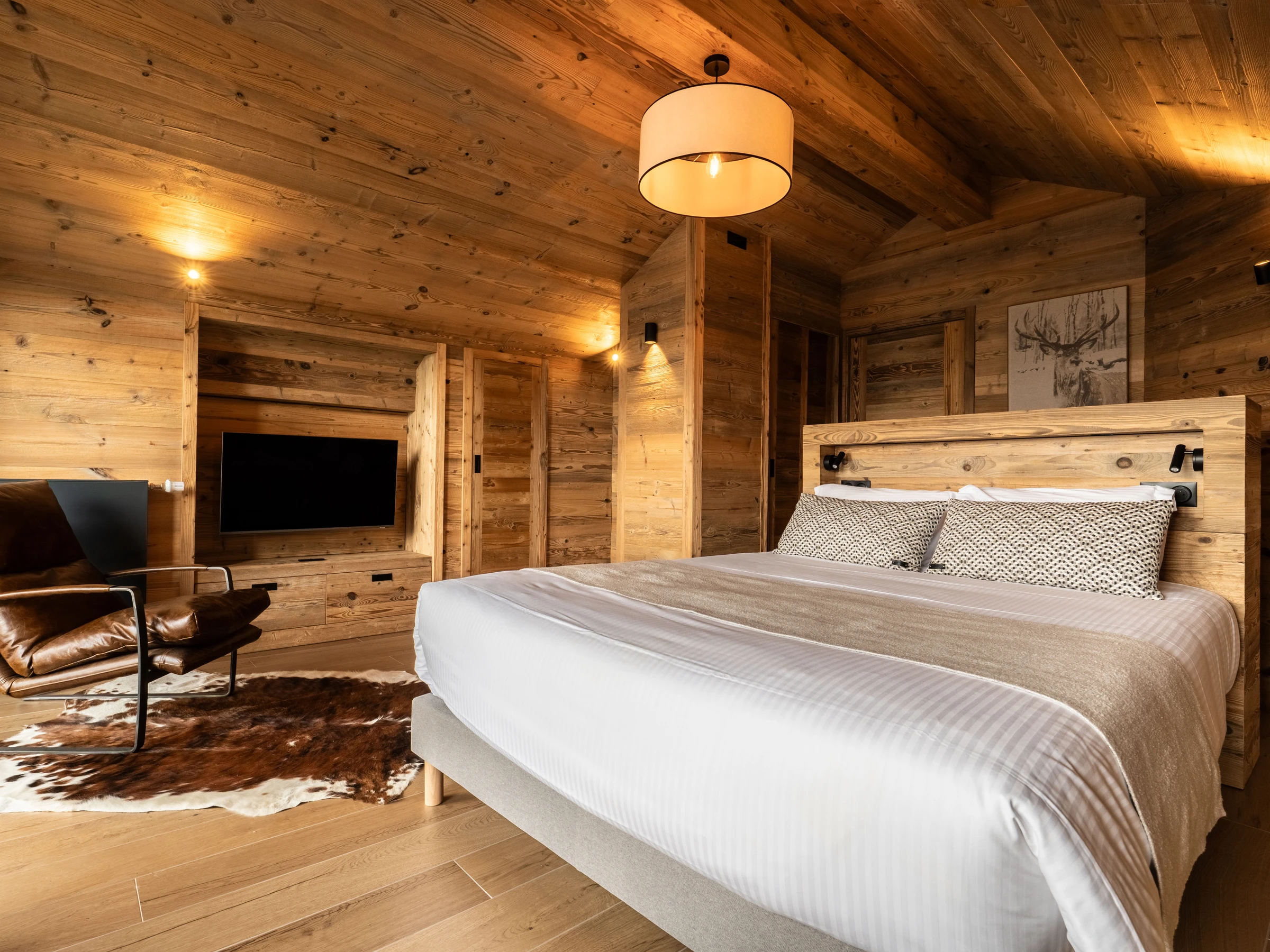 Une Master room avec lit double en 160cm, TV, cheminée électrique, accès au balcon avec vue exceptionnelle sur les sommets et le Mont Blanc,