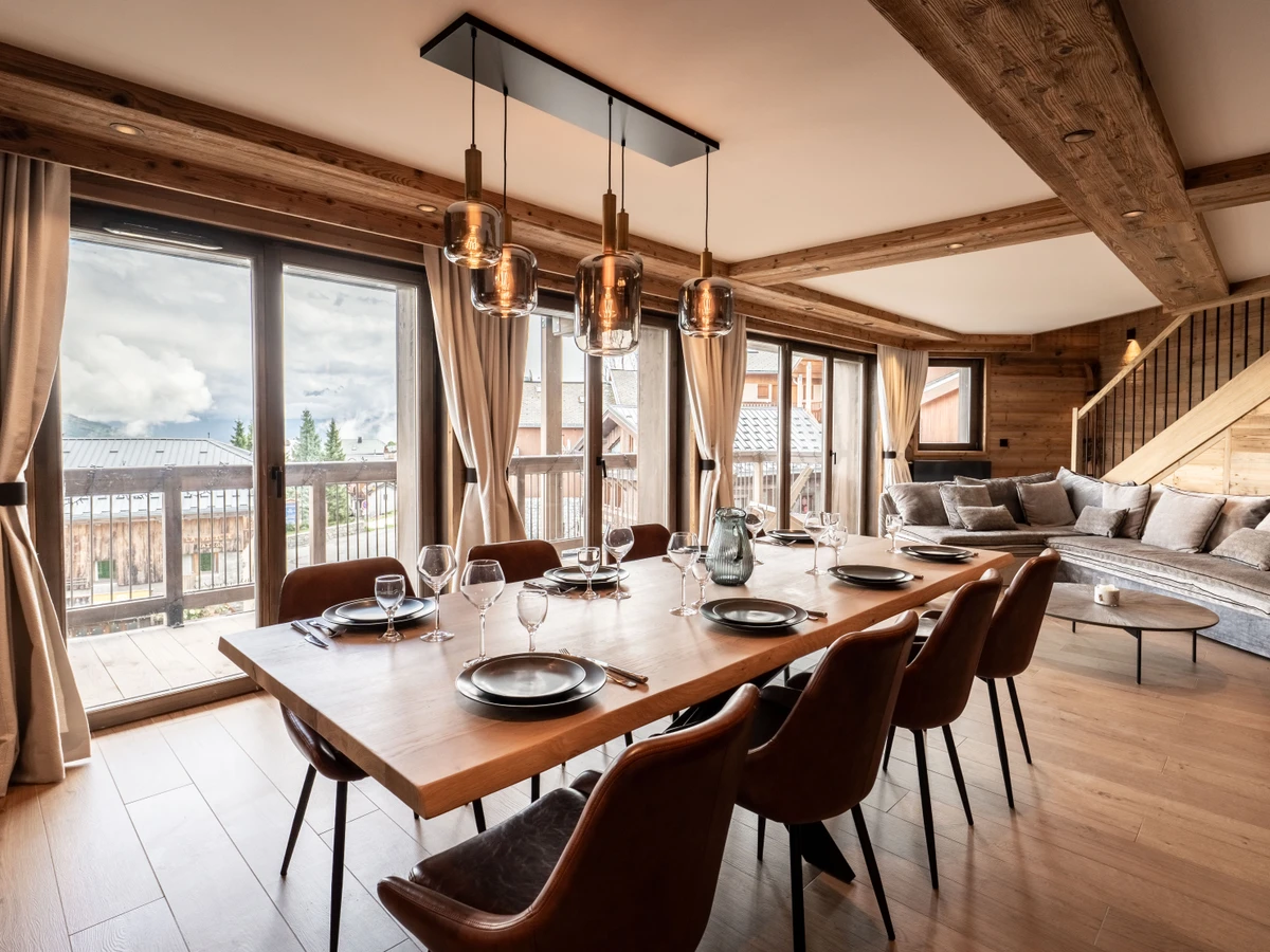 Un séjour/salon lumineux avec de grandes baies vitrées donnant accès à un balcon offrant une vue somptueuse sur les montagnes. Grande table de repas pour 12 personnes, canapé, TV, cheminée.