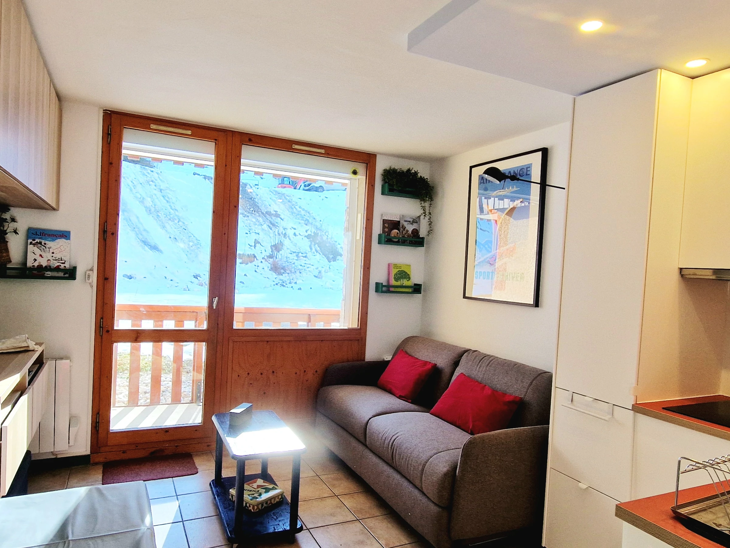 Un séjour avec TV, canapé lit pour 2 personnes, et accès balcon.