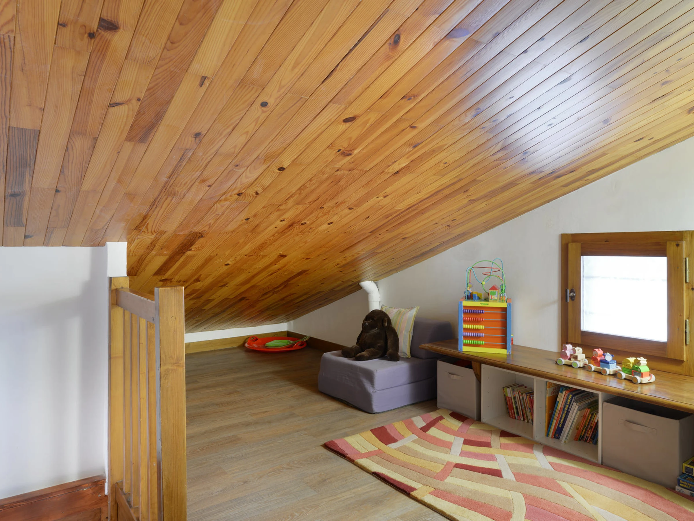 Vous disposez à l'étage d'une chambre avec un lit en 140 cm, d'un dortoir avec deux lits simples ainsi qu'un ensemble de lits superposés (interdit aux enfants de moins de 6 ans). Un espace de jeux sur la mezzanine est à votre disposition. Au RDC, vous disposez d'une chambre équipée d'un couchage pour deux personnes en 160cm, d'un coin montagne équipé d'un lit gigogne. Le coin salon est équipé d'un canapé (non convertible).