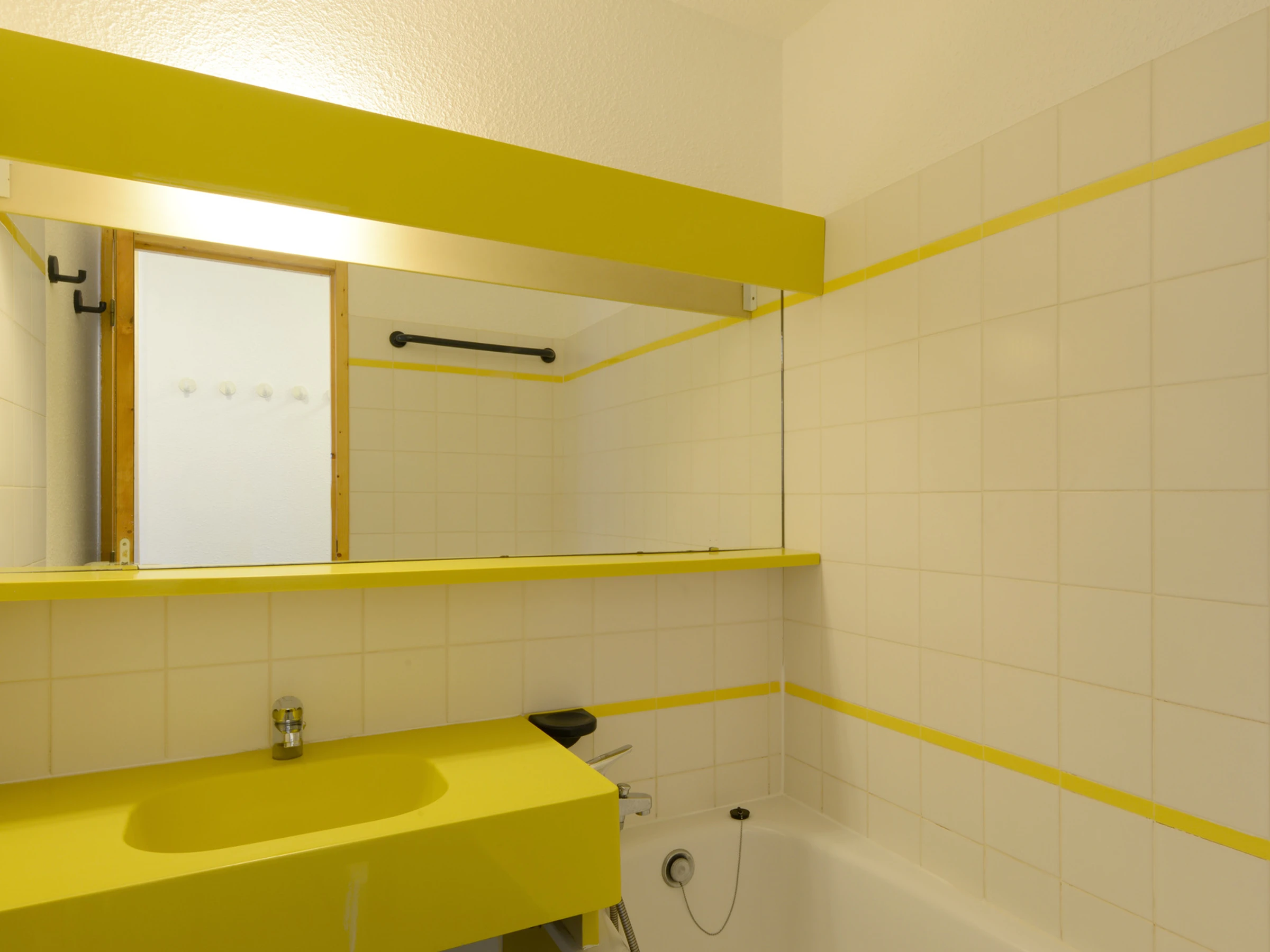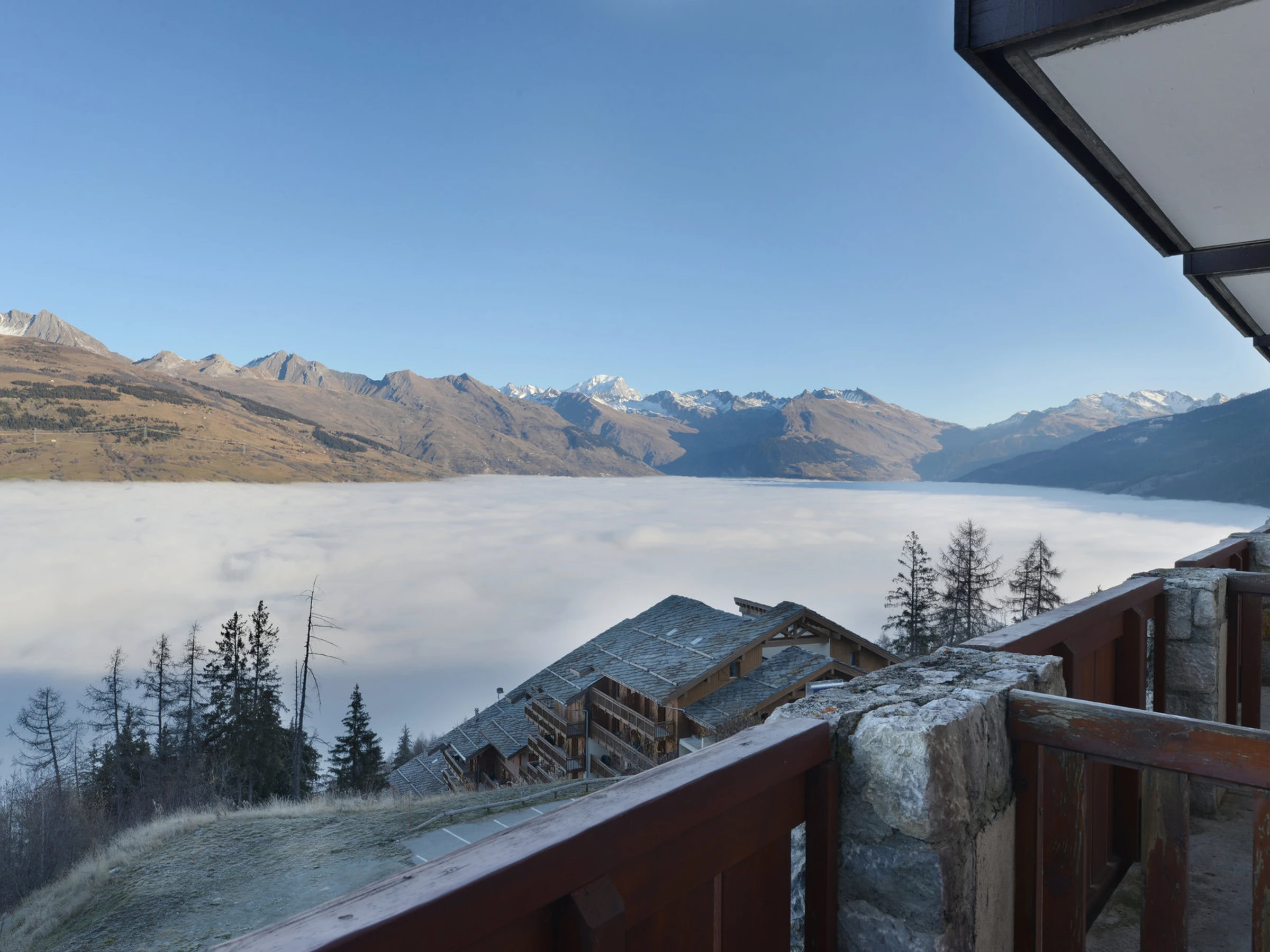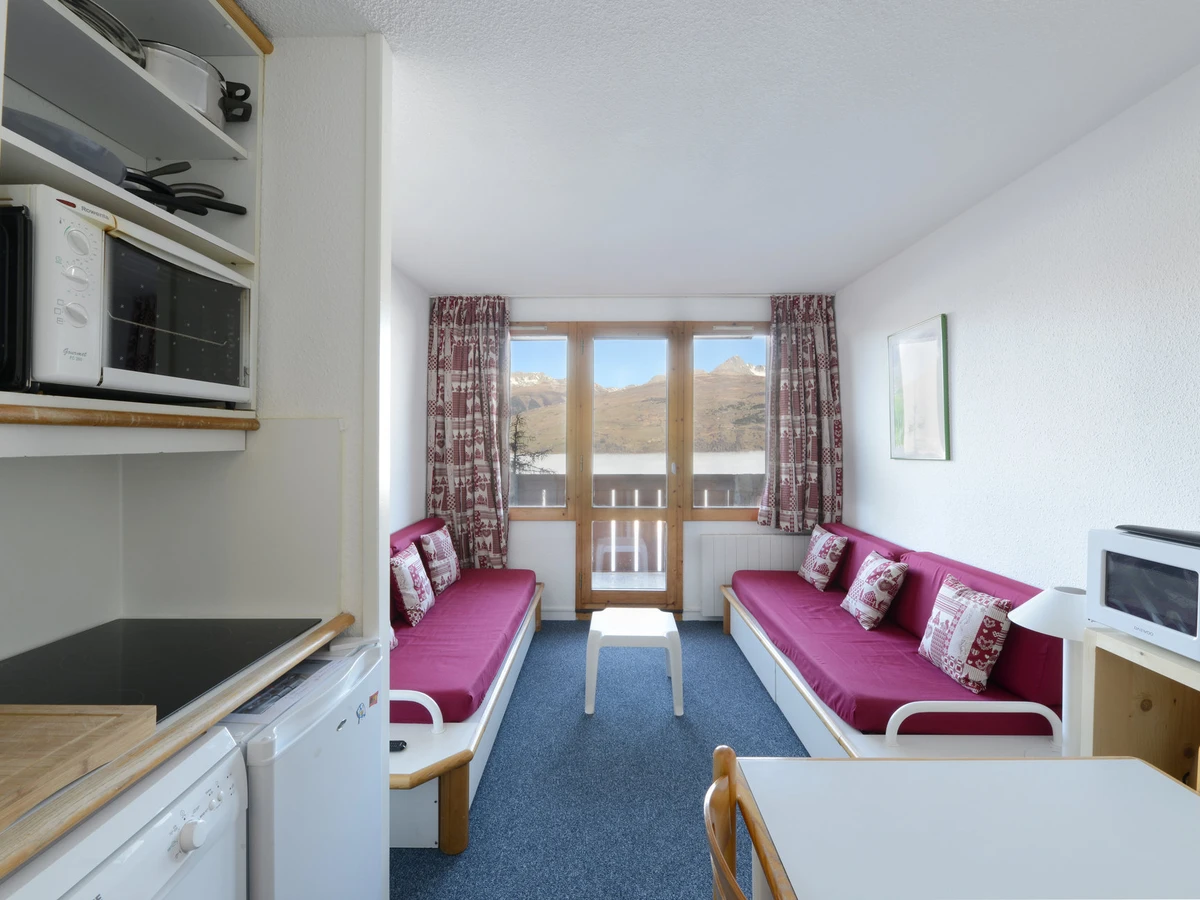 Cet appartement deux pièces cabine avec une vue panoramique sur la vallée, les montagnes et le Mont-Blanc se compose d'une kitchenette équipée (plaques vitrocéramiques, cafetière, lave-vaisselle, four, micro-ondes, bouilloire), d'une salle de bain avec baignoire et WC séparé.