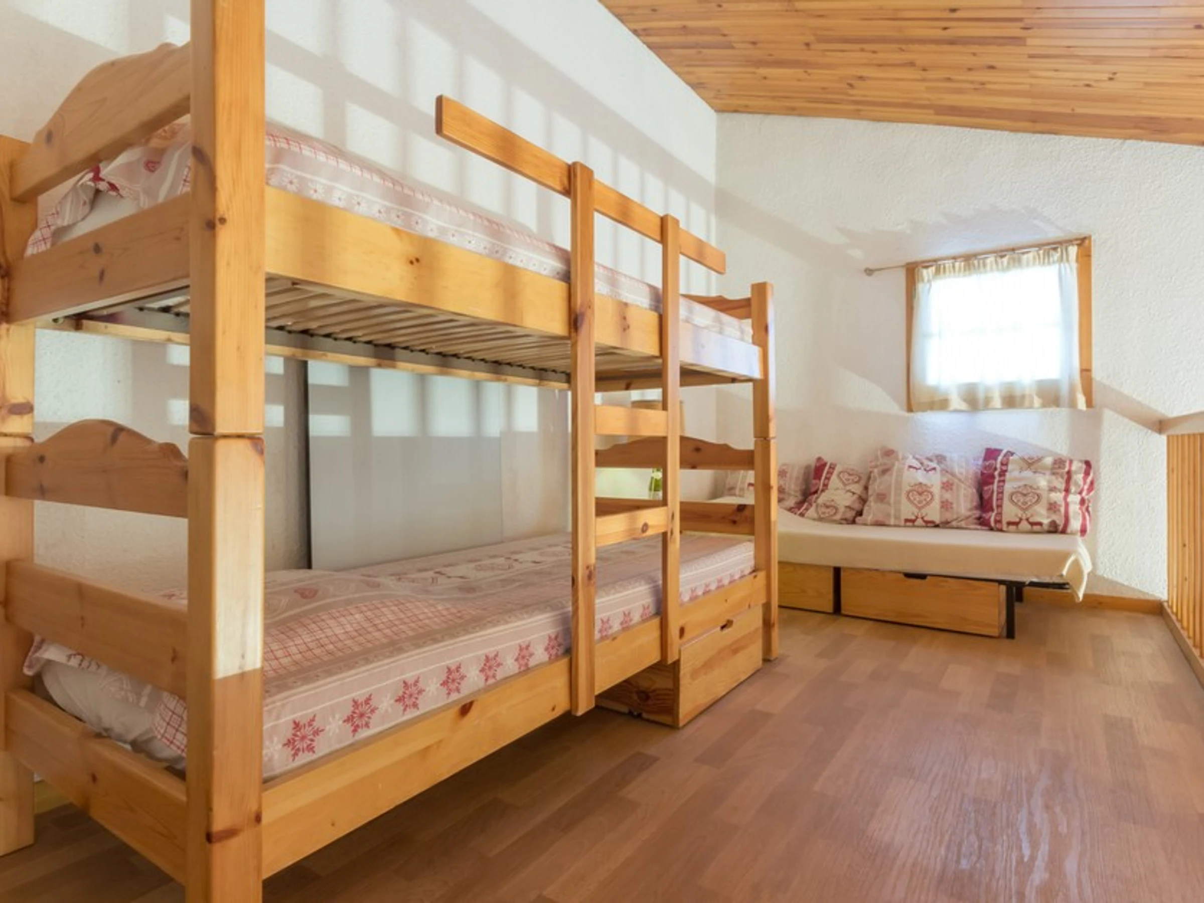 Une chambre avec un ensemble lits superposés (interdit aux enfants de moins de 6 ans) et un lit simple.