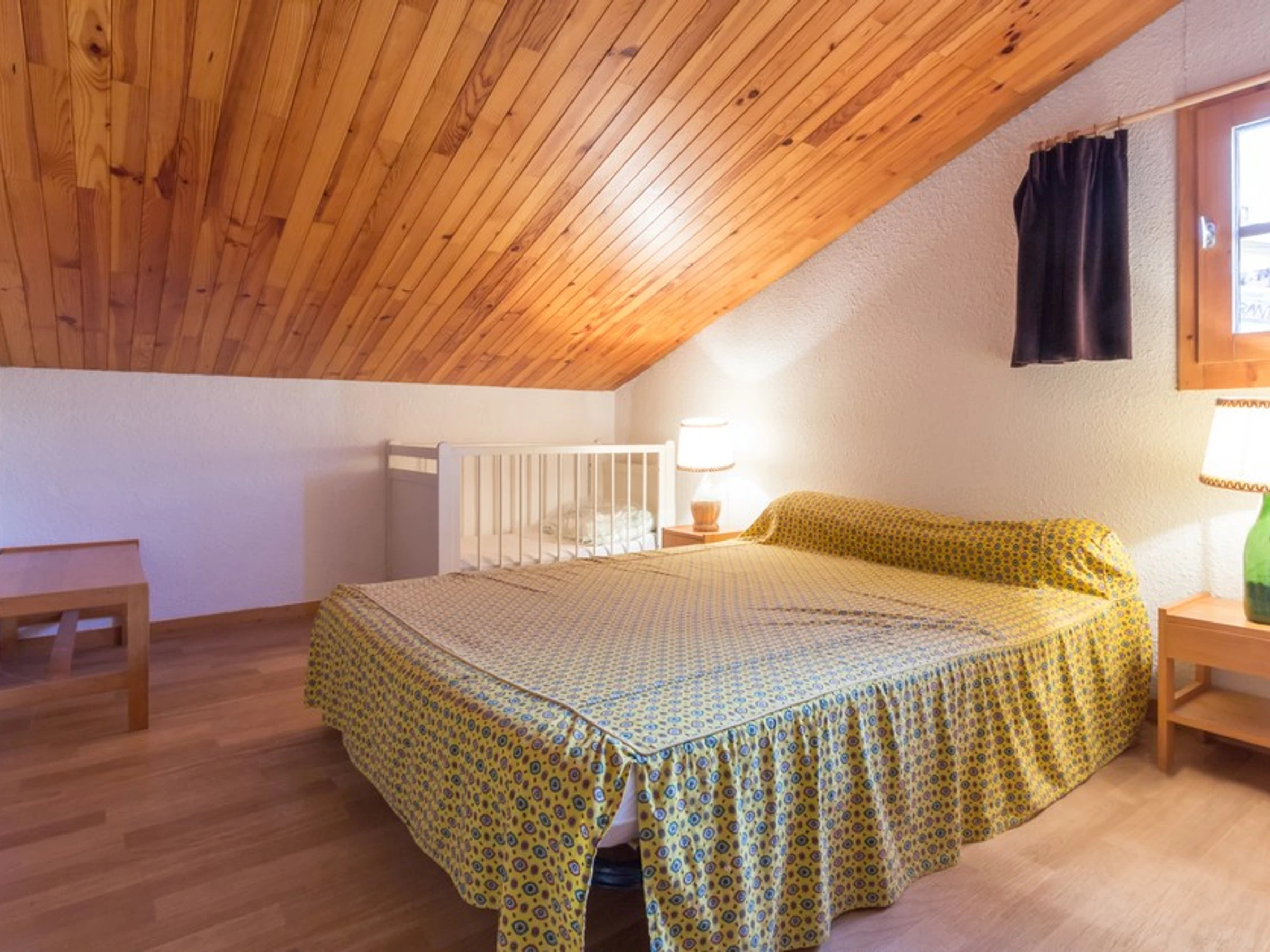 A l'étage vous disposez d'une mezzanine avec un ensemble lits superposés (interdit aux enfants de moins de 6 ans) et d'un lit simple, d'une chambre avec un grand lit et un lit bébé, d'une salle d'eau avec douche et WC.