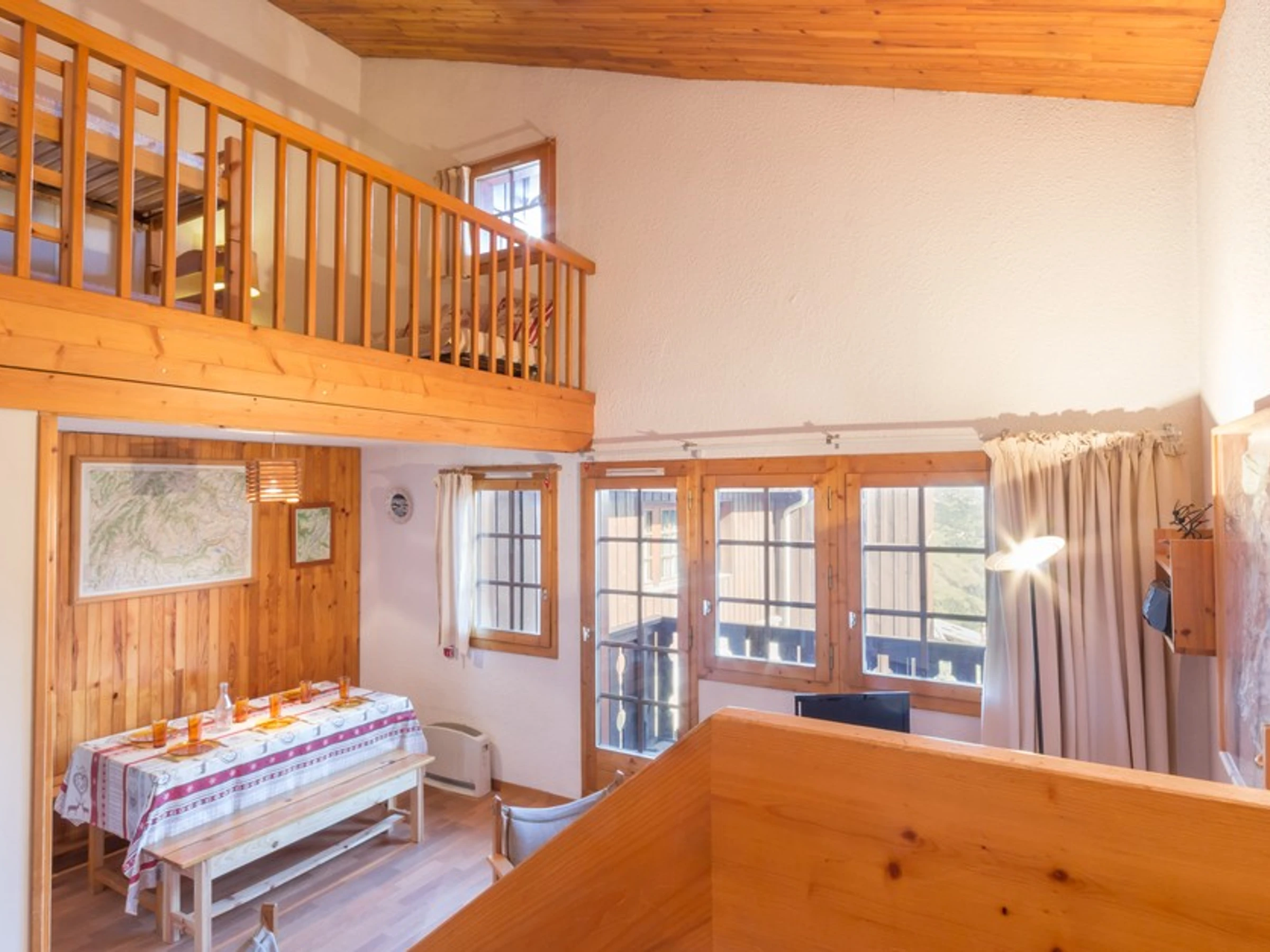 Cet appartement 3 pièces mezzanine en duplex au coeur du village se compose d'une cuisine indépendante équipée (plaques électriques, four, micro-ondes, cafetière, bouilloire, réfrigérateur avec petite partie congélateur 18 L et lave-vaisselle), d'une salle de bain avec baignoire et WC séparé.