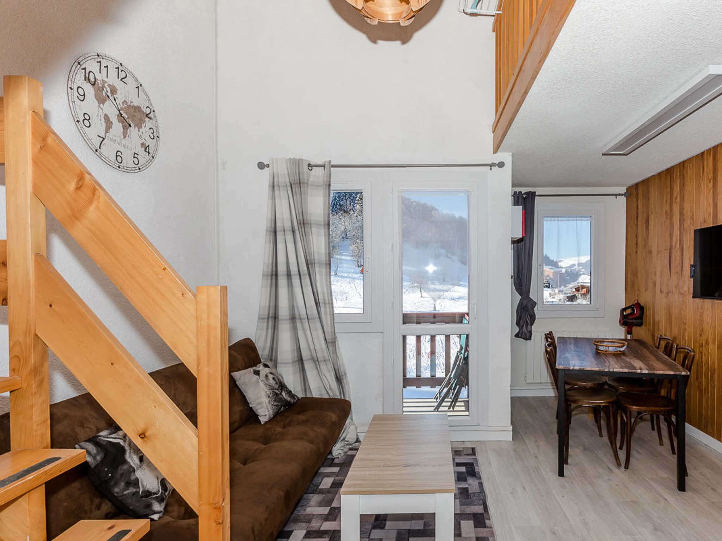 Un appartement 3 pièces + mezzanine en duplex équipé pour 5 personnes + 1 bébé ou jeune enfant, d'environ 50m², entièrement rénové, exposé sud/ouest avec balcon, vue village, vallée et pistes, au deuxième étage côté entrée et au troisième étage côté balcon.
