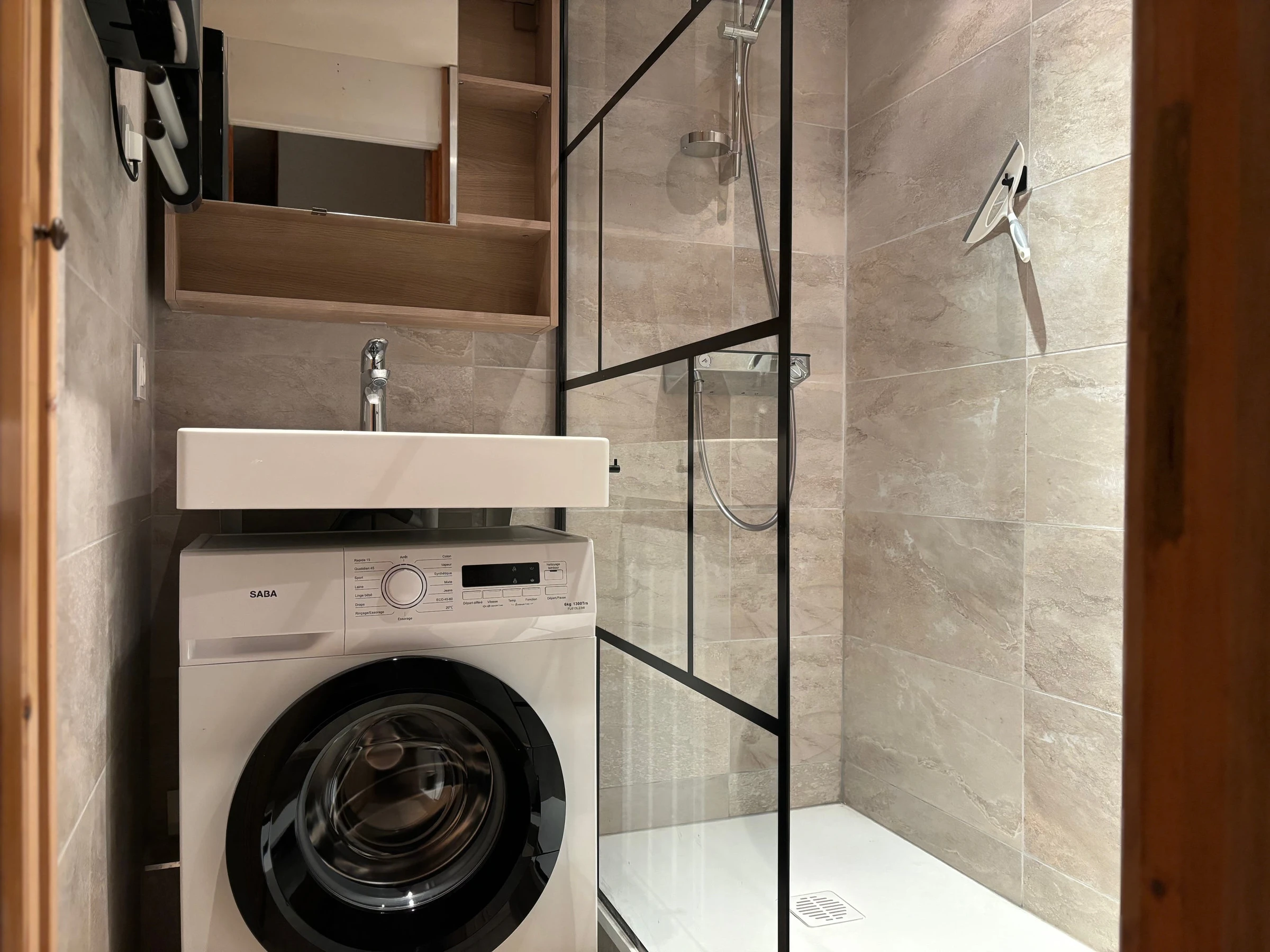Cuisine : 2 plaques à induction, petit réfrigérateur, lave-vaisselle, four électrique, micro-ondes, hotte, senseo et cafetière électrique.