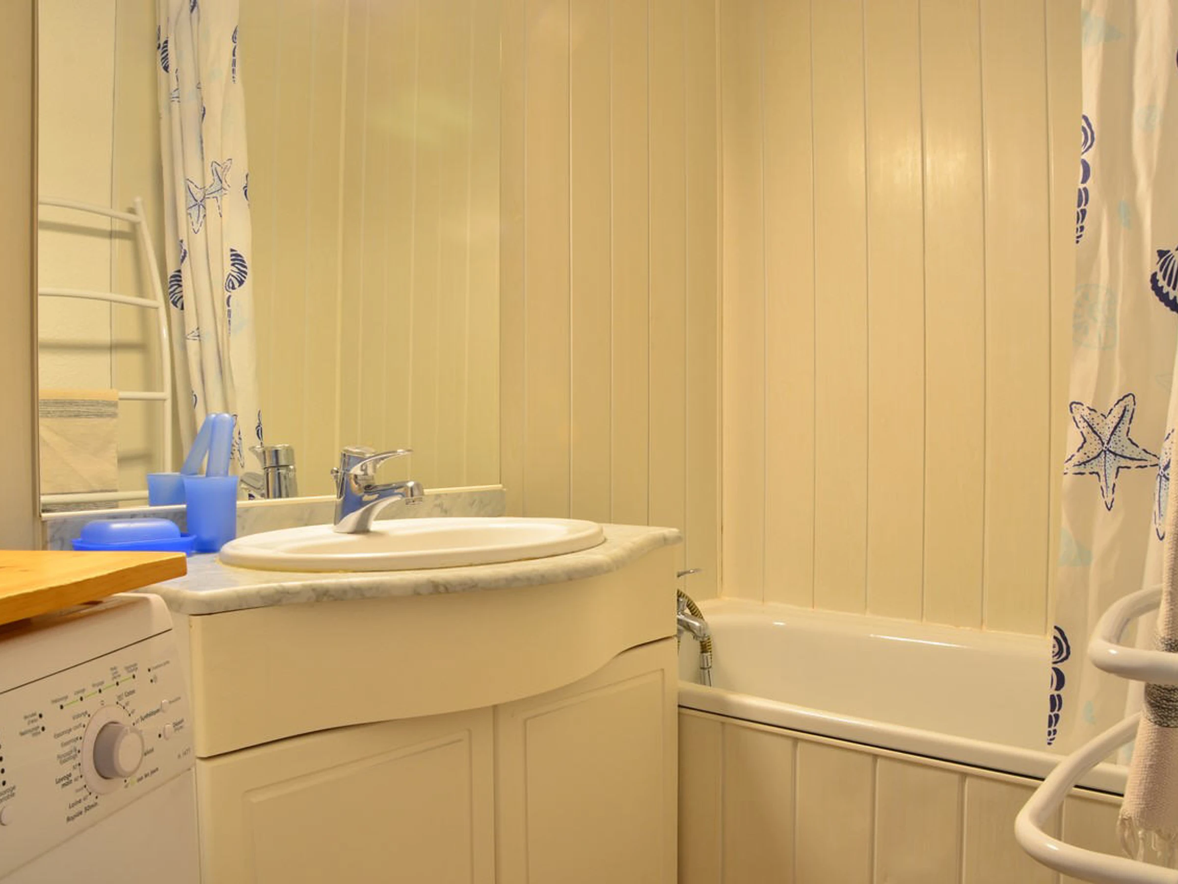 Salle de bains avec baignoire et lave-linge. WC séparés.