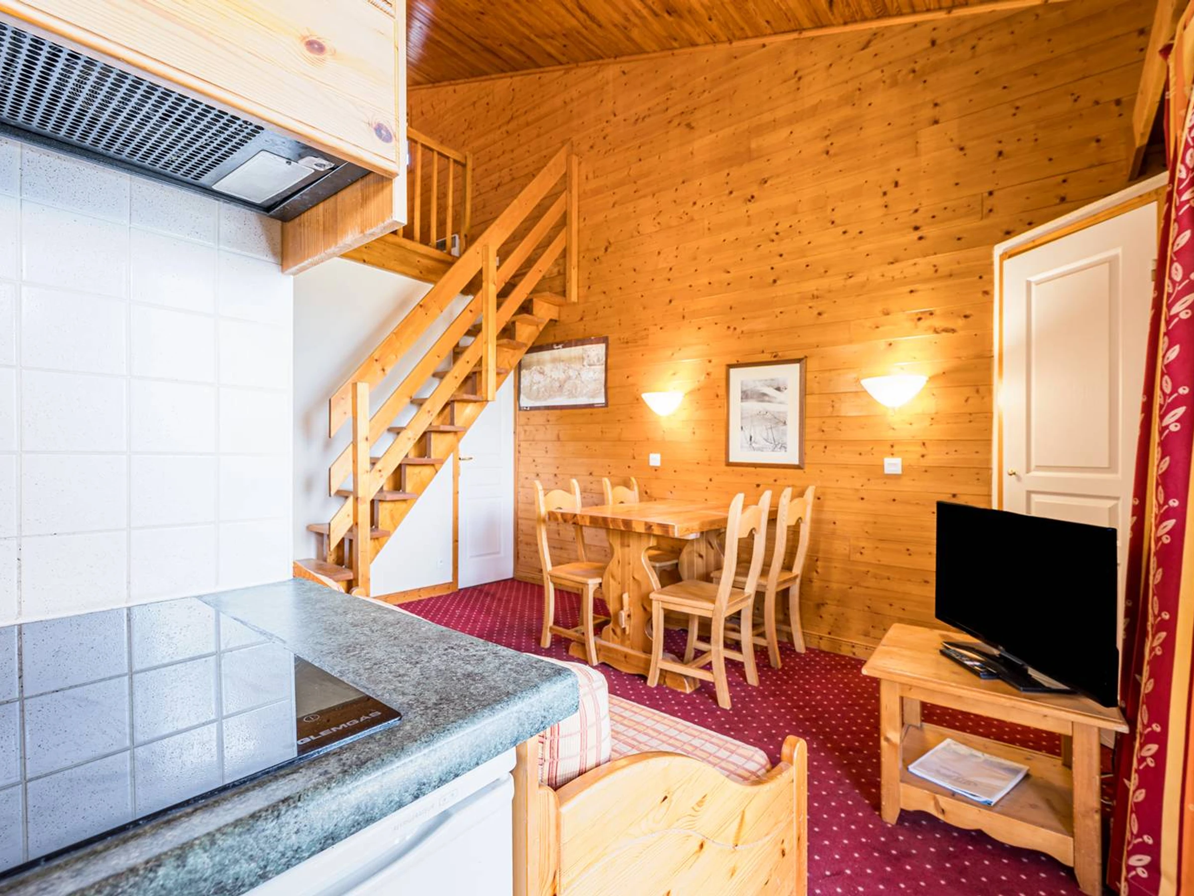 PLAGNE VILLAGES – Résidence Les Hameaux 1. Appartement 2 pièces (chambre mezzanine) avec balcon exposé nord. La résidence se trouve en centre station, idéalement située à proximité immédiate des pistes, de l'ESF, du télébus et des commerces.