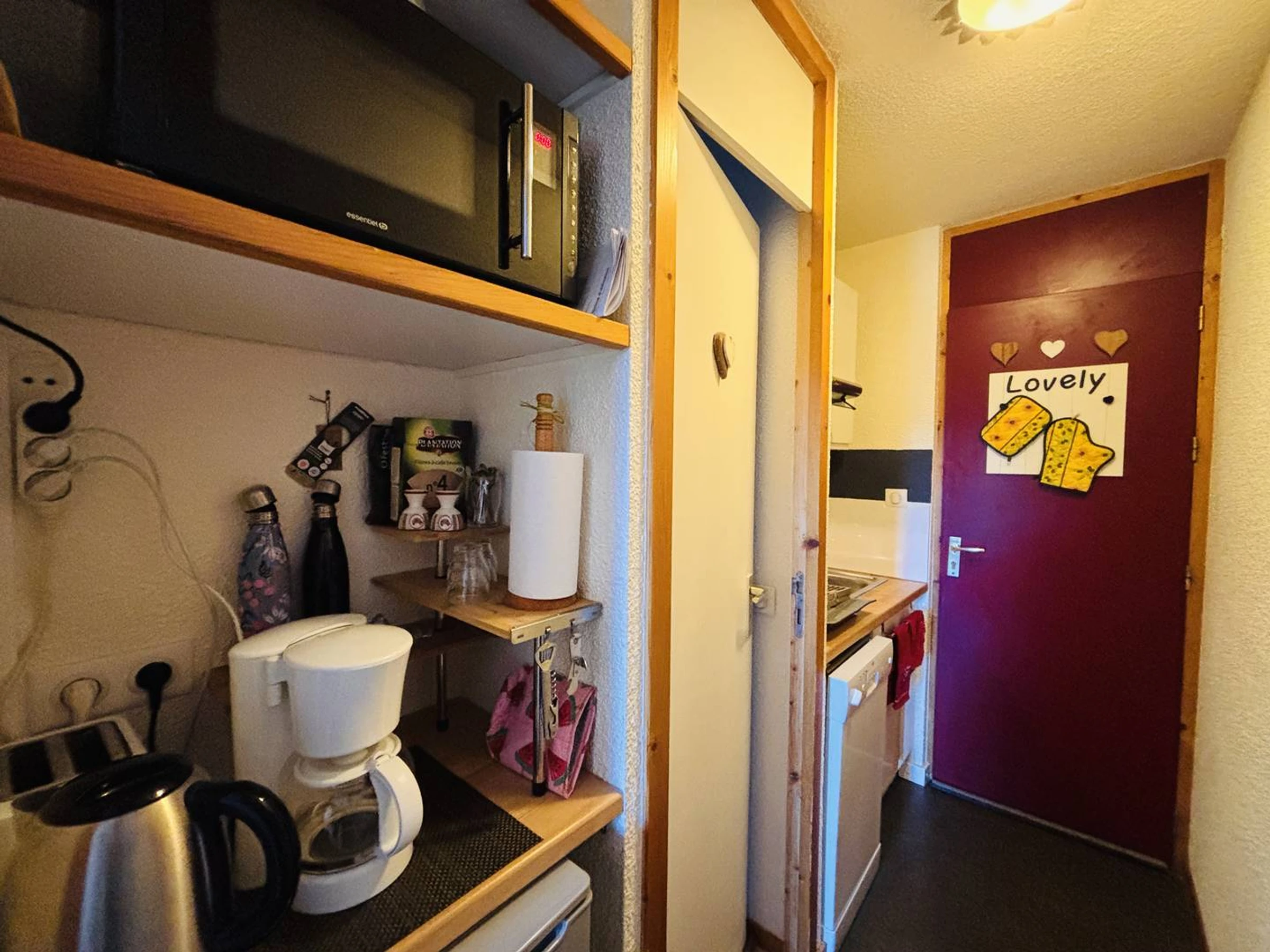 - une cuisinette dans l'entrée composée de 1 four mixte, 1 lave vaisselle, 2 plaques électriques, 1 réfrigérateur, 1 hotte, cafetière électrique, bouilloire, grille pain