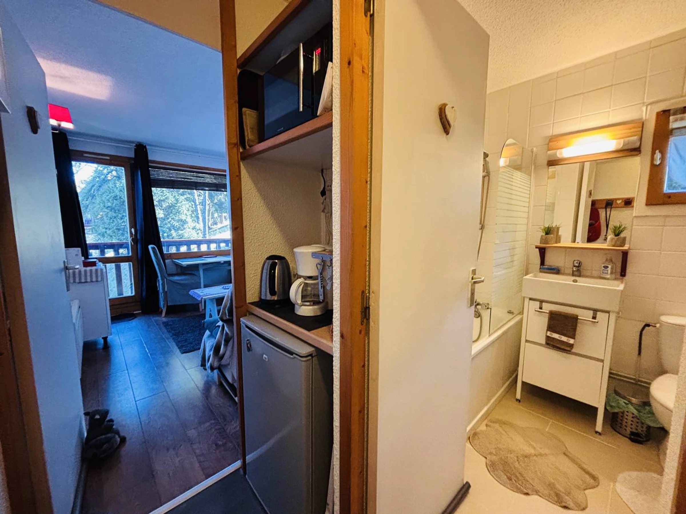 Ce studio de 17 m² est situé au 1er étage (sans ascenseur) et est équipé pour 2 personnes. Il comprend :