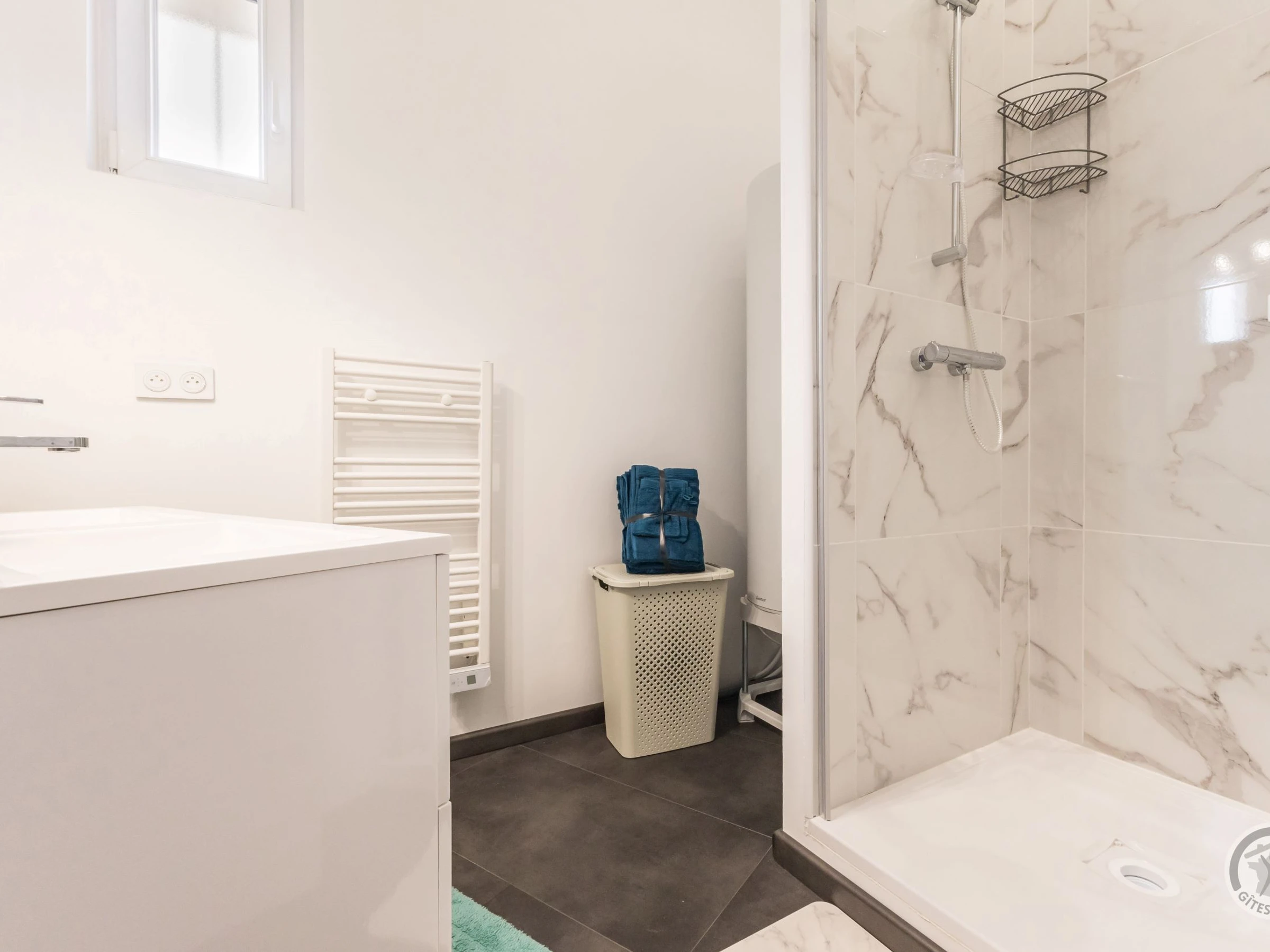 Local au rdc avec douche pour retour de plage, bac de rinçage, lave-linge et boules de pétanque.