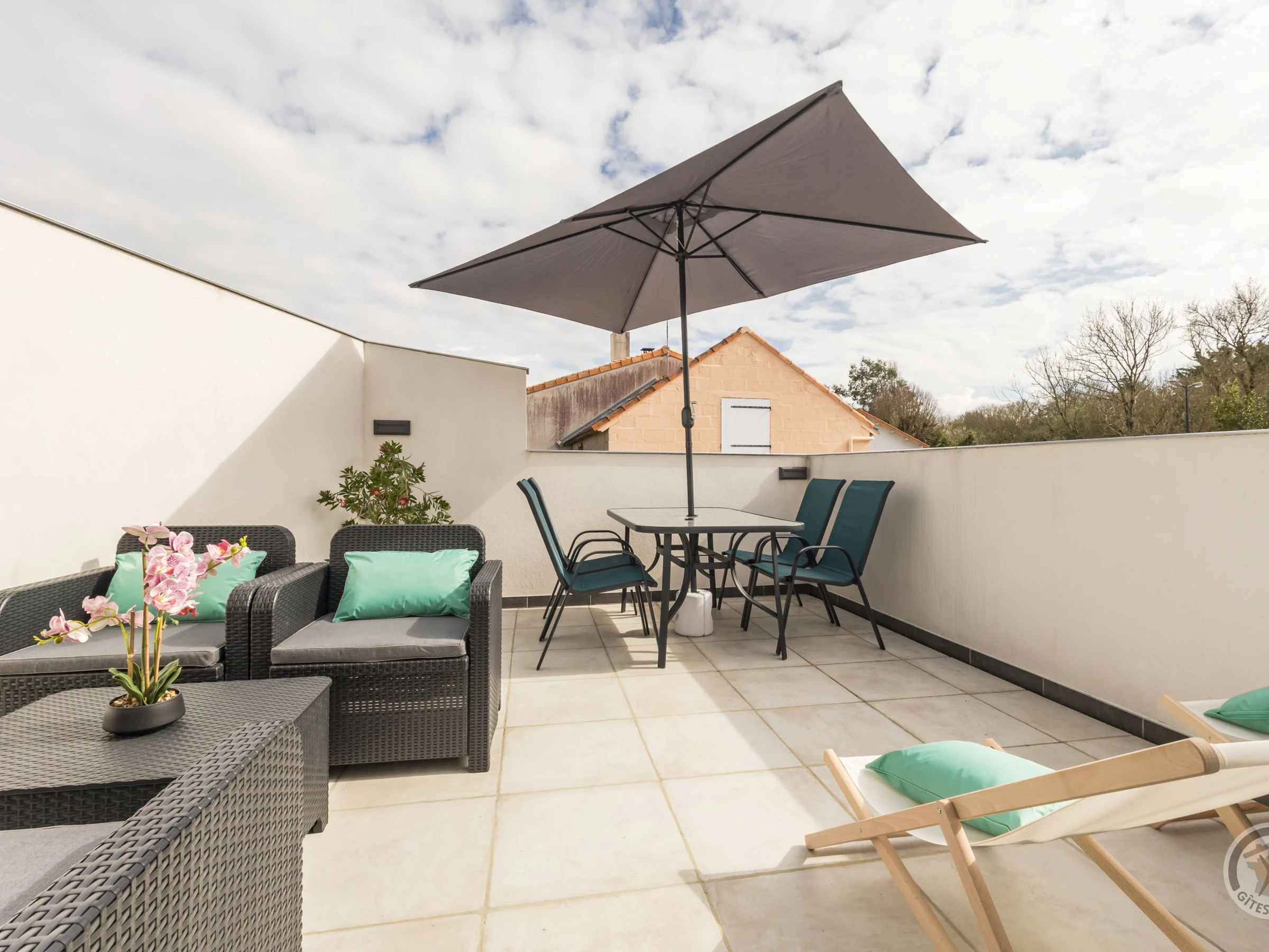 Terrasse de 16 m² (orientée Sud/Est) avec salon de jardin, salon de détente et transats.