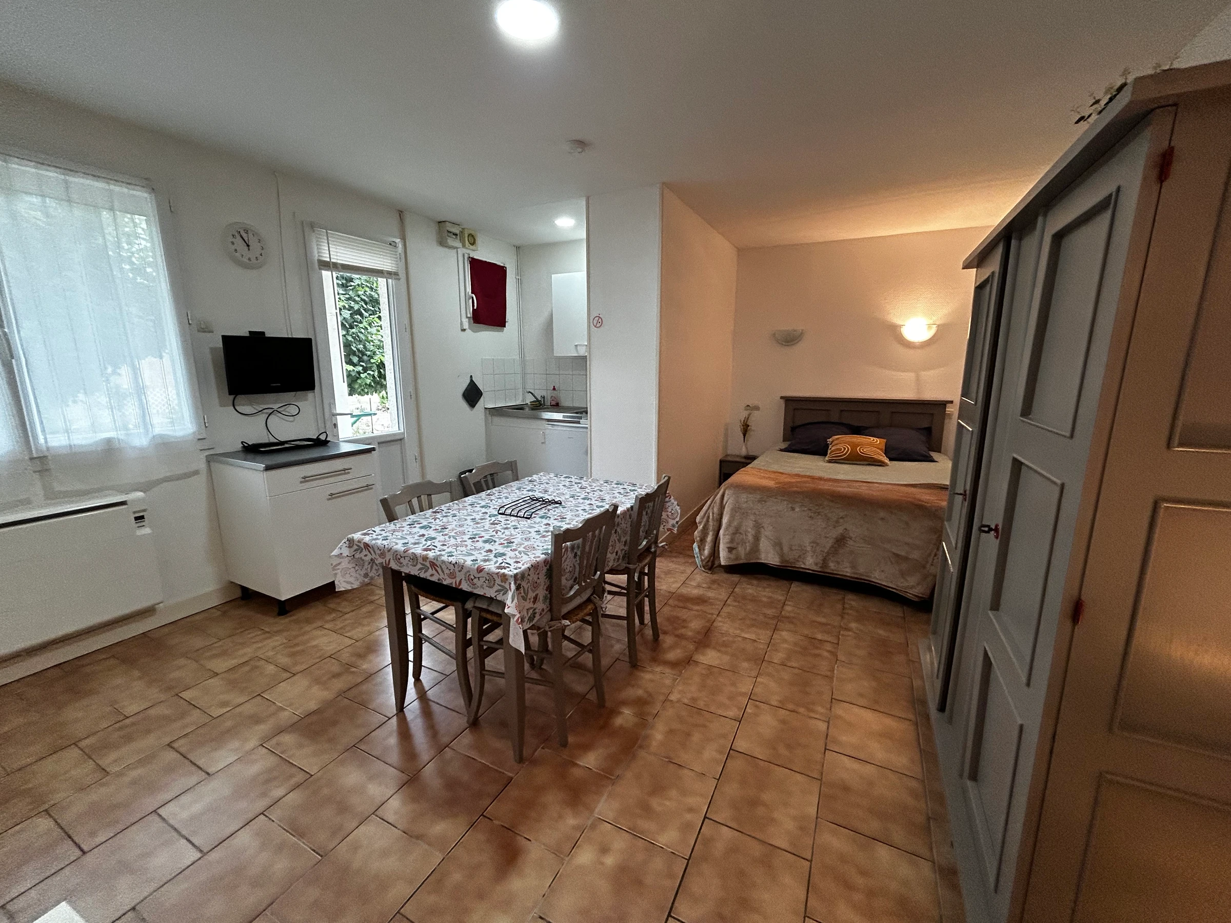 Ce logement se compose d'une pièce à vivre disposant d'un coin salle à manger, kitchenette équipée, 1 lit de 140*190, une salle d'eau avec douche, lavabo et WC.