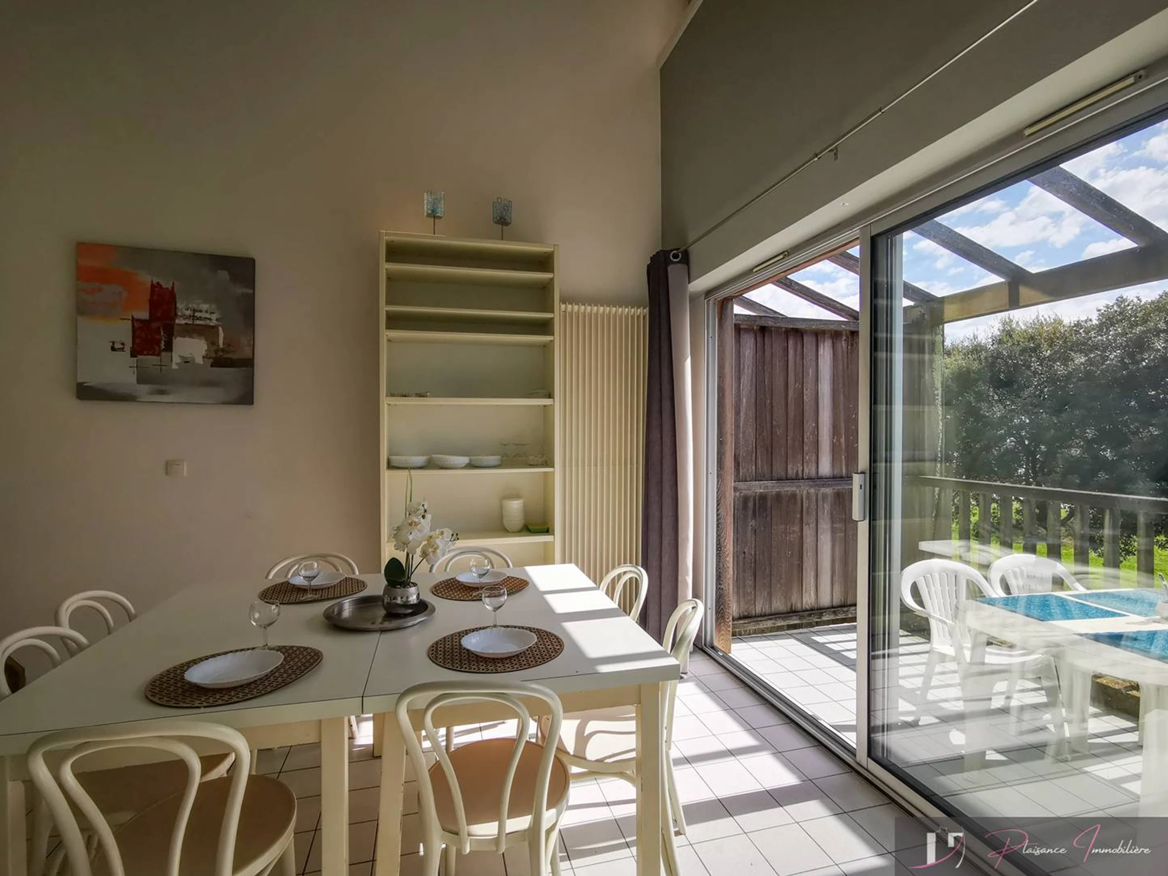 Bel appartement aménagé pour 8 personnes au 1er étage avec très belle vue sur l'océan et les Îles. Entrée, séjour avec convertible deux places, 1 chambre avec 1 lit 2 places, 1 chambre avec 2 lits 1 place, 1 chambre en mezzanine avec 1 lit 2 places, kitchenette équipée (four, réfrigérateur, 4 feux gaz, lave-linge, lave-vaisselle). La baie vitrée du séjour donne sur un balcon avec salon de jardin. Parking privé. .