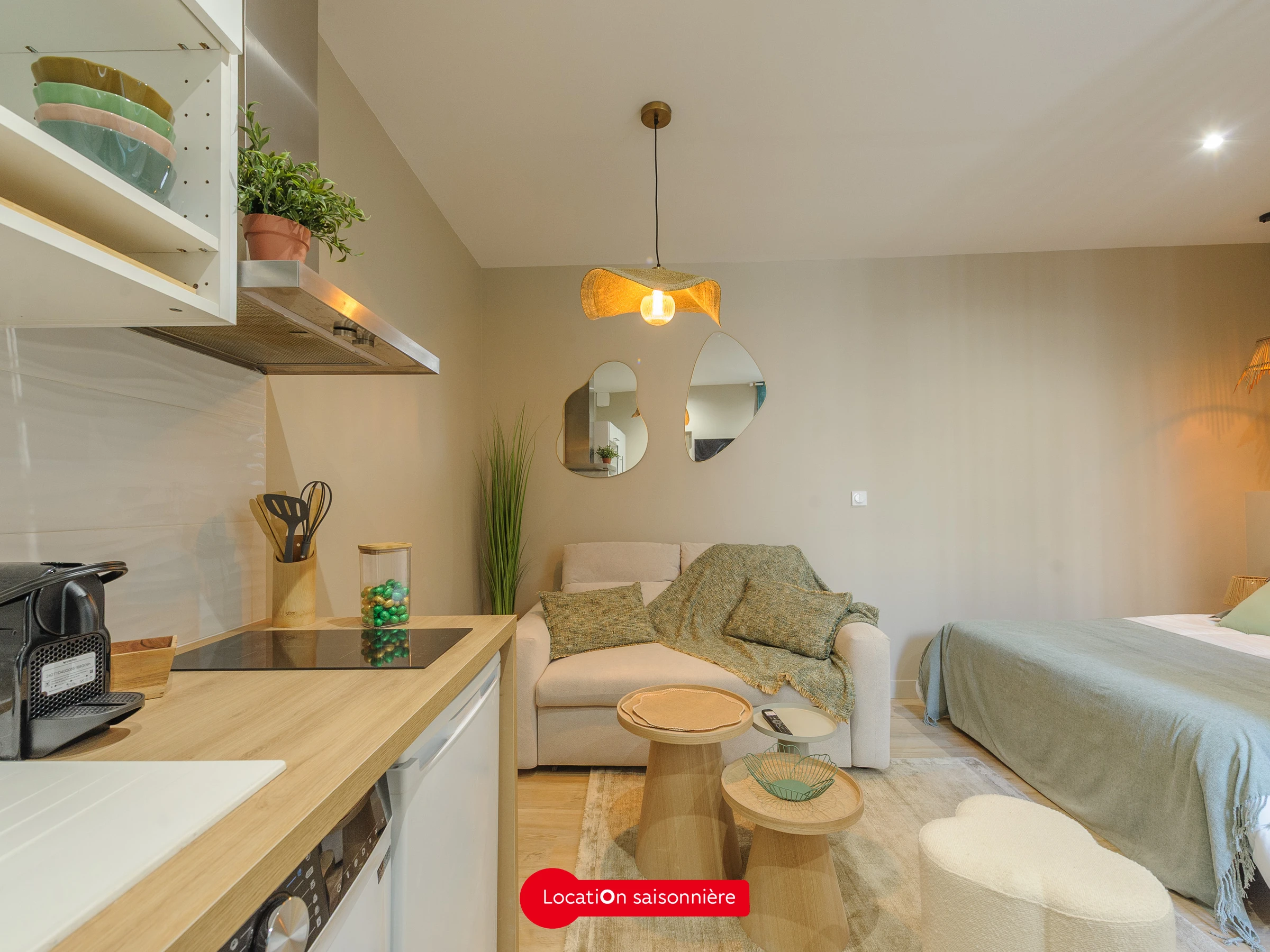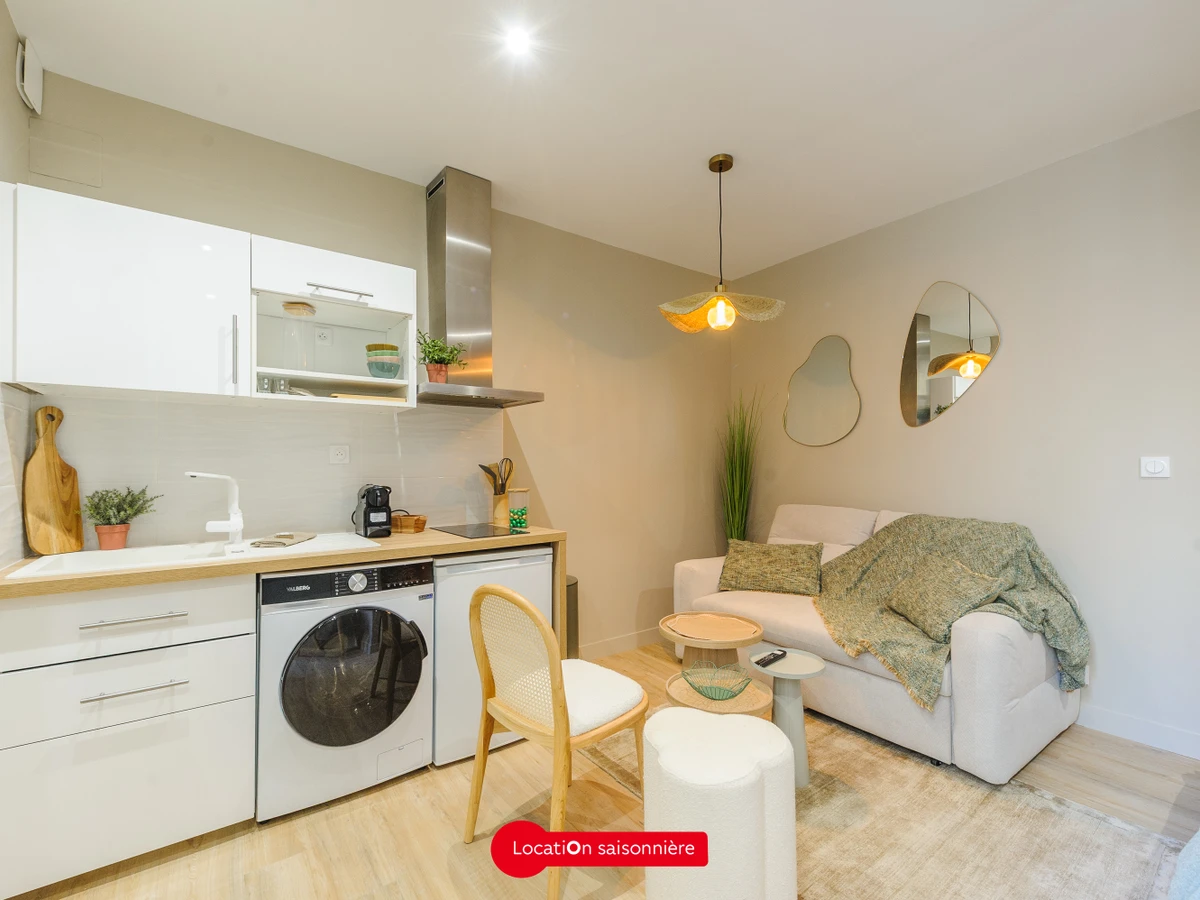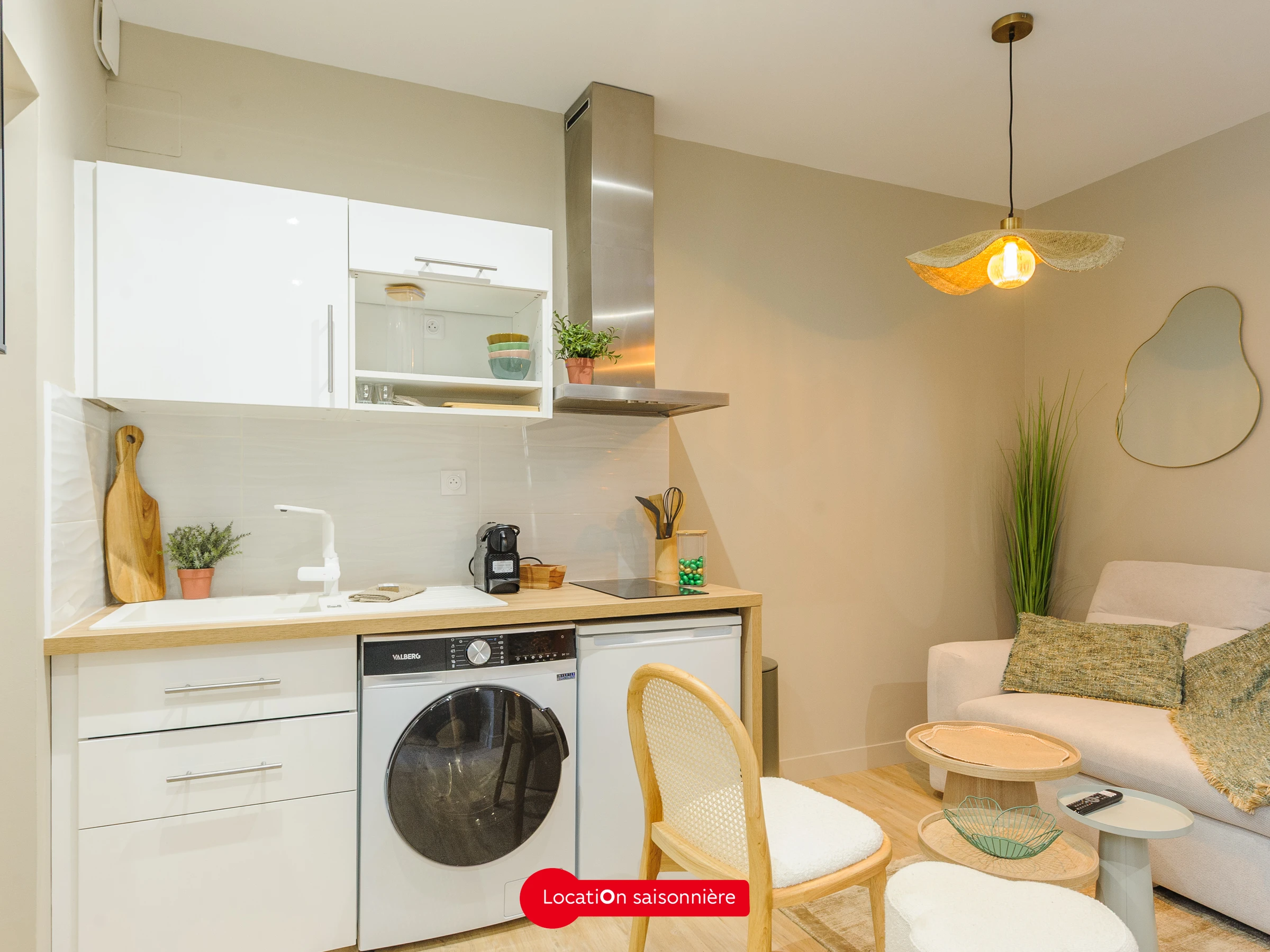Le coin cuisine est entièrement équipée (plaque induction, micro-onde, bouilloire, cafetière espresso capsules, grille-pain,..) et un lave linge. La partie salon comprend un canapé confortable.
