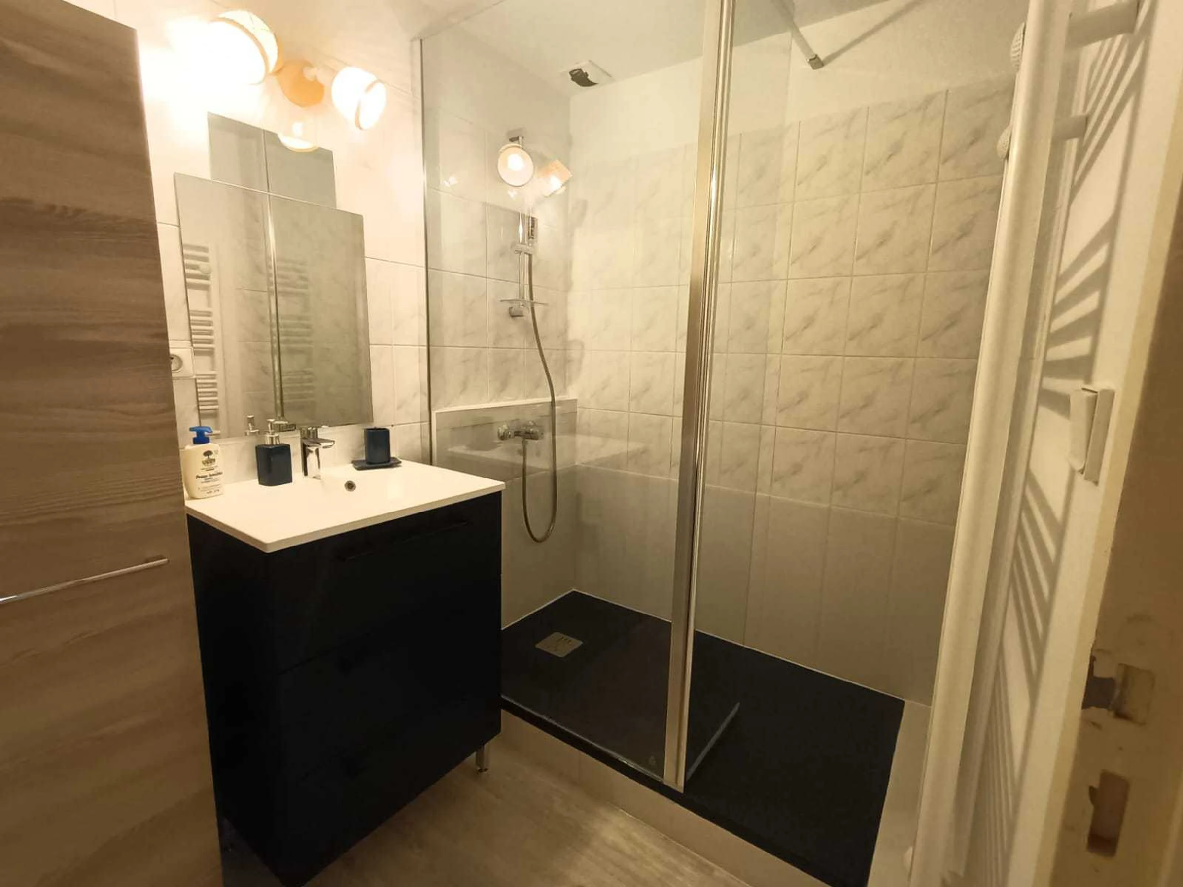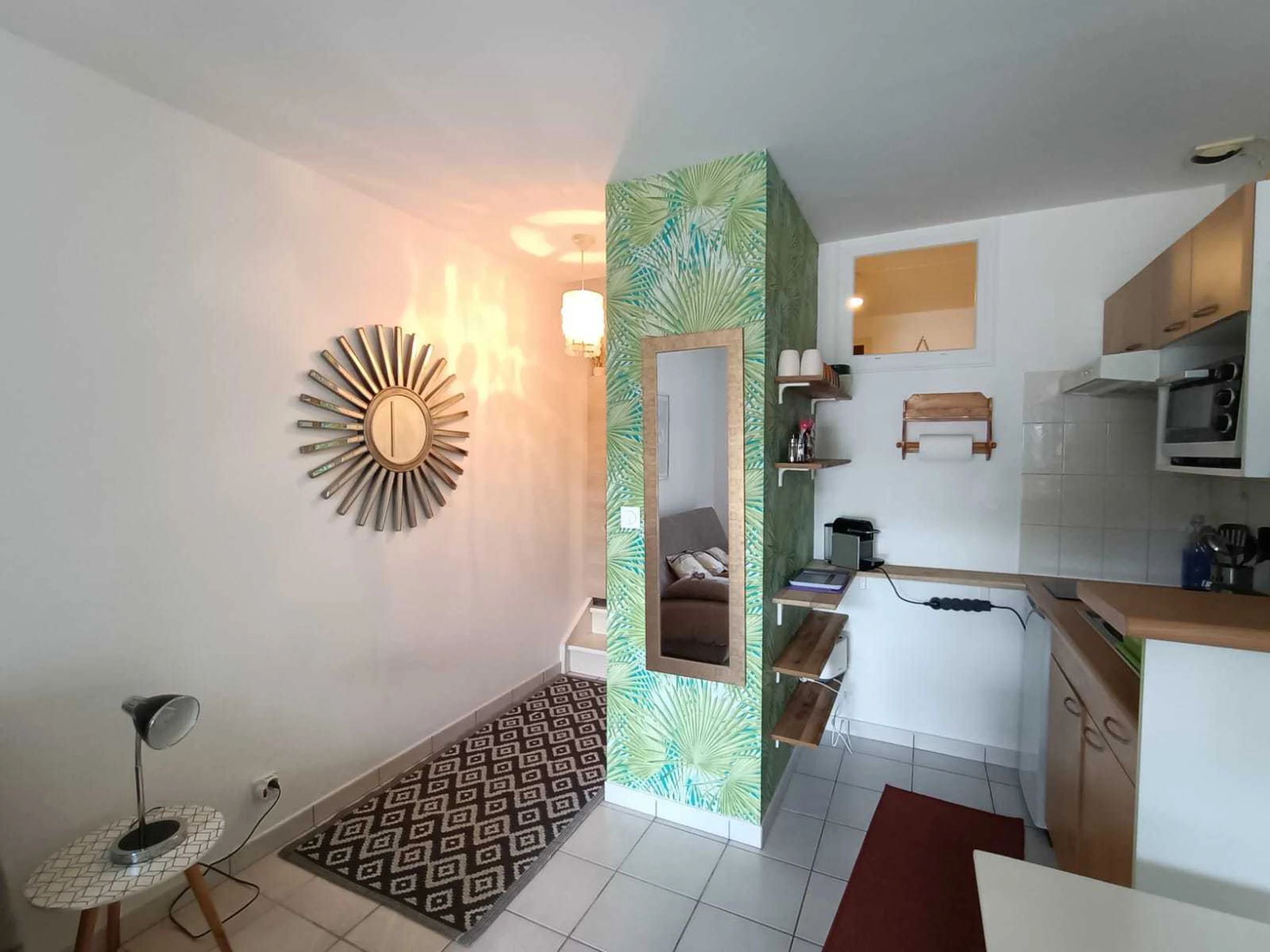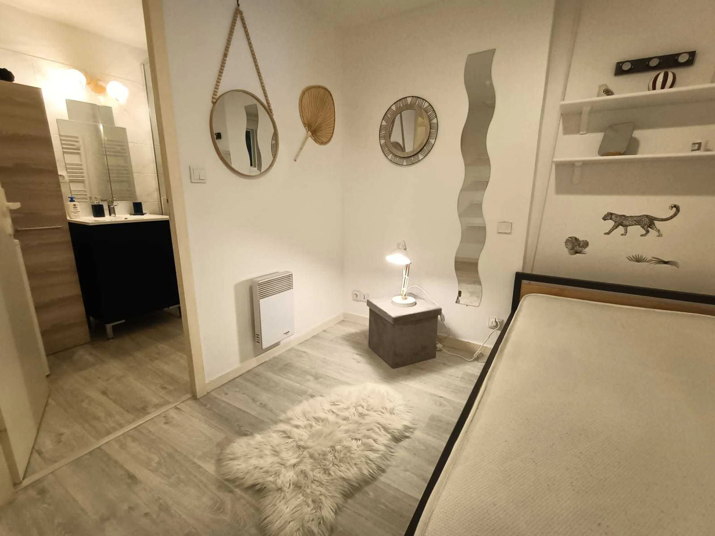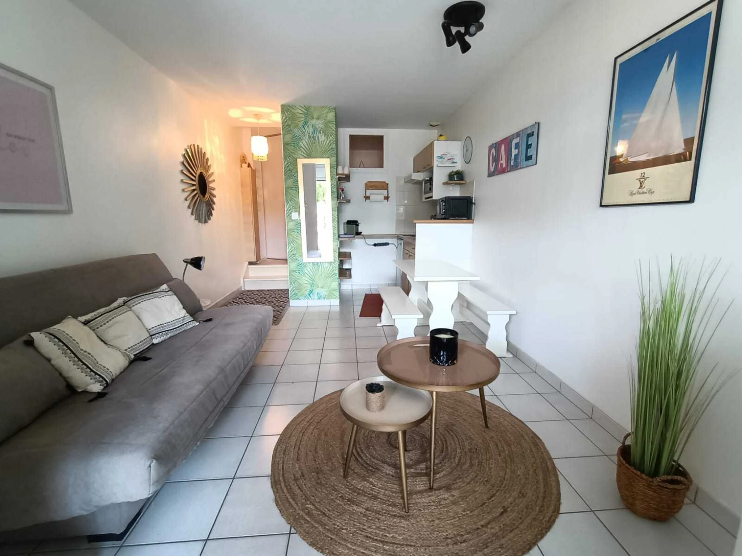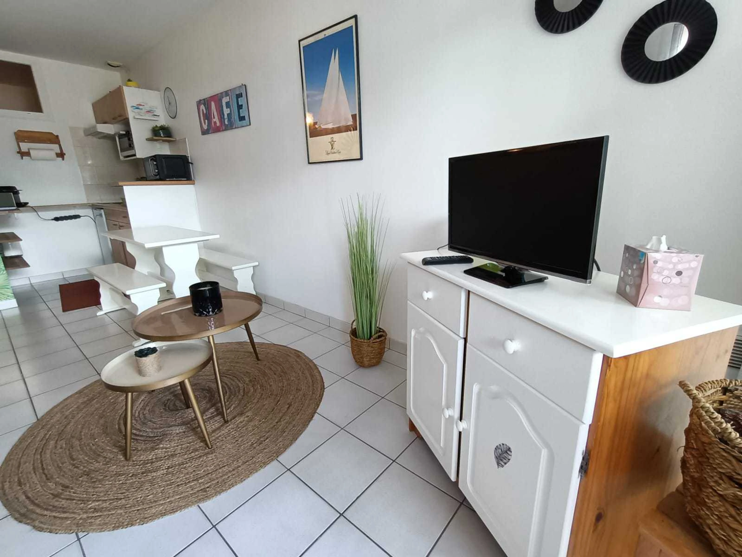 Vous serez séduits par ce grand studio cabine pour 4 personnes en rez de plage avec grande baie vitrée vue mer, comprenant un séjour avec convertible 2 personnes en 140cm, une kitchenette équipée (réfrigérateur, 2 plaques, four), un coin cabine avec 2 lits gigognes en 90cm, une salle de bains avec machine à laver et des WC séparés.