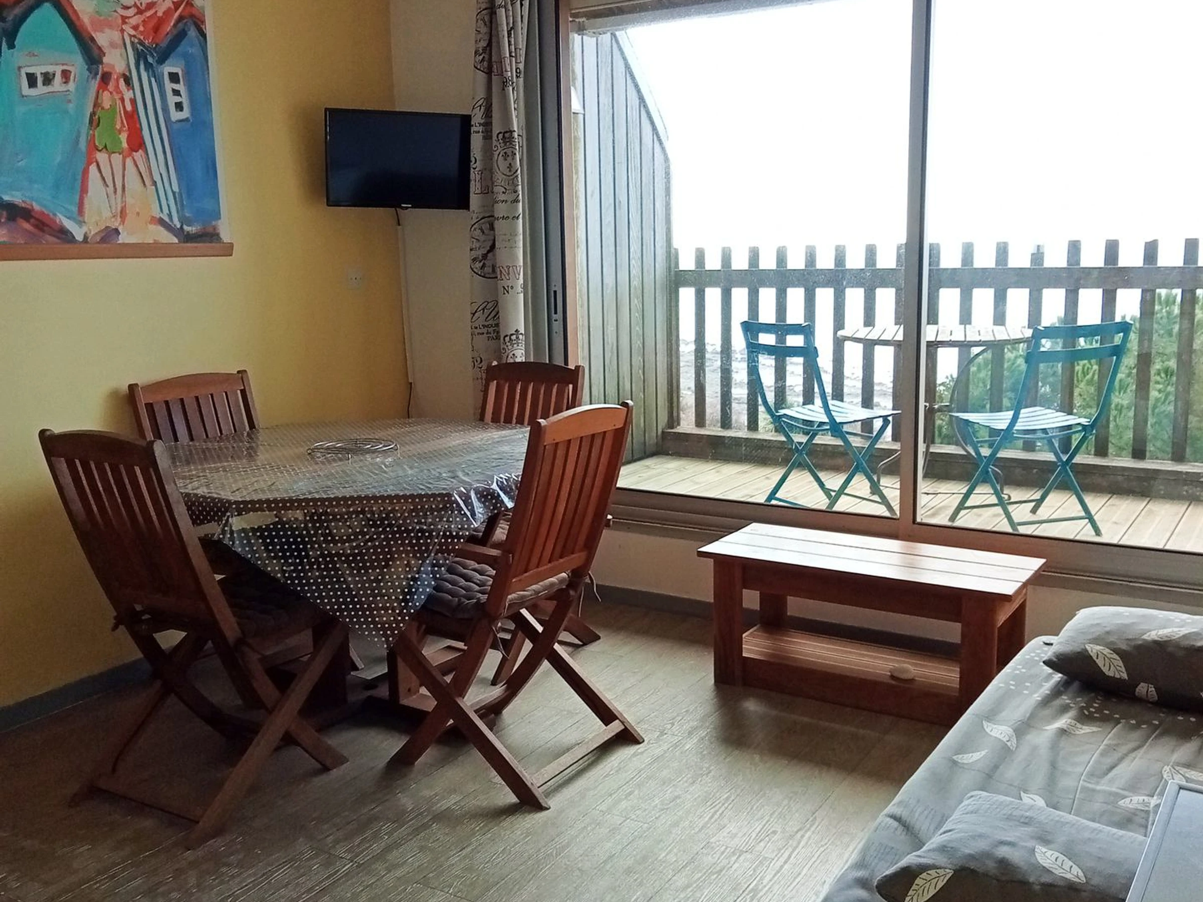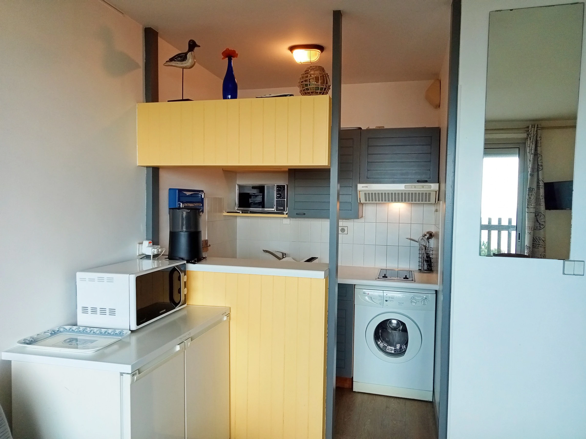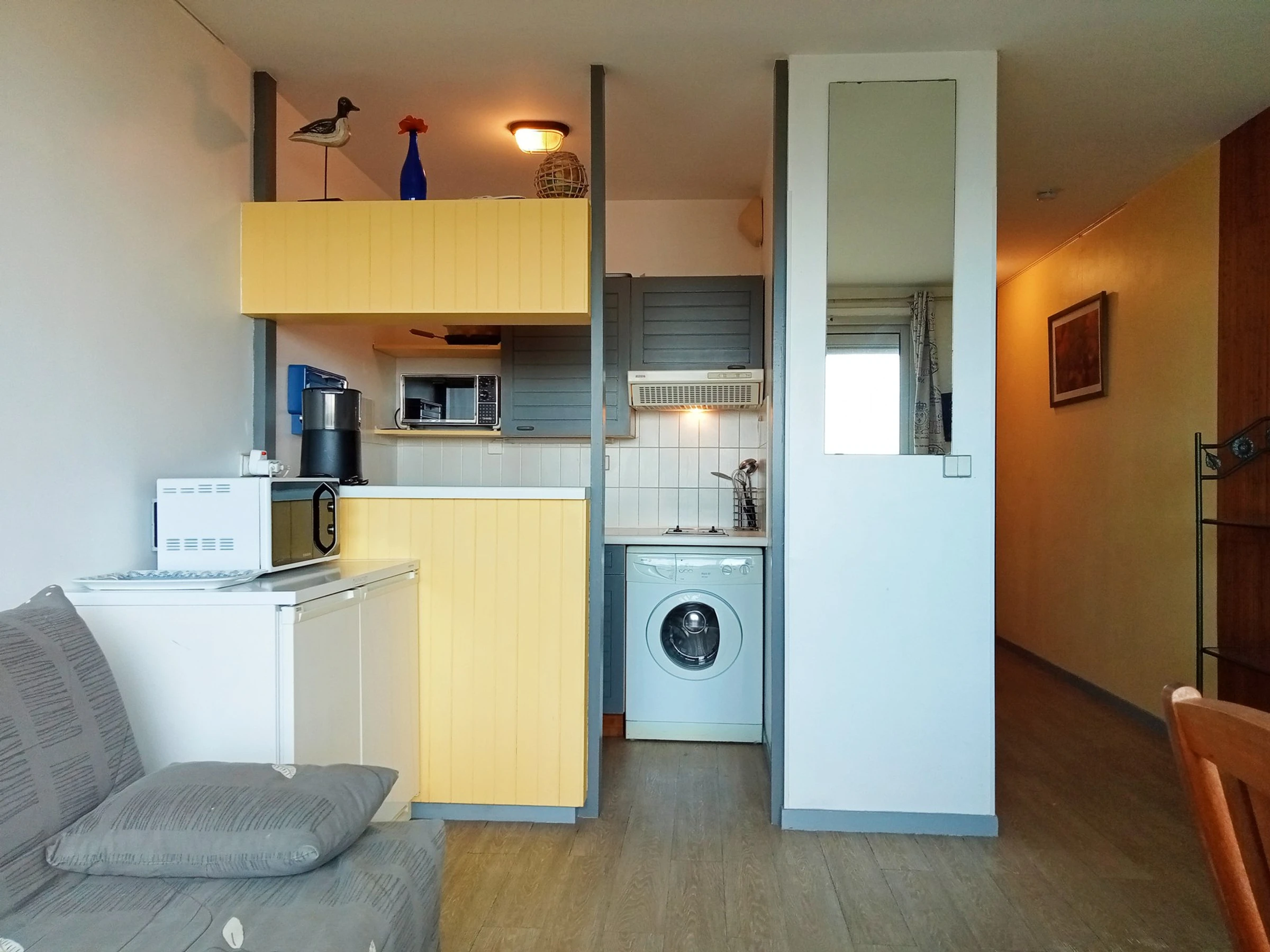 Bel appartement pour 4 personnes, situé au 1er étage avec ascenseur, comprenant : une entrée, un coin repos avec un lit de 140cm, un séjour avec un convertible pour 2 personnes en 140cm et une double baie vitrée ouvrant sur le balcon, une kitchenette équipée (2 plaques électriques, réfrigérateur-congélateur, mini four, micro-ondes, lave-linge), une salle de bains avec WC.