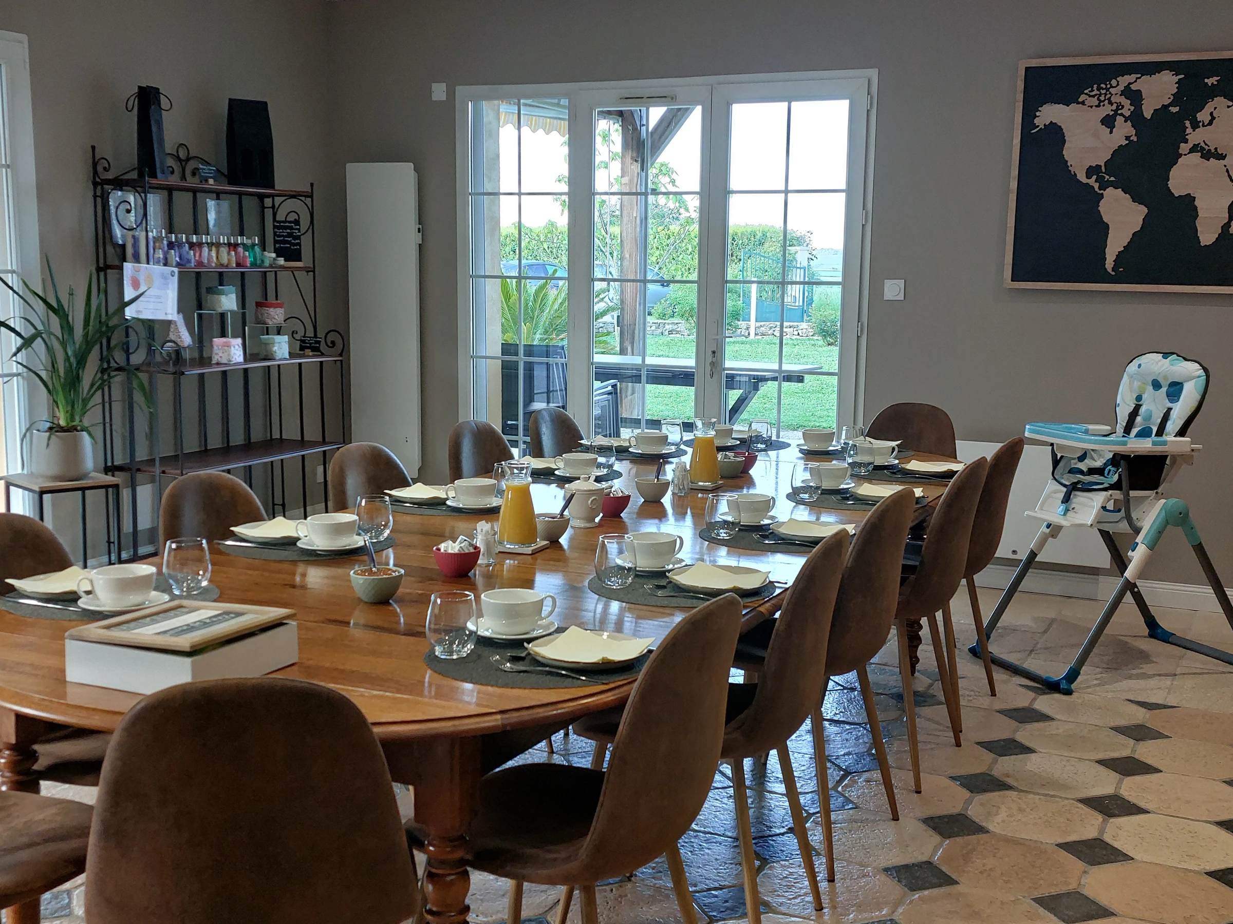 Les petits déjeuners et la table d’hôtes (35€/pers : apéritif, entrée, plat, fromages et dessert) sont servis à la table commune ou aux beaux jours sur la terrasse pour profiter du cadre et de la nature environnante.