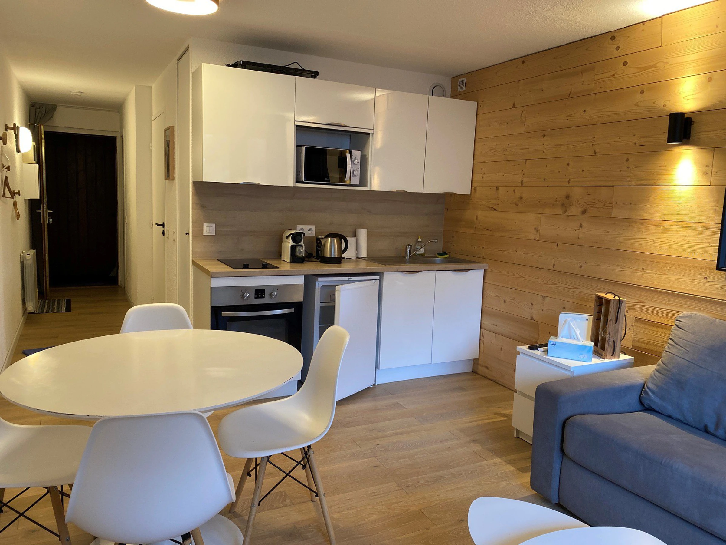 Coin cuisine avec plaques vitrocéramiques, réfrigérateur, four, four micro onde, , et cafetière NESPRESSO.
