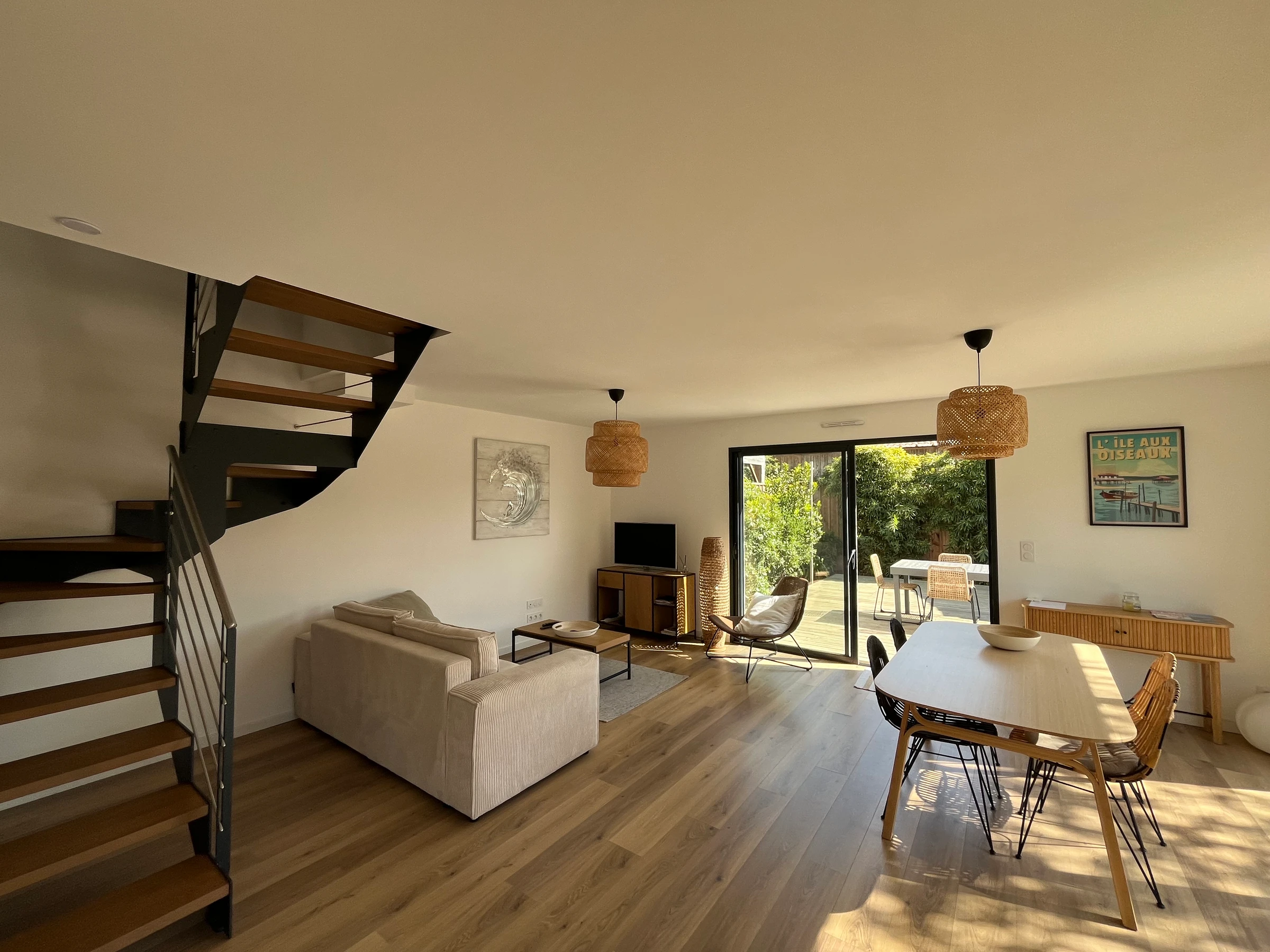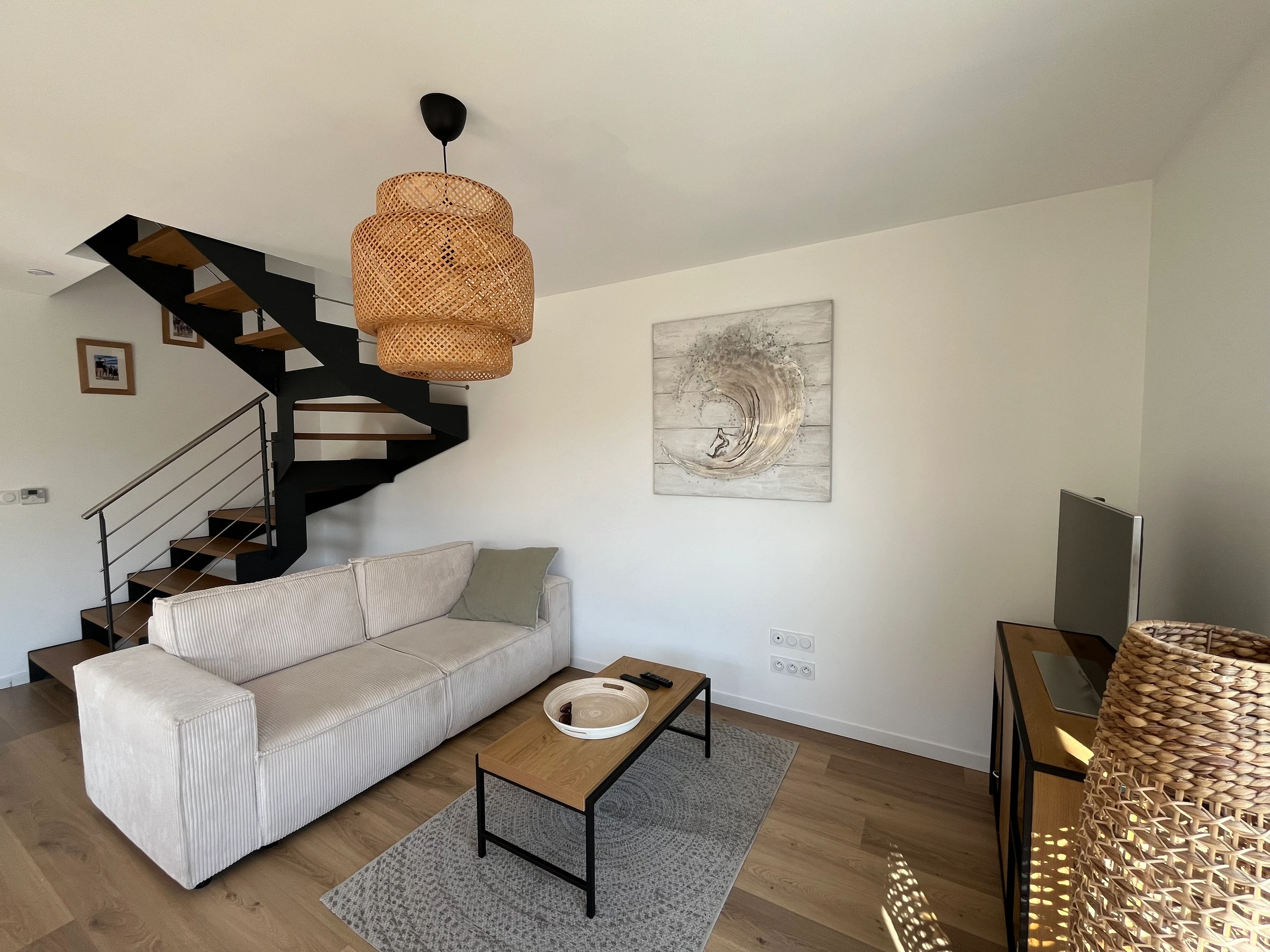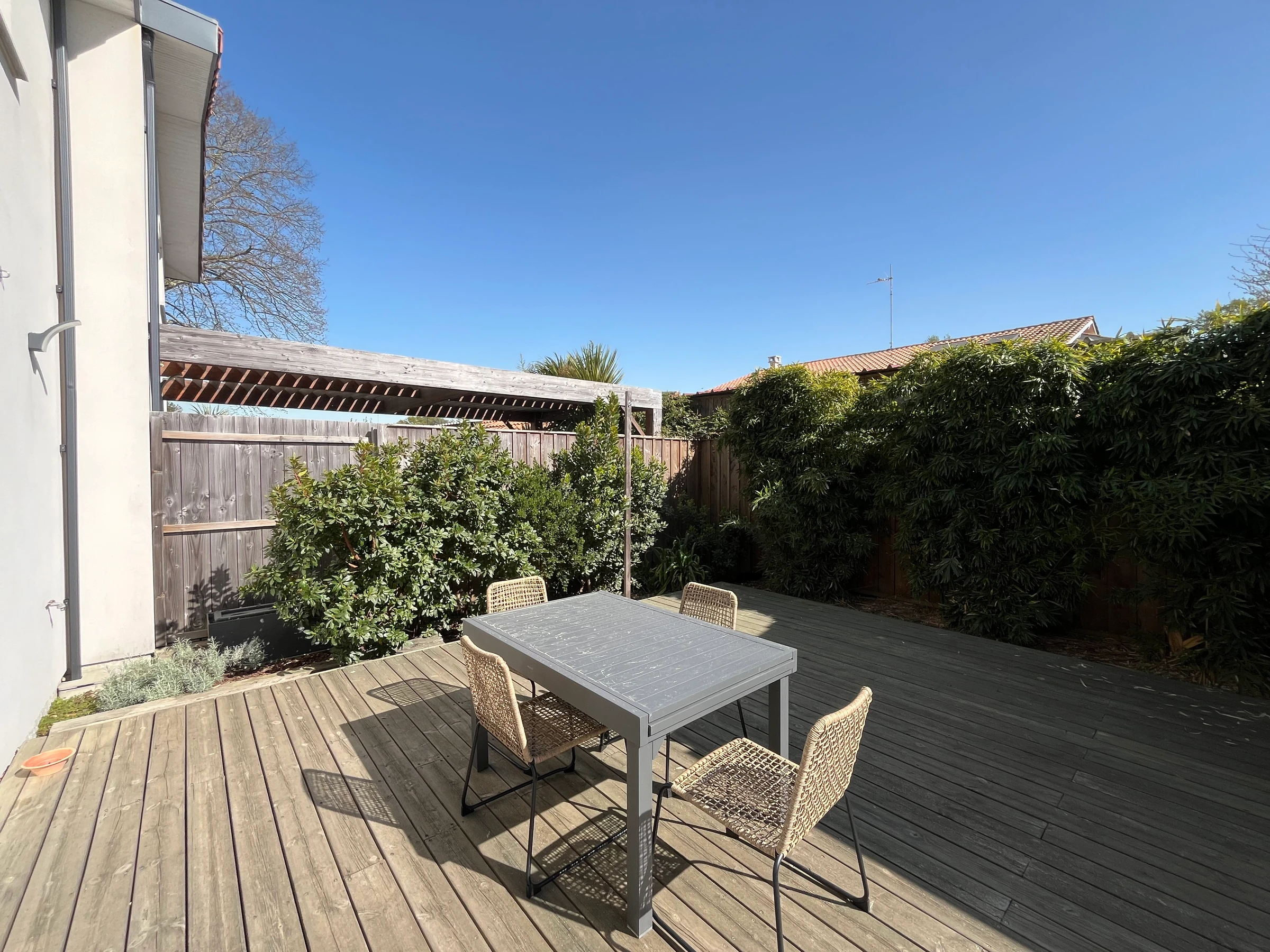 Une entrée avec buanderie avec son lave linge. Sa pièce à vivre avec TV et WIFI donnant sur la terrasse où vous pouvez profiter des repas en extérieur en famille ou entre amis, accompagnée de sa plancha.