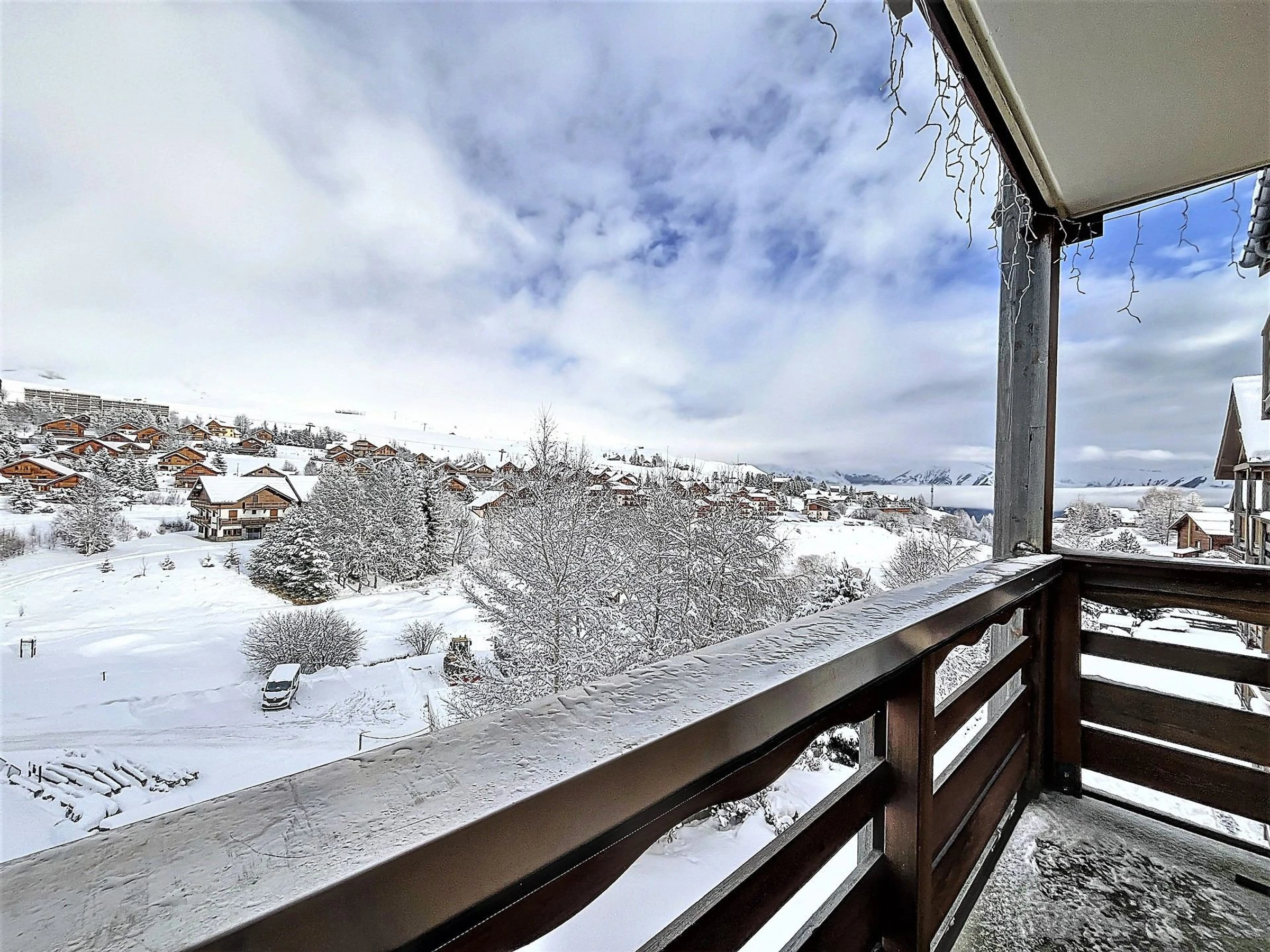 Appartement cosy avec grand Balcon vue sur les pistes et la station, place de parking privative, à 150m du centre de la Station et 500m des pistes.