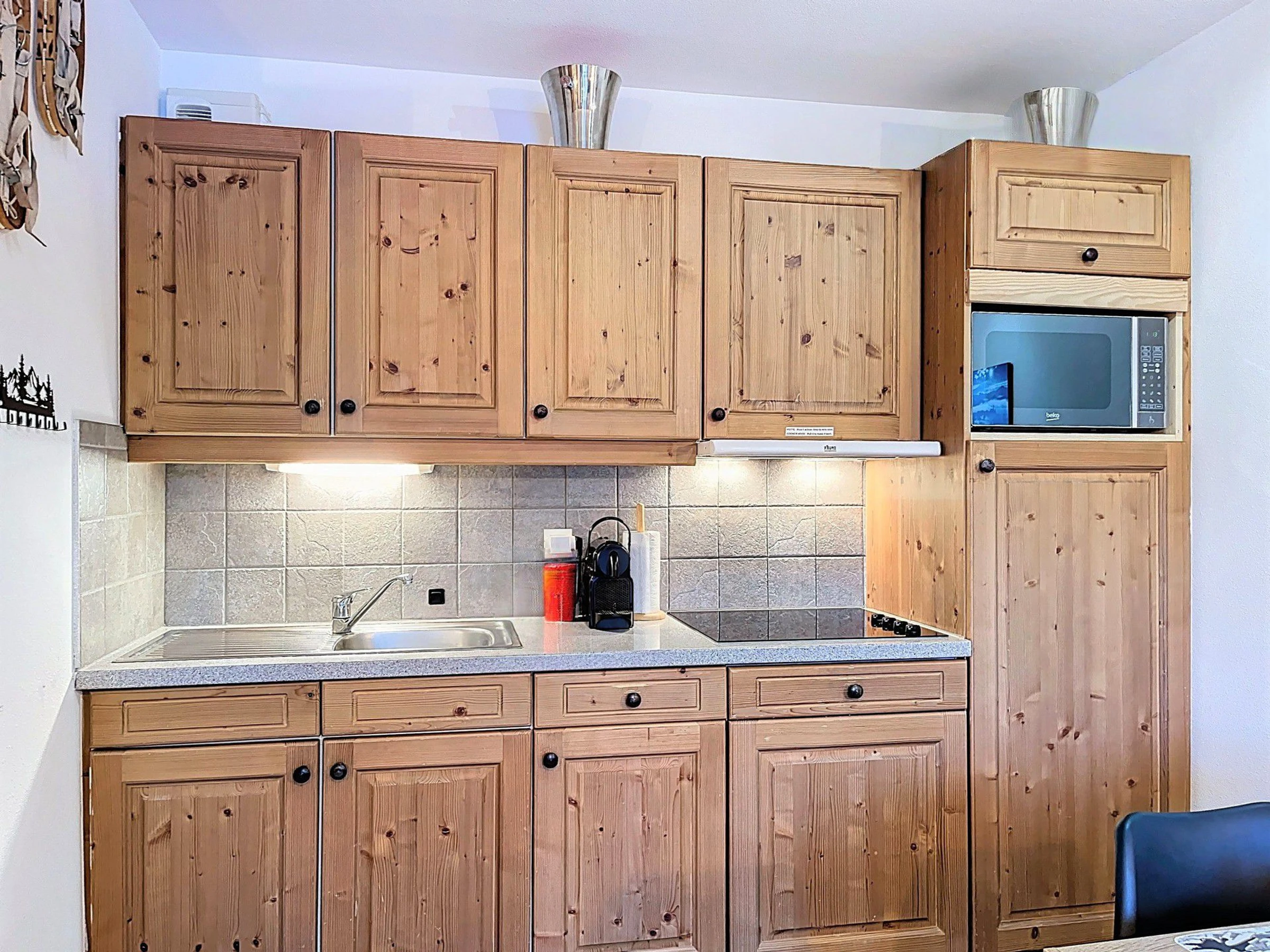 Le coin cuisine ouvert sur le séjour est équipé de plaques vitrocéramiques, un four micro-ondes combiné, d'une cafetière électrique et une Nespresso®, grille pain, bouilloire, un appareil à raclette, un réfrigérateur avec freezer et un lave vaisselle.