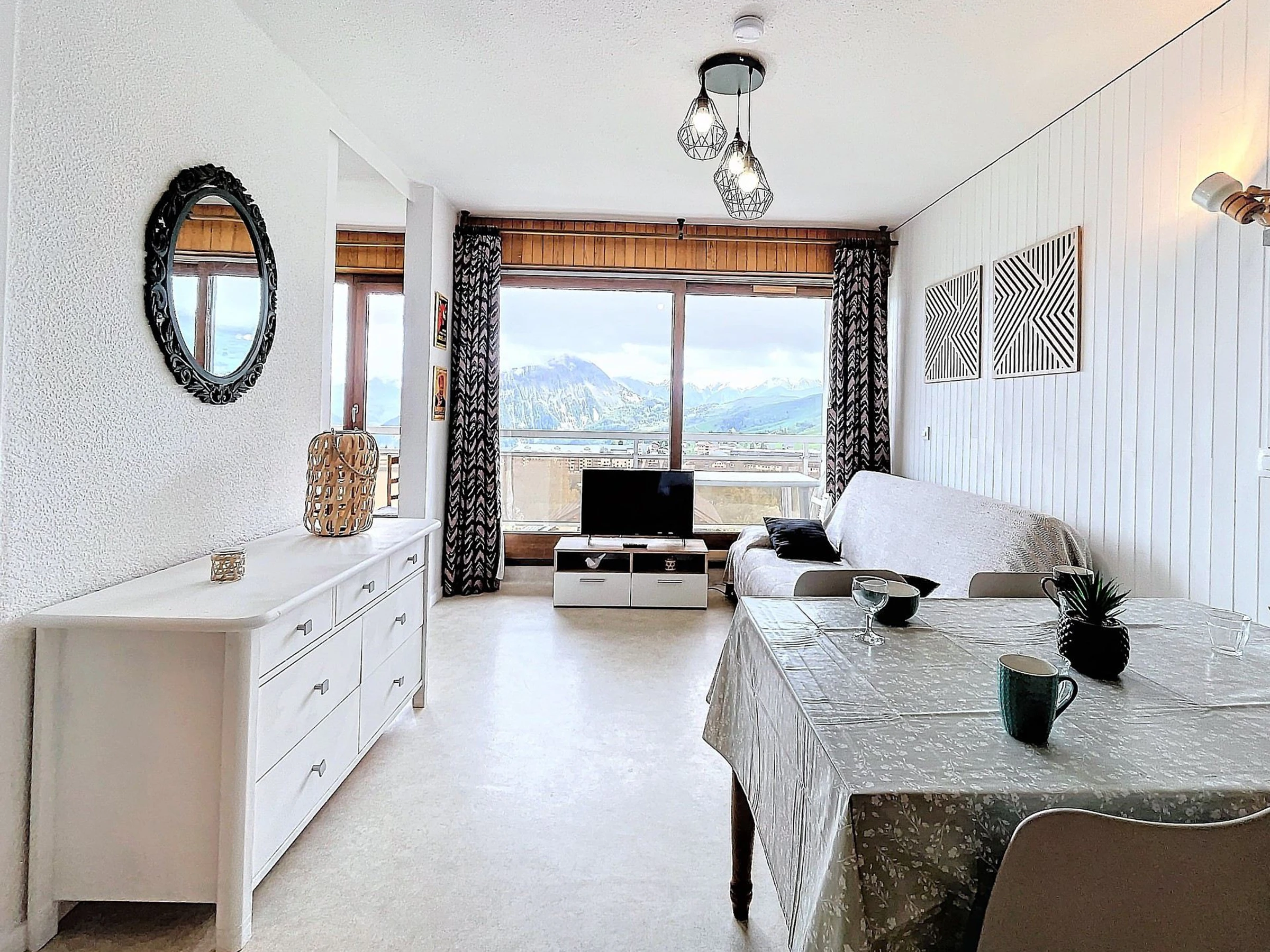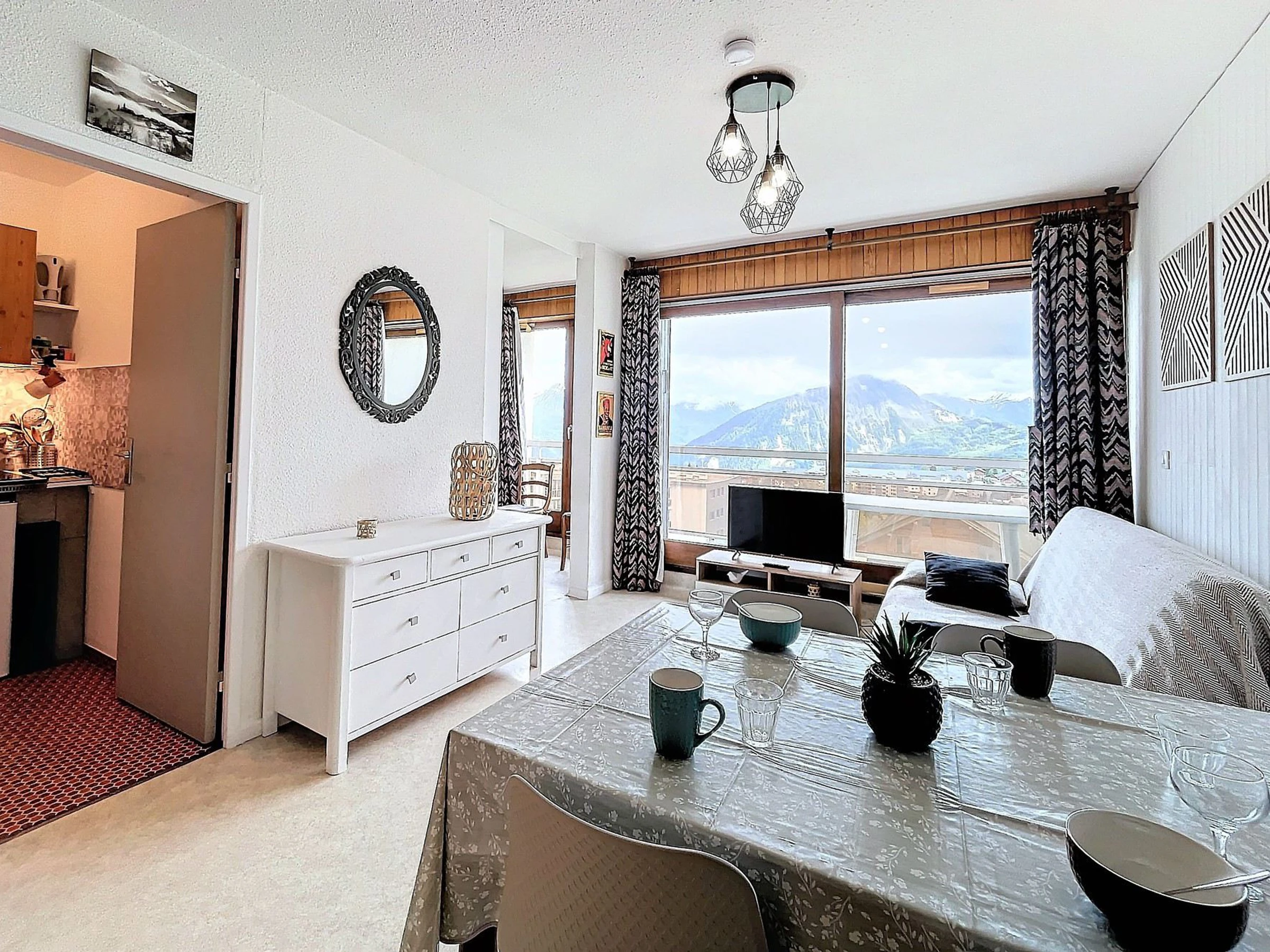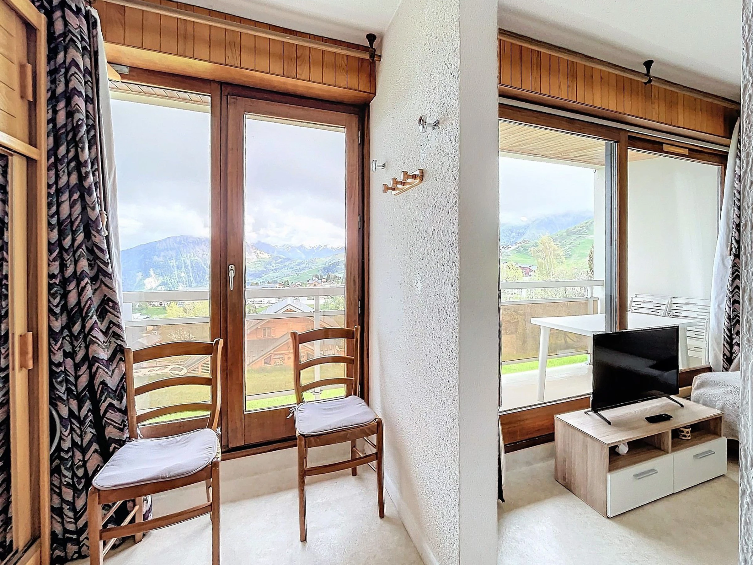 Un séjour agréable et bien décoré, au mobilier chaleureux avec 1 canapé lit clic clac en 130X190 pour 1 personne, une télévision écran plat, et un bon lit rabattable en 140X190 pour 2 personnes. La pièce ouvre sur un large balcon doté d'une table et de chaises, avec vue imprenable sur la station de La Toussuire.
