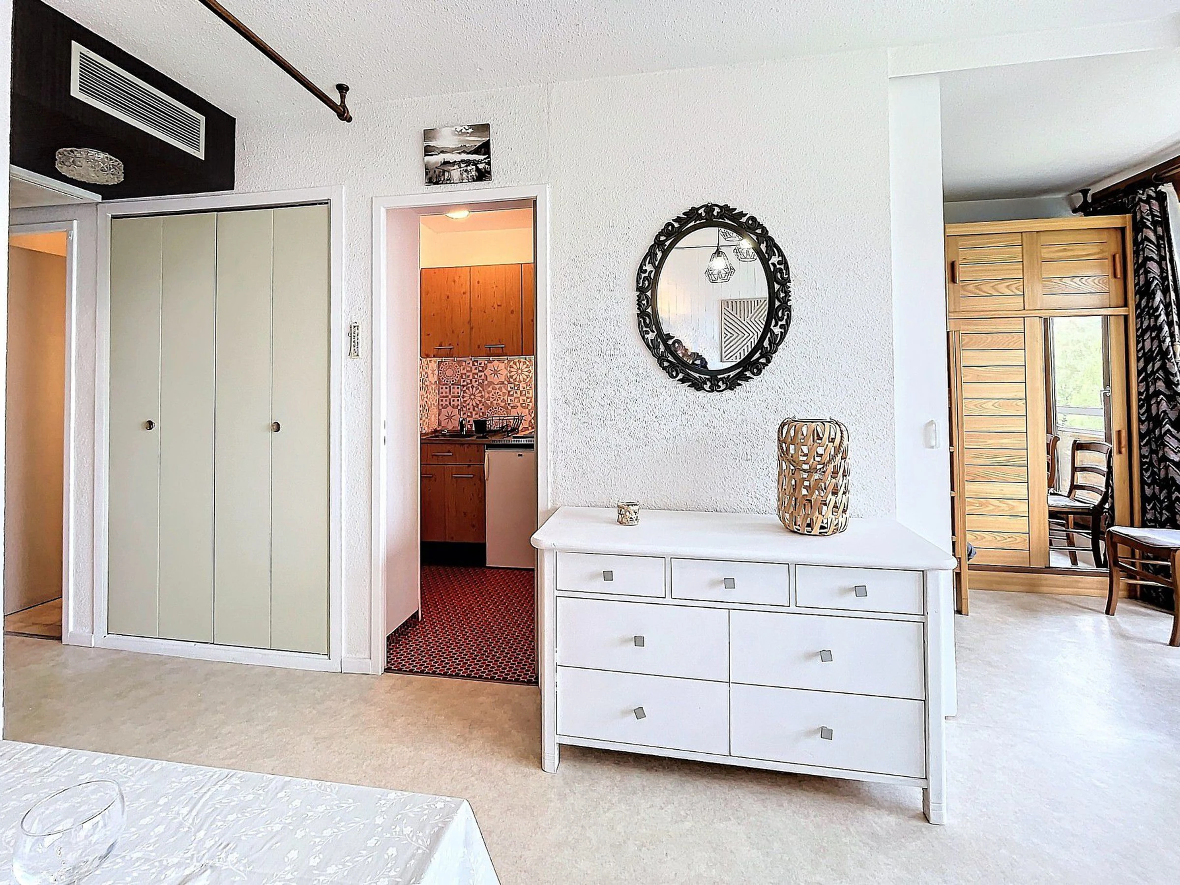 Le coin cuisine est séparé, équipé de 2 plaques vitro, frigo top, cafetière à dosette SENSEO®, d'un mini four, d'un micro-ondes, une bouilloire, appareil à raclette et à croque-monsieur....