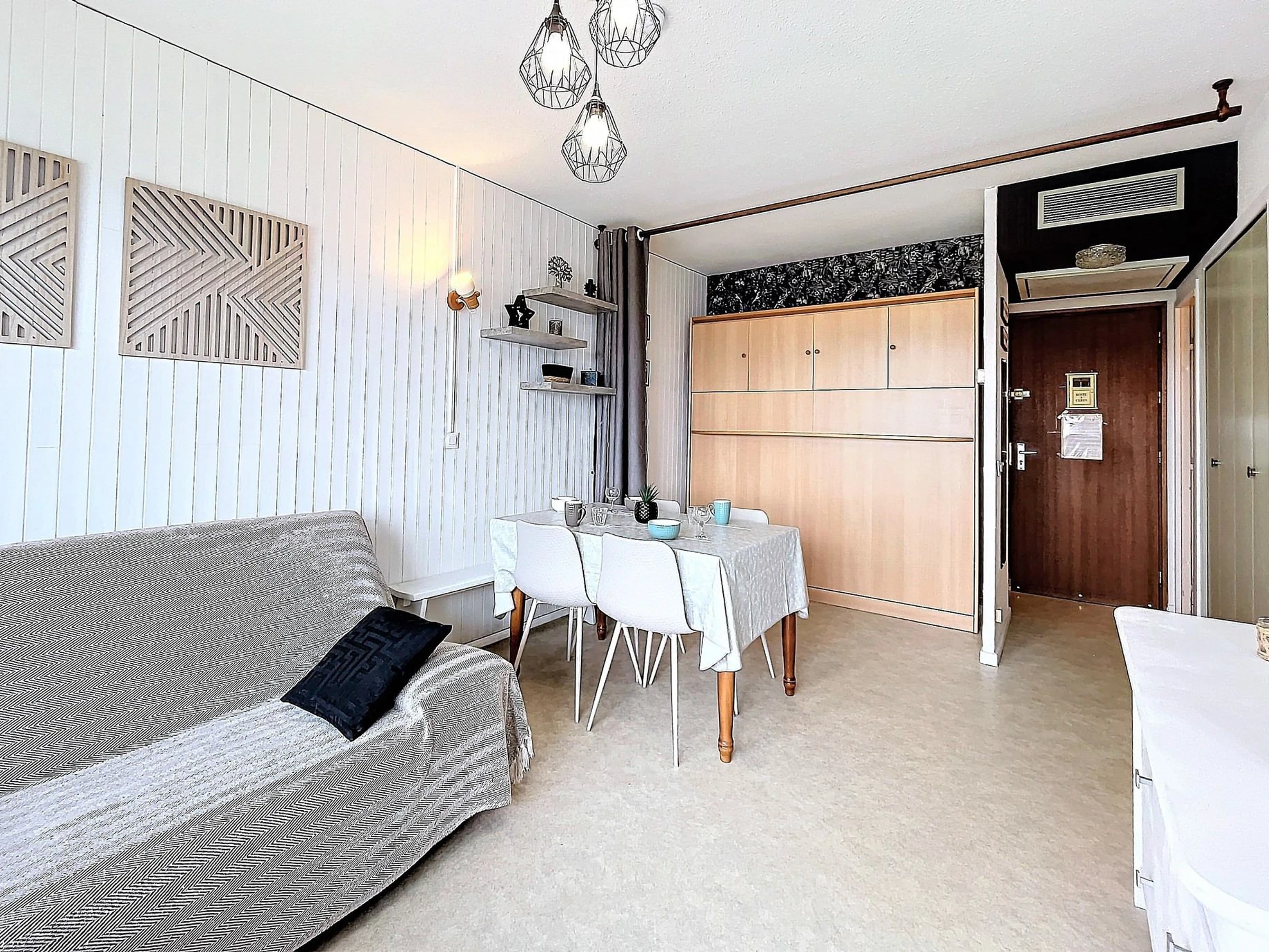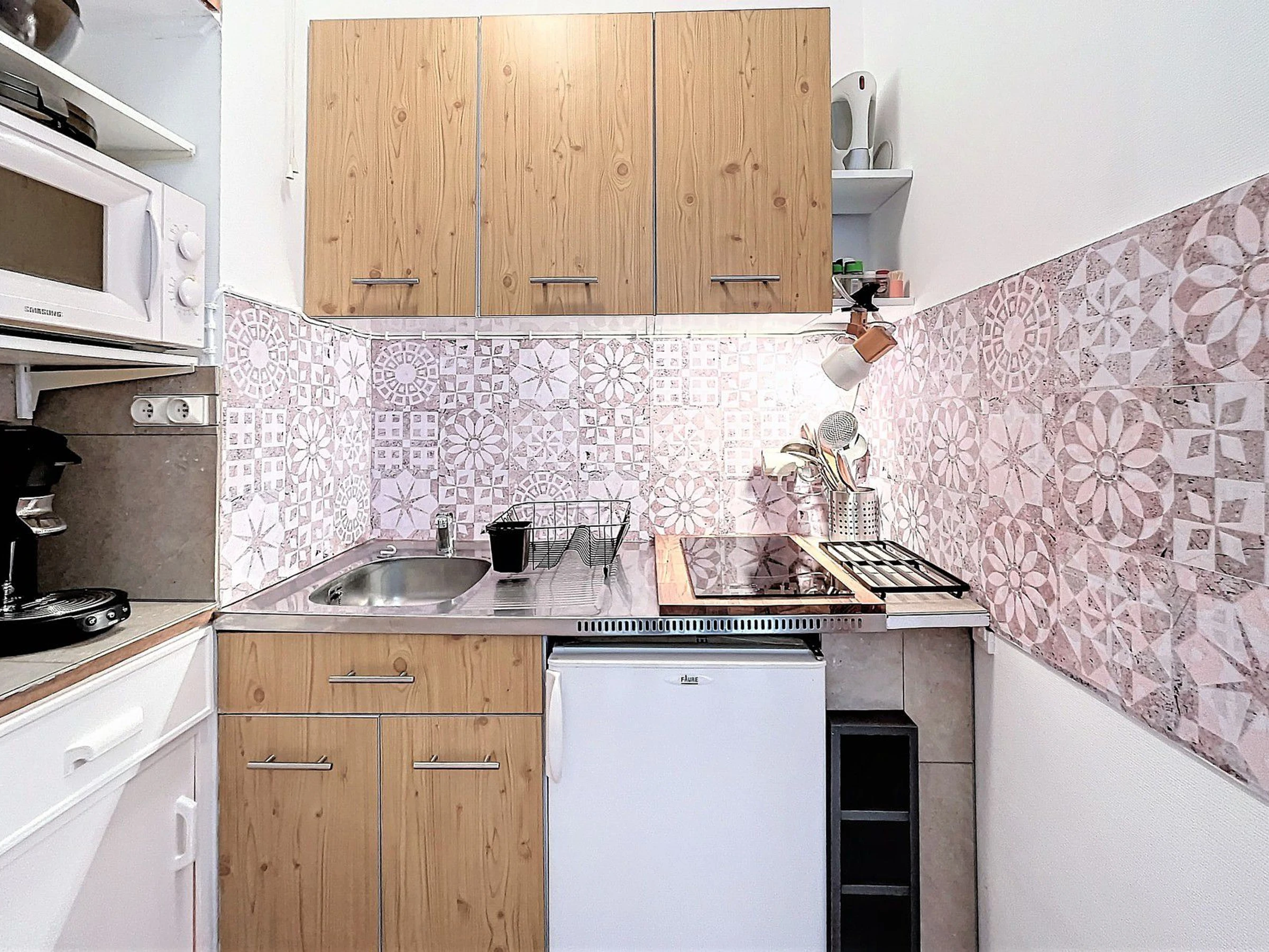 Deux pièces bien équipé et cosy, comprenant une entrée, une salle de douche (sèche-cheveux à disposition) et des toilettes séparées.