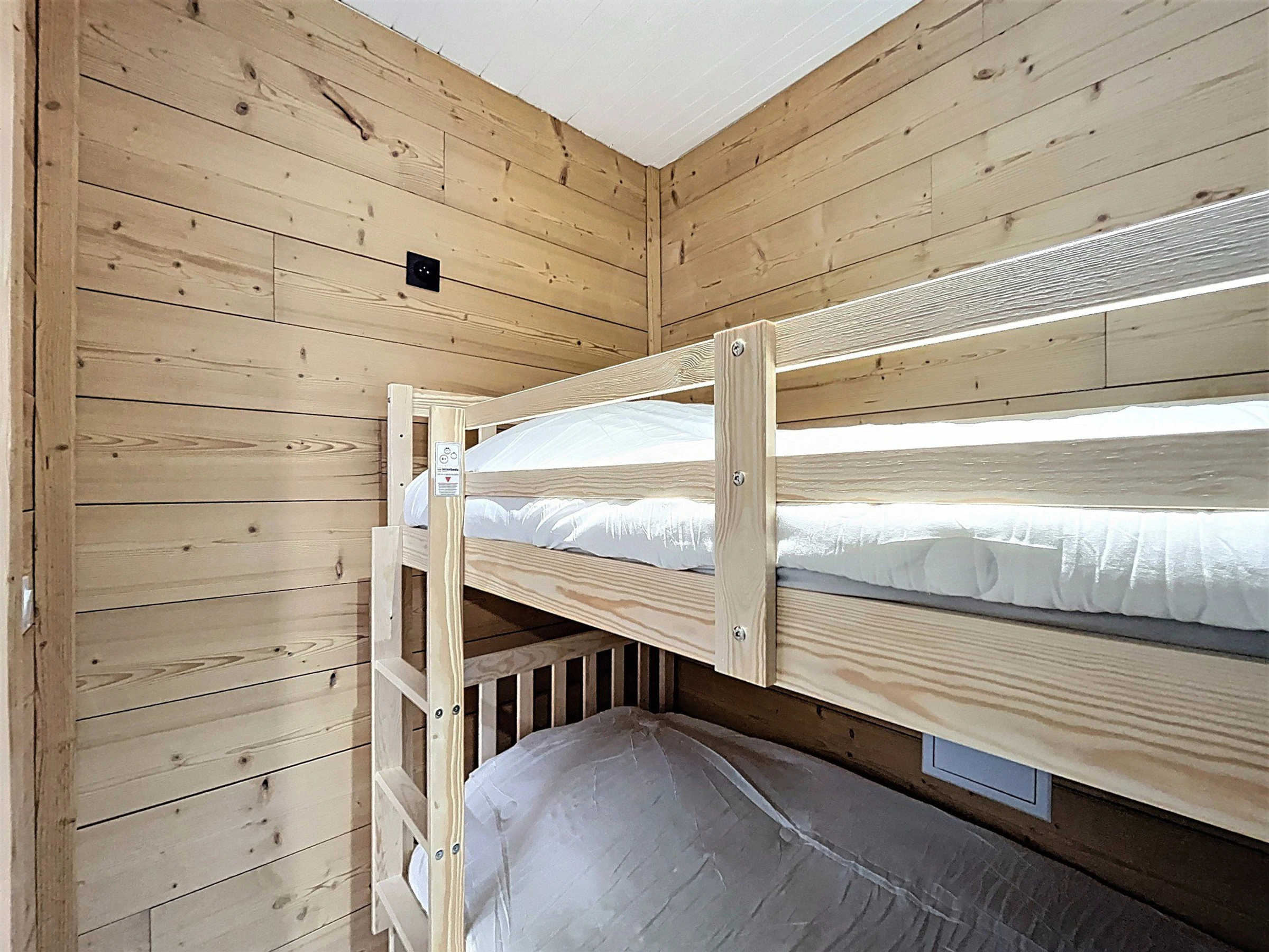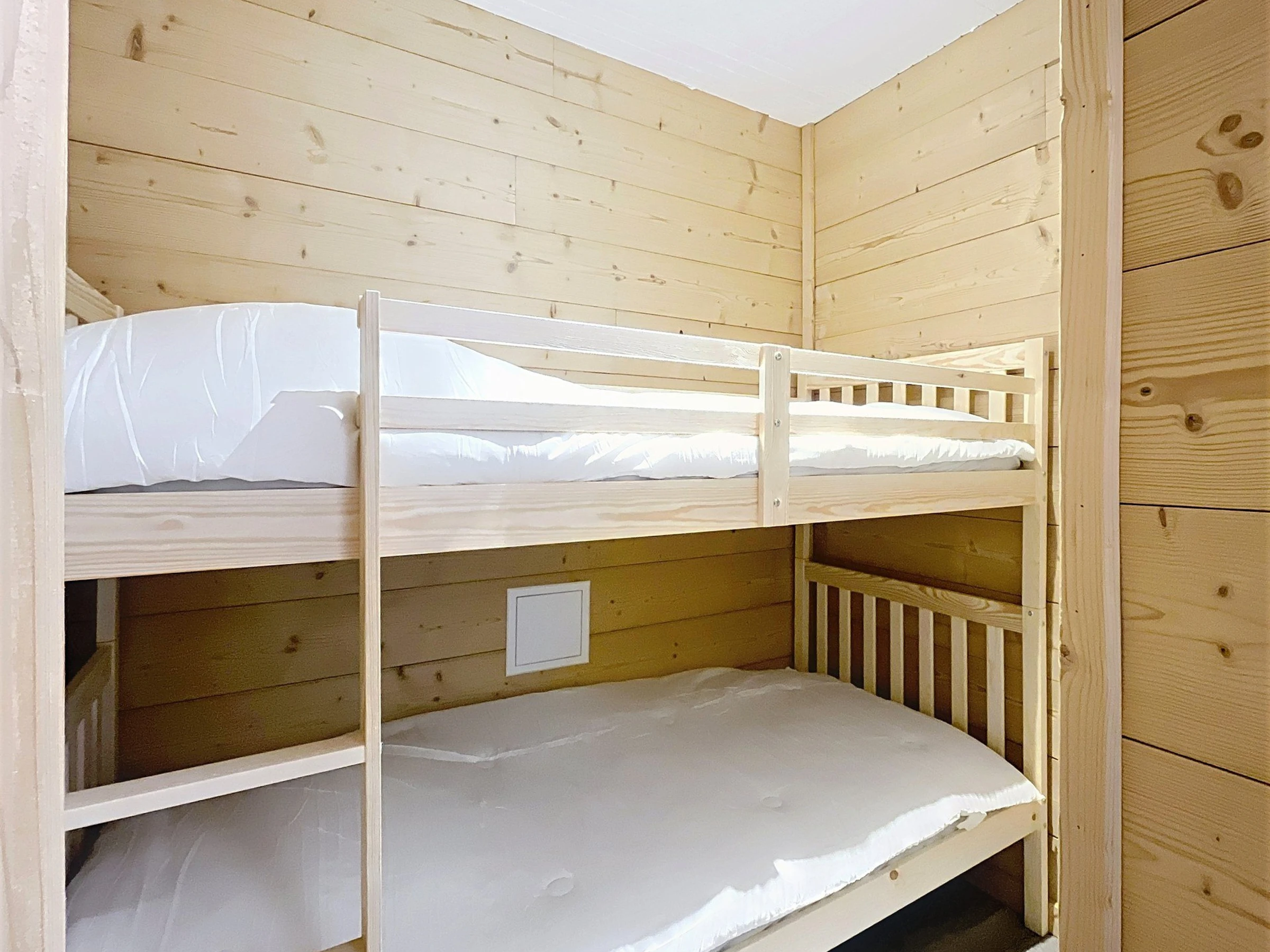 • D’une alcôve avec 2 lits superposés, séparée du séjour par un rideau.