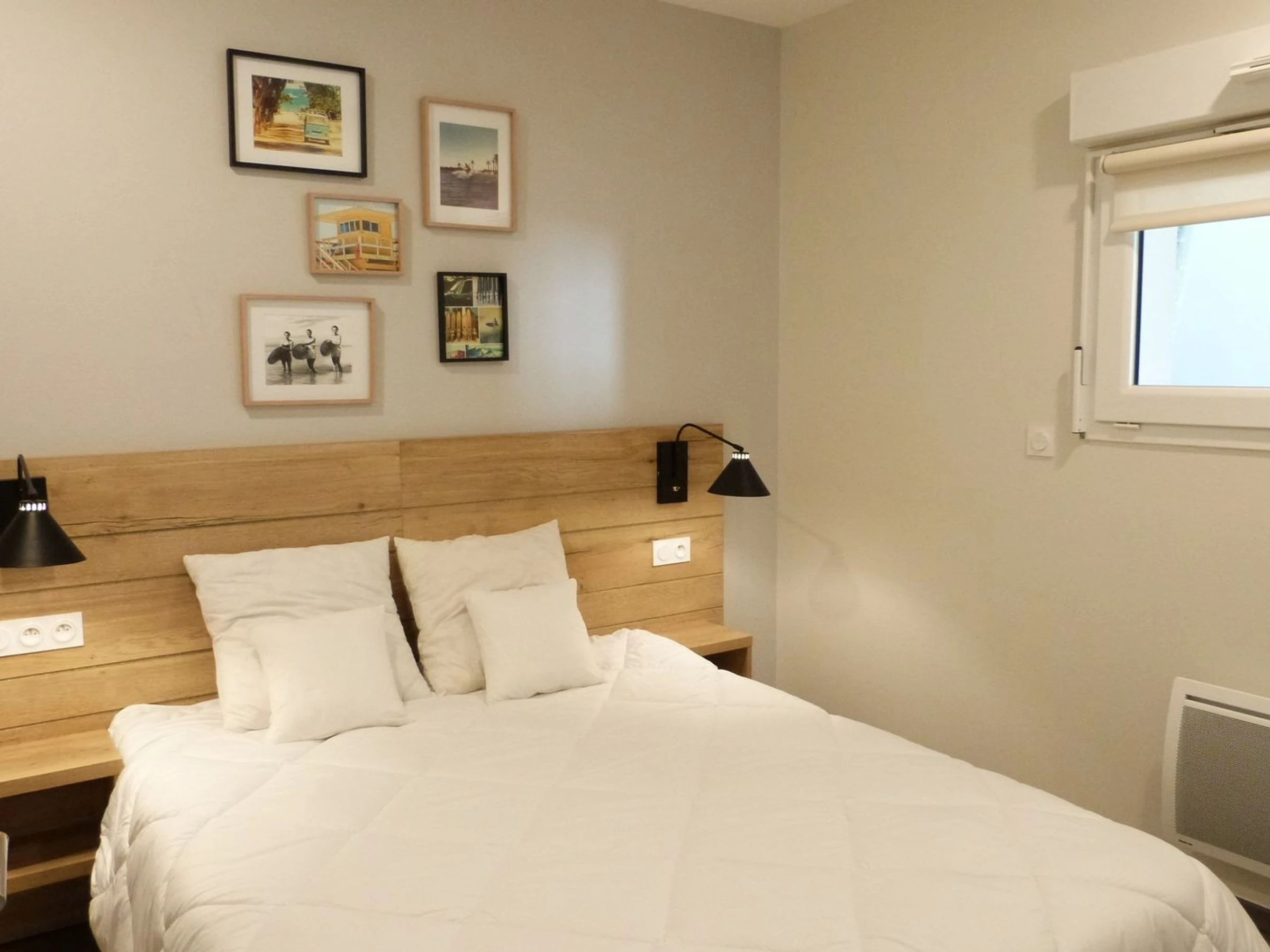 Il se compose d'une entrée, d'une pièce de vie avec cuisine aménagée et équipée ouverte sur le salon avec tv écran plat, d'une chambre avec 1 lit double en 160 et dressing, d'une seconde chambre avec 2 lits simples de 80 pouvant se rapprocher et dressing, d'une salle d'eau avec douche à l'italienne et d'un wc indépendant. Vous profiterez également d'une belle terrasse de 16m2 avec mobilier et salon de jardin, donnant sur le jardin de la résidence, face à la piscine.