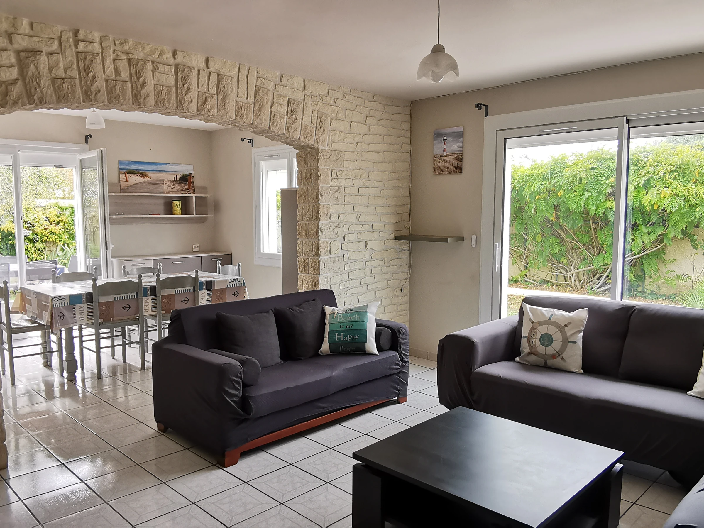 Cette villa indépendante de 150m² située à 600m de la plage Clémenceau et 500m des commerces se compose, au rez de chaussée, d'un salon/séjour de 35m² avec canapé, télévision écran plat, poêle à bois et table, une cuisine ouverte et aménagée avec plaque vitrocéramique, réfrigérateur/congélateur, micro-ondes, lave-vaisselle et hotte ; WC séparés, un cellier avec lave-linge, salle d'eau avec douche à l'italienne, lavabo et sèche serviettes. Une première chambre avec un lit de 160 et un grand dressing. Au premier étage, une seconde chambre avec 1 lit de 140 et un placard, une troisième chambre avec un lit de 90 et placard et une quatrième chambre avec 2 lits de 90 et placard ; également une salle d'eau avec baignoire, lavabo et sèche-serviettes, WC séparés. à l'extérieur, un grand jardin arboré avec du mobilier de terrasse et des places de parking sur terrain clos. Les animaux sont admis dans la maison. Logement non fumeur et disposant d'une box wifi avec accès internet.