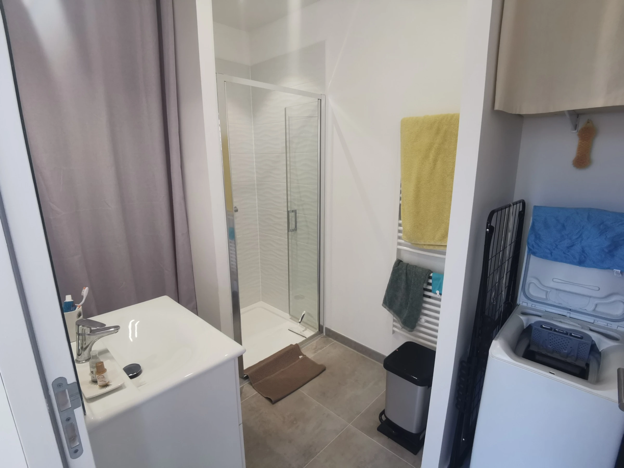 Salle d'eau avec douche, lavabo et machine à laver,