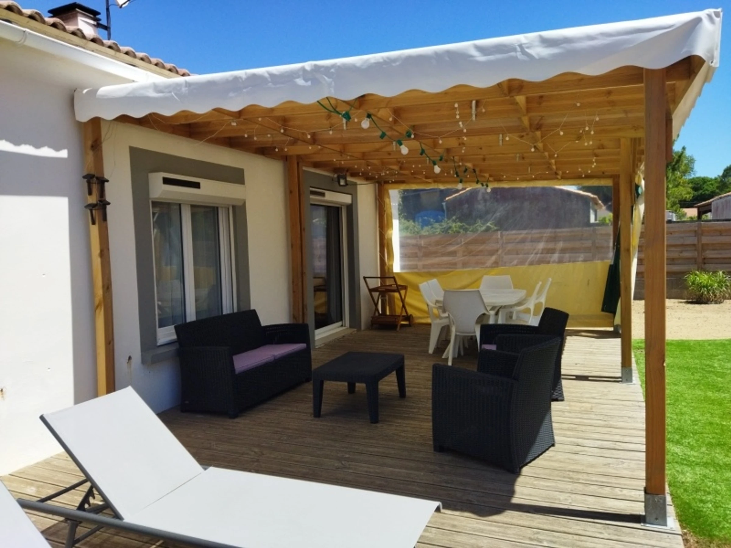 Jardin clos, terrasse avec mobilier de jardin, barbecue et pergola,