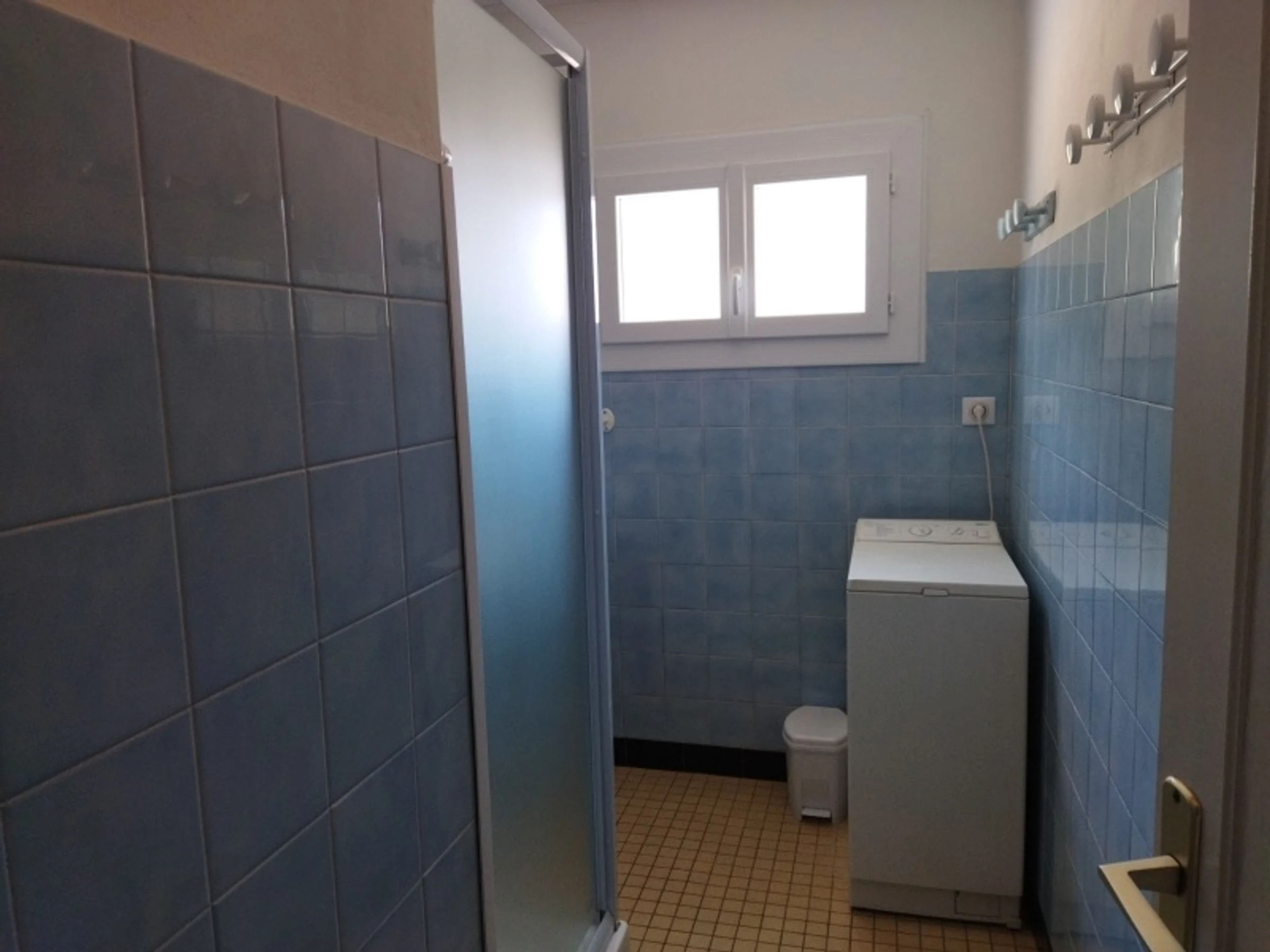 Une salle d'eau avec douche et lavabo, lave-linge,