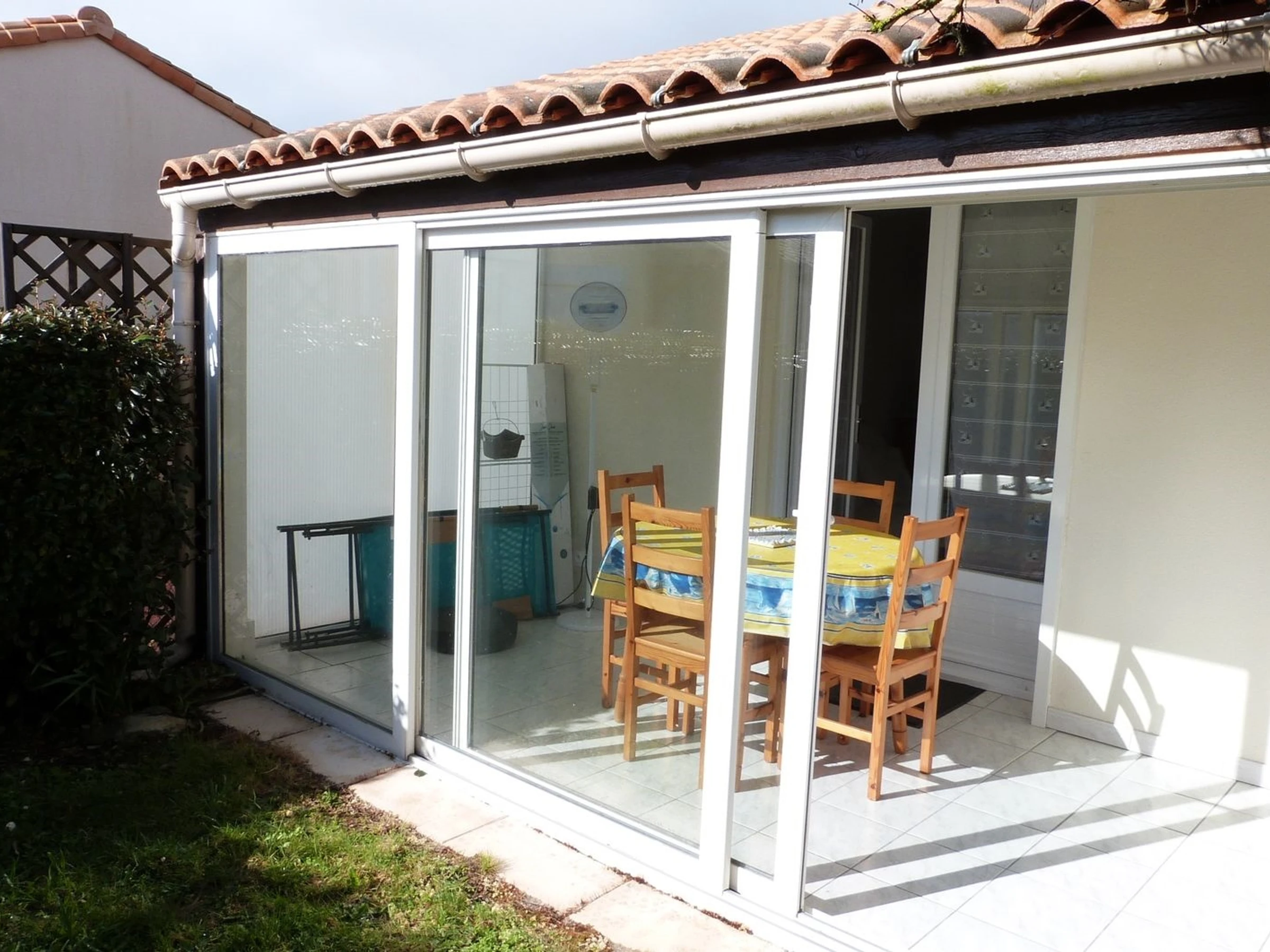 Véranda avec mobilier de repas,