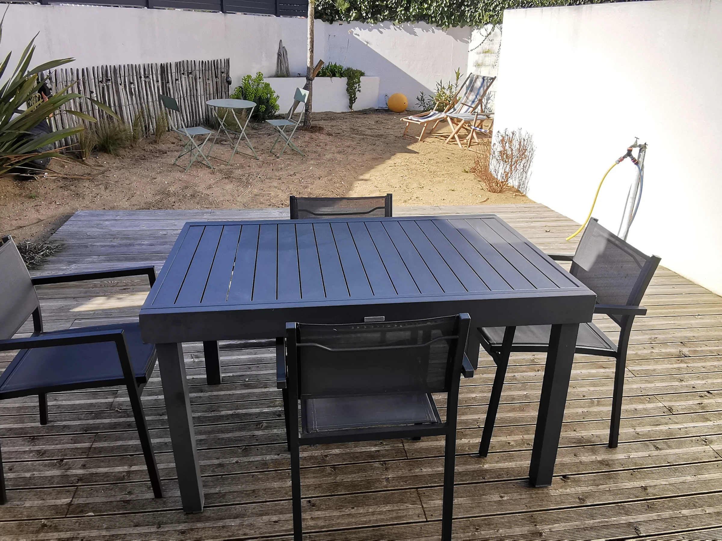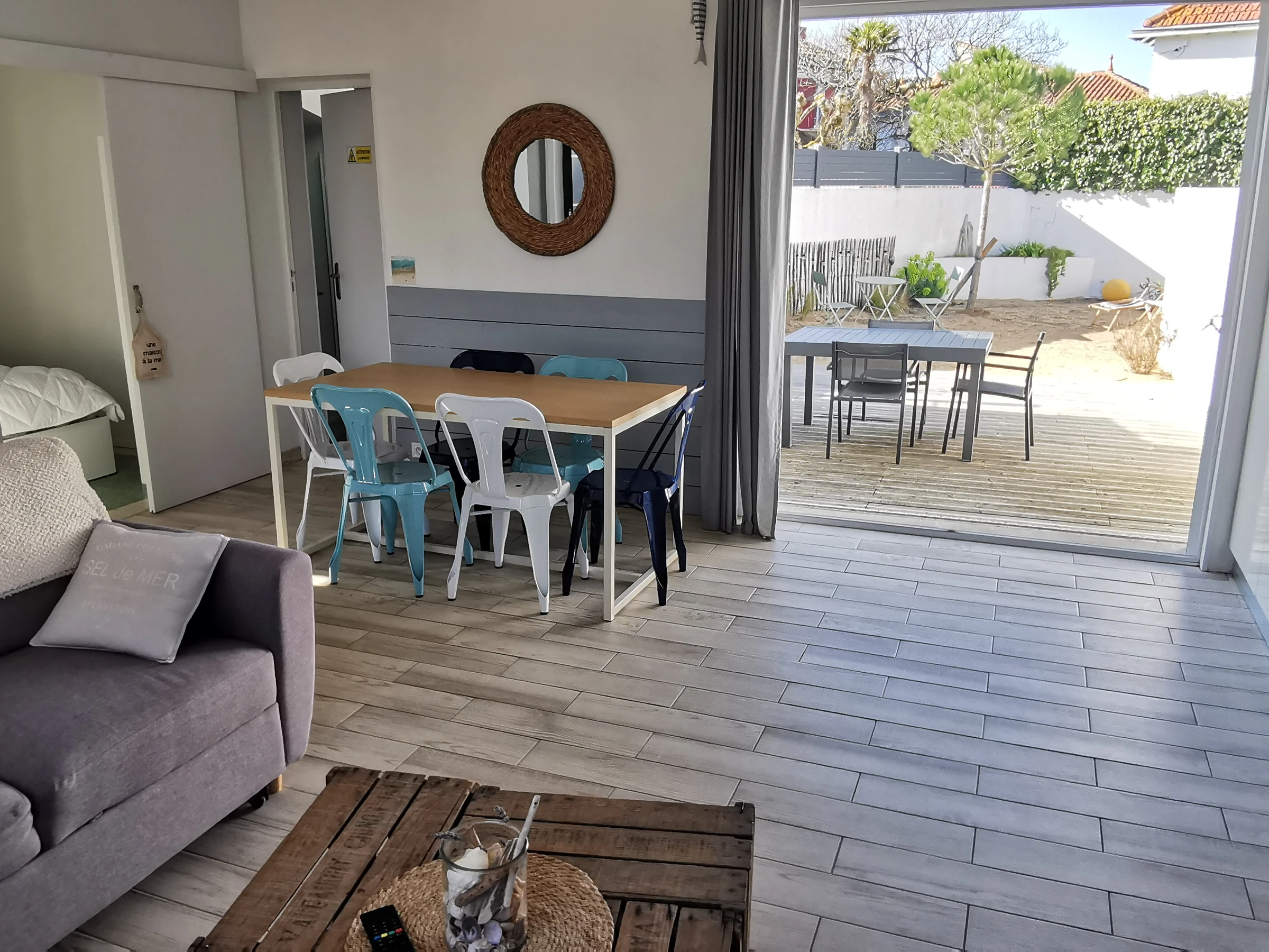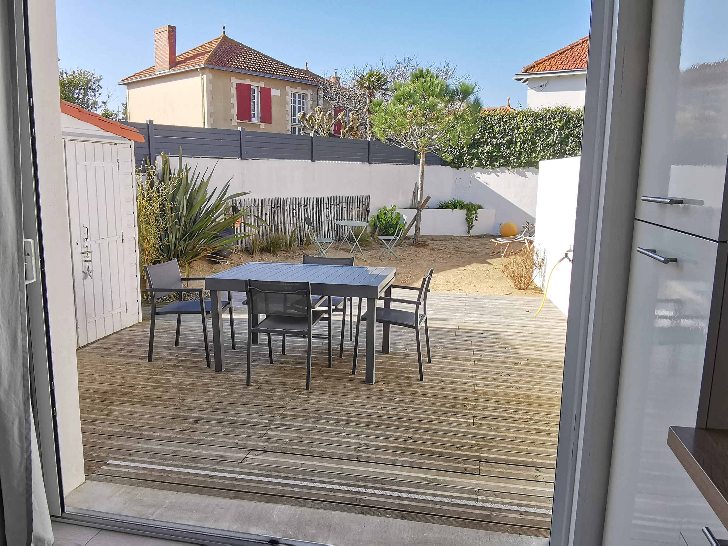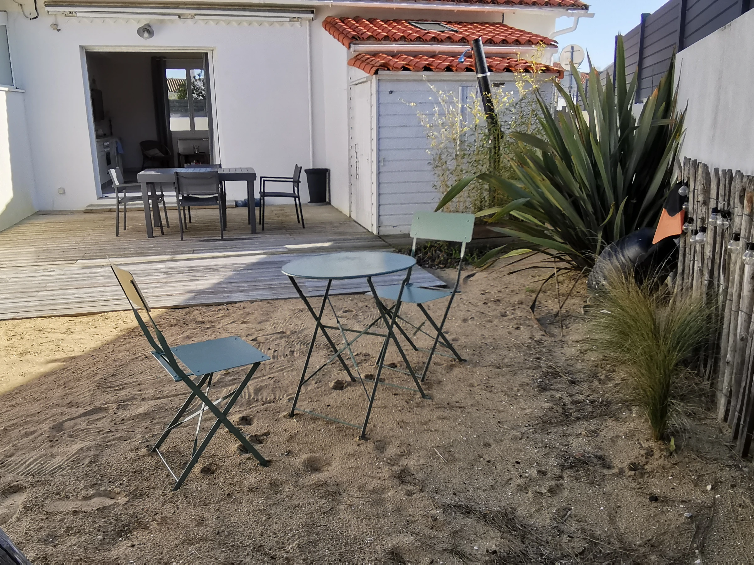 Cuisine ouverte et équipée (lave-vaisselle; four; micro-ondes) sur salon/séjour avec canapé,télévision, table pour 6 personnes. Une première chambre avec deux lits de 70 pouvant faire un lit de 140 et une deuxième chambre avec un lit en 140. Salle d'eau avec douche, lavabo, machine à laver et WC. à l'extérieur : une première courette exposée sud et à l'arrière de la maison, un jardin clos avec salon et mobilier de jardin, store banne, petit cabanon en bois à disposition, place de parking privative à côté de la maison. Espace entièrement sécurisé. Équipement bébé à disposition. Animaux admis sous conditions.